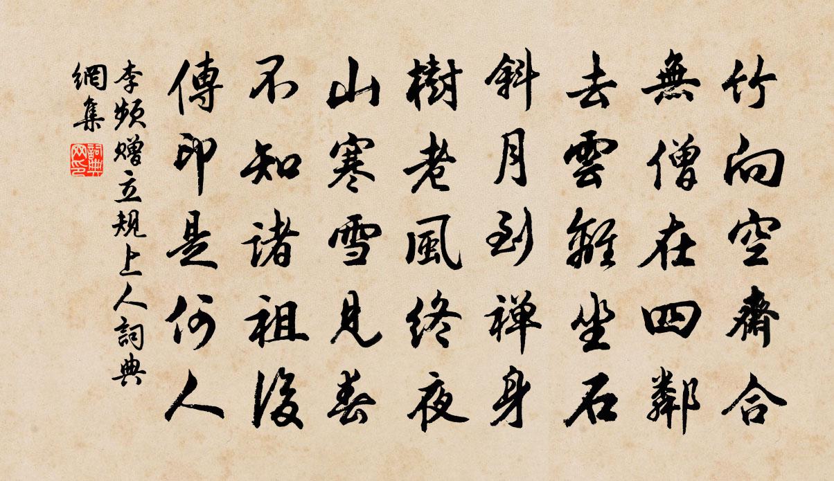 詩詞名句歷史字典書法欣賞書法字典國語詞典說文解字康熙字典古漢語字典標 題 作 者 詩 句 贈立規上人作者:李頻 朝代:唐代贈立規上人原文竹向空齋合,無僧在四鄰。去雲離坐石,斜月到禪身。樹老風終夜,山寒雪見春。不知諸祖後,傳印是何人。詩詞問答問:贈立規上人的作者是誰?答:李頻問:贈立規上人寫於哪個朝代?答:唐代問:贈立規上人是什麼體裁?答:五律李頻贈立規上人書法欣賞贈立規上人書法作品注釋全唐詩:卷589-59詩詞推薦念奴嬌 九日,同府學諸君飲王氏園 以上西嚴張之翰〔元代〕二年重九,算都向、江北江南虛度。鴻雁來時秋最好,底用千愁萬緒。九朵青山,幾尖白塔,何限登臨處。今朝乘雪中酒熟,欲攜訪吳監,先寄此詩白居易〔唐代〕新雪對新酒,憶同傾一杯。自然須訪戴,不必待延枚。陳榻無辭解,袁門莫懶開。笙歌與談笑,隨事自將來。阮郎歸(茂叔兄□□生日)魏了翁〔宋代〕雲外群鴻逐稻粱。獨乘下澤少游鄉。赤心片片為人忙。俗事縈纏何日了,自身活計孰為長。閉門書卷聖賢香。游信州南岩晁補之〔宋代〕南岩夫何為,山作天倚蓋。山南豁山腹,飛頂覆其外。初如鵬將翔,膺擊群麓背。乍似海大魚,呀口噞而嘬。當空李長吉集趙庚夫〔宋代〕幾回掩卻又重看,吟罷心如著露蘭。欲上玉樓窺老筆,虬龍擁處雪霜寒。土木偶人邵雍〔宋代〕土木偶人,慎無相笑。天將大雨,止可相吊。鷓鴣天 次姜御史韻魏初〔元代〕雨過雞窗覺夢清。文書一束五更燈。愁於飢鵠痴於鶴,閒愛孤雲靜愛僧。人似月,酒如澠。幾時別墅醉秋燈。高情四時田園雜興十二絕范成大〔宋代〕步履尋春有好懷,雨余蹄道水如杯。隨人黃犬攙前去,走到溪邊忽自回。石橋張景脩〔宋代〕天與晴來抵萬金,更逢詩伯共登臨。輟公一夜楞嚴講,慰我十年方廣心。白雪陽春雖寡和,高山流水有知音。石橋送道友釋道謙〔宋代〕二三尺雪山藏路,一兩點花春到梅。將此贈君持不去,請君收拾早歸來。減字木蘭花張孝祥〔宋代〕愛而不見。立馬章台空便面。想像娉婷。只恐丹青畫不成。詩人老去。恰要鶯鶯相伴住。試與平章。歲晚教人枉斷送曹輔赴閩漕蘇軾〔宋代〕曹子本儒俠,筆勢翻濤瀾。往來戎馬間,邊風裂儒冠。詩成橫槊里,楯墨何曾乾。一旦事遠遊,紅塵隔岩灘。平生東陽澗陳岩〔宋代〕澗平如划水流遲,湛碧溶溶可染衣。白石欄邊人不到,日明風細一鷗飛。立夏明日行園無客五首方回〔宋代〕春來何啻酒千瓶,百日醺醺一日醒。朱筆點詩垂欲困,黃鸝啼樹急須聽。沾沙不濕收微雨,倚柱無言立小亭。芒屨簡耕月張煒〔宋代〕一犁將暝色,月下自耕耘。為適能吟趣,非乾力穡勤。草芟心地闊,苗揠世情分。莘野如膺詔,新詩就獻君。偈頌八十五首釋妙倫〔宋代〕禪不用參,道不用學。放下更放下,安樂又安樂。騎鯨橋張鎡〔宋代〕池港開門就作橋,朱欄相望壓鯨腰。風搖慢折游溶綠,波底何妨著霽霄。依韻和仲源暮冬見寄梅堯臣〔宋代〕曾未學黃庭,衰顏已可驚。詩能如阮籍,評不愧鍾嶸。玉軫調初美,冰壺想更清。兔園風雪甚,還聽鴈來聲。小圃梅柳之爭柳與梅爭王義山〔宋代〕梅兄住在水之濱,五柳先生便有雲。傳語林逋須著讓,堤邊風景要平分。寄懷林景熙〔宋代〕風雨知何夕,干戈寄此身。青燈少年夢,白髮異鄉春。水驛逢花使,丹田守穀神。行窩隨處樂,聊自得吾真。名句推薦大道如青天,我獨不得出。李白《行路難三首》 來時父母知隔生,重著衣裳如送死。王建《渡遼水》 不用訴離觴,痛飲從來別有腸。蘇軾《南鄉子·和楊元素時移守密州》 自春來、慘綠愁紅,芳心是事可可。柳永《定風波·自春來》 畫船撐入花深處,香泛金卮。歐陽修《採桑子·荷花開後西湖好》 嶺水爭分路轉迷,桄榔椰葉暗蠻溪。李德裕《謫嶺南道中作》 越梅半拆輕寒里,冰清淡薄籠藍水。和凝《菩薩蠻·越梅半拆輕寒里》 軍合力不齊,躊躇而雁行。曹操《蒿里行》 鷙鳥將擊,卑飛斂翼;猛獸將搏,弭耳俯伏;聖人將動,必有愚色。姜子牙《六韜·武韜·發啟》 上言加餐食,下言長相憶。佚名《飲馬長城窟行》
