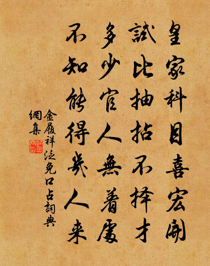詩詞名句歷史字典書法欣賞書法字典國語詞典說文解字康熙字典古漢語字典標 題 作 者 詩 句 泛免口占作者:金履祥 朝代:宋代泛免口占原文皇家科目喜宏開,試比抽拈不擇才。多少官人無著處,不知能得幾人來。詩詞問答問:泛免口占的作者是誰?答:金履祥問:泛免口占寫於哪個朝代?答:宋代金履祥泛免口占書法欣賞泛免口占書法作品詩詞推薦方春時群免食麥先生置罝焉終無所獲今者原頭王洋〔宋代〕吳山積雪不潤麥,客子思鄉疑卜宅。先生好客如聚書,豈料向來遭五厄。{左夋右兔}{左夋右兔}自是安無虞,和楊公維二首廖行之〔宋代〕子云家無儋石儲,日有載酒過門閭。道豐澤衍今甫大,天理報施寧欺予。我慚投李得珍貺,俗眼快翫真璠璵。何當舶使王會溪太守趙見泰九日領客枉顧山中賦采蒲壽宬〔宋代〕百年豈非長,流光迅飛電。月渚愁濱鴻,風檐淒去燕。鴻燕胡獨乖,參辰豈相見。念此霜中英,良時不妨殿。尋餘姚上林湖山謝景初〔宋代〕山水有奇秀,何必耳目親。茲地世未知,仙遊良可珍。平湖瞰其中,翠巘圍四垠。青松千萬植,落瀑如懸巾。佛廟卜運算元(嘉定癸酉二月雨後到雙溪)王炎〔宋代〕渡口喚遍舟,雨後青綃皺。輕暖相重護病軀,料峭還寒透。老大自傷春,非為花枝瘦。那得心情似少年,雙燕歸時梅花喜神譜就實六枝宋伯仁〔宋代〕東門風飄飄,雙佩清如水。出門相送人,胡不共知止。次韻陳茲明五絕句史彌寧〔宋代〕買得湖陰數頃秋,斬新窗戶府清流。了無俗子溷人意,況有清尊澆客愁。採桑子和凝〔唐代〕蝤蠐領上訶梨子,繡帶雙垂。椒戶閒時,競學樗蒲賭荔枝。叢頭鞋子紅編細,裙□[1]金絲。無事□[2]眉,用韻謝帥機惠春盤吳泳〔宋代〕梅柳陰中漫寄家,閒如翠鴇立晴沙。癭藤缸內抄松子,行玉盤中揀蕨芽。猶有鄉風餐白啖,更無春夢草黃麻。郊行臨江仙·寒柳陳維崧〔清代〕自別西風憔悴甚,凍雲流水平橋。並無黃葉伴飄飄。亂鴉三四點,愁坐話無憀。雲壓西村茅舍重,怕他榾柮同燒。侍宴韓偓〔唐代〕蜂黃蝶粉兩依依,狎宴臨春日正遲。密旨不教江令醉,麗華微笑認皇慈。次韻蘇必強見寄李新〔宋代〕不積暗室鬼揶揄,曾入魚鳧伴蠹書。分背雁音清漢遠,動簾風竹故人疏。小桃煙老三年樹,白馬原空百兩車。消去秋堂弟自贛歸建安作別何文季〔宋代〕同飲西江甫兩春,匆匆馬首又東馳。歸與華閣春風裡,憶我鈴齋夜雨時。好把汗青傳久遠,莫將朱紫裹愚痴。閩中虞美人(詠荼蘼)馮時行〔宋代〕東君已了韶華媚。未快芳菲意。臨居傾倒向荼。十萬寶珠瓔珞、帶風垂。合歡翠玉新呈瑞。十日傍邊醉。今年花好蜀公范景仁忠文公輓辭四首蘇頌〔宋代〕雅麗文園令,深湛揚大夫。初為蜀詞客,終作漢真儒。榮遇封公爵,歸休職禁塗。逢時致君事。自與二賢殊。贈江西詩客吳晦之〔宋代〕五言詩作七寶塔,四壁惟餘八尺床。一月二十九日醉,百年三萬六千場。旅中葉茵〔宋代〕節序幾循環,重來秋又殘。霜晴和酒熟,風冷袷衣單。未羨千鍾祿,寧求一枕安。白髮逢歲稔,憂國素心寬。九華山謠王季文〔唐代〕九華崢嶸占南陸,蓮花擢本山半腹。翠屏橫截萬里天,瀑水落深千丈玉。雲梯石磴入杳冥,俯看四極如中庭。丹崖三月十一日不出張九成〔宋代〕老罷慵人事,柴門盡日扃。春江入幽想,夜雨漲前汀。何日當晴霽,西山雲眇冥。江頭無限好,見說柳深青。夜歸塼街巷書事陸游〔宋代〕近坊燈火如晝明,十里東風吹市聲;遠坊寂寂門盡閉,只有煙月無人行。誰家小樓歌惱儂?餘響縹緲縈簾櫳。苦心名句推薦田夫荷鋤至,相見語依依。王維《渭川田家》 衝波突出人齊譀,躍浪爭先鳥退飛。盧肇《競渡詩 / 及第後江寧觀競渡寄袁州剌史成應元》 去歲江南見雪時,月底梅花發。張孝祥《卜運算元·雪月最相宜》 西門秦氏女,秀色如瓊花。李白《秦女休行》 便做無情,莫也愁人苦朱淑真《蝶戀花·送春》 兩刃相割,利鈍乃知;二論相訂,是非乃見。王充《論衡·卷二十九·案書篇》 簾外雨潺潺,春意闌珊。李煜《浪淘沙令·簾外雨潺潺》 露下旗濛濛,寒金鳴夜刻。李賀《塞下曲》 怪人不知理,知理不怪人。佚名《增廣賢文·下集》 牆倒眾人推。曹雪芹《紅樓夢·第五十五回》