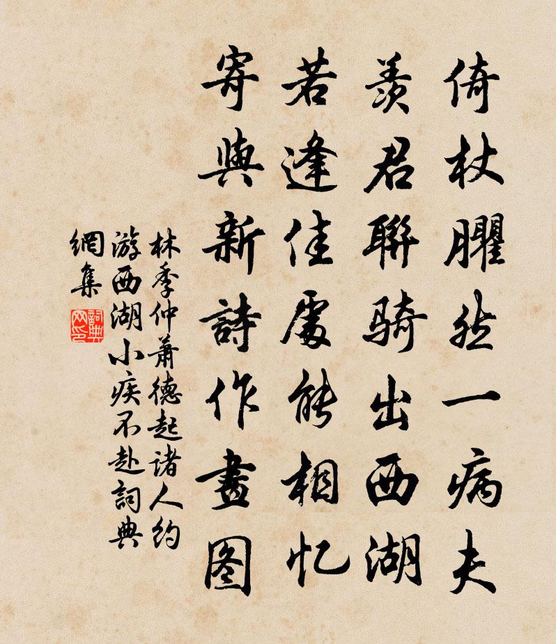 詩詞名句歷史字典書法欣賞書法字典國語詞典說文解字康熙字典古漢語字典標 題 作 者 詩 句 蕭德起諸人約游西湖小疾不赴作者:林季仲 朝代:宋代原文倚杖臞然一病夫,羨君聯騎出西湖。若逢佳處能相憶,寄與新詩作畫圖。詩詞問答問:《蕭德起諸人約游西湖小疾不赴》的作者是誰?答:林季仲問:該詩寫於哪個朝代?答:宋代書法欣賞蕭德起諸人約游西湖小疾不赴書法作品詩詞推薦南軒小桃盛開皆言群花未發而此獨先之偶成短強至〔宋代〕紫萼紅英細細裝,新枝短短舊枝長。未經曉日誰言艷,可藉春風自有香。卻恐折殘妨把酒,若為遮住莫臨牆。關中自述劉過〔宋代〕精神凋耗鬢毛衰,劫火光中第幾回。無可奈何教老去,有時猛省忽愁來。師崇道學原非偽,客寄蘇州卻類獃。明日瑞鶴仙王吉昌〔元代〕煉丹成數究。進水火、抽添六陽時候。嚴嚴虎龍開,卷清風幣地,兩情精媾。雷轟宇宙。漬玉蕊、靈芝吐秀。待藥思方外友張椿齡〔宋代〕我聞仙人隱塵寰,帶索不整輕雲寒。練氣蕭蕭顏如丹,寫詩賦詠鏘琅玕。自言富貴無所待,一嘯萬古神情歡。嗟哉【正宮】小梁州_篷窗風急雨絲絲張可久〔元代〕篷窗風急雨絲絲,笑拈吟髭。淮陽西望路何之?鱗鴻至,把酒問篙師。【麼】迎頭便說兵戈事,風流再莫追思。塌次韻和岳醵飲西峰寺分韻成詩十四首見寄陳著〔宋代〕隨意提攜容易率,相約明朝更今日。太白盡可詩百篇,堯夫卻有四不出。約許侍郎諸公酒半宋正仲至自都城魏了翁〔宋代〕人生能得幾回別,一別公來四千日。我騎紫馬出行春,公指黃扉入當夕。誰知行止不關人,解後天涯復同席。方看獨游偶題邢恕〔宋代〕頹然一睡足,岩溜尚潺湲。面幾郎山郭,寂無人世喧。皇帝閣端午帖子詞宋庠〔宋代〕寶軫流薰唱,仙壺永瑞曦。欲知人厲息,天報艾生遲。蔣實齋出示孟浩然畫像因賦二絕陳鑒之〔宋代〕吟鞭遙指鹿門歸,水色山光件件詩。縮項鯿魚元自好,當年應悔識王維。鵲橋仙 壽胡紫山王惲〔元代〕秋香懸桂。光風轉蕙。掩盡尋常花卉。西城來往已風流,更點檢、生涯次第。堂名休逸。策扶流憩。占盡閒中風味寄王漢陽李白〔唐代〕南湖秋月白,王宰夜相邀。錦帳郎官醉,羅衣舞女嬌。笛聲喧沔鄂,歌曲上雲霄。別後空愁我,相思一水遙。倚薄黃公度〔宋代〕茅檐供倚薄,藜杖費扶攜。天入平蕪闊,山含宿靄低。樹聲風便旋,野色晚淒迷。容易營生事,秋田稻欲齊。偶題徐似道〔宋代〕老去功名不掛懷,高眠之外只清齋。偶因種竹便多事,風葉掃余還滿階。夢仙白居易〔唐代〕人有夢仙者,夢身升上清。坐乘一白鶴,前引雙紅旌。羽衣忽飄飄,玉鸞俄錚錚。半空直下視,人世塵冥冥。漸失書壁張耒〔宋代〕後院人稀到,荒池半是苔。好花隨地有,幽鳥自山來。靡靡香草合,陰陰夏木催。昭亭有佳色,每至不容回。避地越中作韋莊〔唐代〕避世移家遠,天涯歲已周。豈知今夜月,還是去年愁。露果珠瀋水,風螢燭上樓。傷心潘騎省,華發不禁秋。惜筍二首劉克莊〔宋代〕主人尤愛竹,老病鮮窺園。粟鼠競攜子,籜龍空長孫。化為玉版去,留得錦繃存。雖有監臨者,貪眠晝閉門。賦得春風扇微和豆盧榮〔唐代〕春晴生縹緲,軟吹和初遍。池影動淵淪,山容發蔥蒨。遲遲入綺閣,習習流芳甸。樹杪颺鶯啼,階前落花片。韶光宿李樞書齋周賀〔唐代〕小齋經暮雨,四面絕纖埃。眠客聞風覺,飛蟲入燭來。夜涼書讀遍,月正戶全開。住遠稀相見,留連宿始回。名句推薦秋來愁更深,黛拂雙蛾淺楊無咎《生查子·秋來愁更深》 野戰格鬥死,敗馬號鳴向天悲。李白《戰城南》 昨日屋頭堪炙手,今朝門外好張羅白居易《放言五首·其四》 啜苦咽甘,茶也。陸羽《茶經·五之煮》 身有傷,貽親憂。德有傷,貽親羞。李毓秀《弟子規·入則孝》 酒醒人靜奈愁濃。殘燈孤枕夢,輕浪五更風。徐昌圖《臨江仙·飲散離亭西去》 留戀海棠顏色、過清明。張輯《南歌子·柳戶朝雲濕》 春朝物候妍,愁婦鏡台前。鄭愔《春怨》 雨窗和淚搖湘管。意長箋短。許棐《後庭花·一春不識西湖面》 薊庭蕭瑟故人稀,何處登高且送歸。王之渙《九日送別》