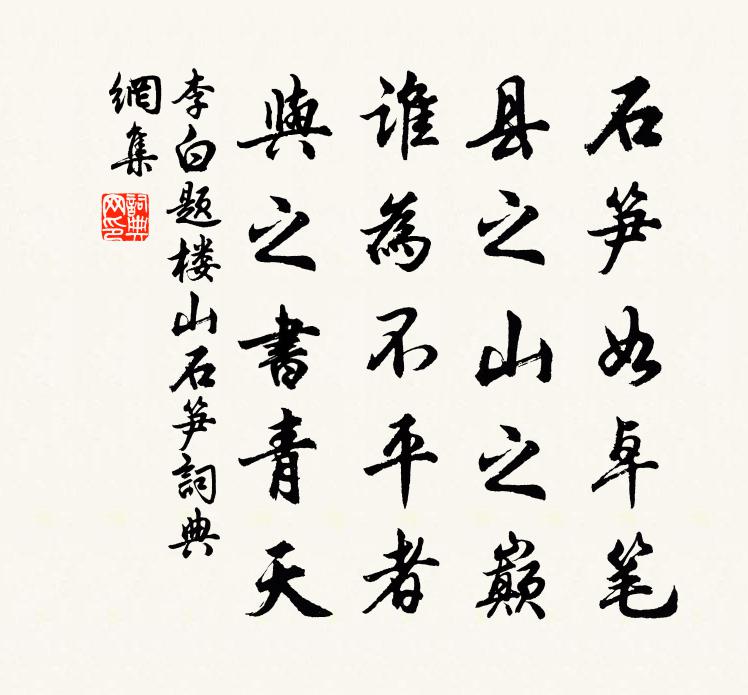 詩詞名句歷史字典書法欣賞書法字典國語詞典說文解字康熙字典古漢語字典標 題 作 者 詩 句 題樓山石筍作者:李白 朝代:唐代題樓山石筍原文石筍如卓筆,縣之山之巔。誰為不平者,與之書青天。詩詞問答問:題樓山石筍的作者是誰?答:李白問:題樓山石筍寫於哪個朝代?答:唐代問:李白的名句有哪些?答:李白名句大全李白題樓山石筍書法欣賞題樓山石筍書法作品詩詞推薦送傑老住仙遊唐士恥〔宋代〕白雲每亭亭,其出亦何心。賢侯考之天,無謂由蹄涔。送內弟袁德師竇群〔唐代〕南渡登舟即水仙,西垣有客思悠然。因君相問為官意,不賣毗陵負郭田。奉和裴令公新成綠野堂即書劉禹錫〔唐代〕藹藹鼎門外,澄澄洛水灣。堂皇臨綠野,坐臥看青山。位極卻忘貴,功成欲愛閒。官名司管籥,心術去機關。禁苑見湖南繡使陳益甫大著戴復古〔宋代〕手攬澄清轡,聲名漢范滂。一台振風采,列郡正權綱。衡岳勢增重,文星日有光。金門雖藐藐,玉節自堂堂。題楞伽寺李公山房藏書閣喻良能〔宋代〕小閣崢嶸在空谷,雲是先生讀書屋。不見善和數千卷,空聞鄴侯三萬軸。先生一去幾經年,山色依然為誰綠。只今秋江四絕滕岑〔宋代〕風色蕭蕭日色晴,晚潮未到水波平。系槎艇子關蓬睡,不管溪南喚渡聲。五祖贊釋道沖〔宋代〕萬本青鬆手自栽,老來無復強追陪。可憐溪畔周家女,也被渠儂脫賺來。贊睦州和尚釋曇華〔宋代〕稽首金容癩狗師,一生快活沒人知。平田淺草翻身處,合水和泥換步時。垂手未施三寸刃,破關先下頂門槌。寥寥五位頌釋慧暉〔宋代〕偏中正,寶月團團金殿冷。當明不犯暗抽身,回眸影轉西山頂。望江南(答徐守韻)洪适〔宋代〕嗟故歲,夏旱復秋陽。十雨五風皆定數,千方百計為災傷。小郡怎禁當。勞拊字,惠露洽丁黃。田舍炊煙常蔽野,富陽曉望楊萬里〔宋代〕江氛海霧暗前村,四望秋空一白雲。忽有數峰雲上出,好山何故摠無根。送衛王南征詩庾信〔南北朝〕望水初橫陣。移營寇未降。風塵馬足起。先暗廣陵江。盈川舊縣陸律〔宋代〕茲地舟行數,懷人思惘然。盈川經此日,流水自唐年。廢邑叢春草,荒山入暮煙。昔賢不可作,開笥讀遺編。孝賢皇后陵酹酒乾隆〔清代〕那能恝爾去,仍趁便而來。言念曾齊案,奚堪更酹杯!草猶逮春綠,松不是新栽。舊日玉成侶,依然身傍陪。三日侍鳳光殿曲水宴應制詩沈約〔南北朝〕光遲蕙畝。氣婉椒台。皇心愛矣。帝曰游哉。玉鸞徐騖。翠鳳輕回。別殿廣臨。離宮洞啟。川祇奉壽。河宗相禮。和致仕張尚書新創道院徐鉉〔唐代〕梓澤成新致,金丹有舊情。掛冠朝睡足,隱几暮江清。藥圃分輕綠,松窗起細聲。養高寧厭病,默坐對諸生。南柯子/南歌子黃庭堅〔宋代〕萬里滄江月,波清說向誰。頂門須更下金槌。只恐風驚草動、又生疑。金雁斜妝頰,青螺淺畫眉。庖丁有底下刀遲喜遷鶯·鳩雨細許棐〔宋代〕鳩雨細,燕風斜。春悄謝娘家。一重簾外即天涯。何必暮雲遮。 釧金寒,釵玉冷。薄醉欲成還醒。一春梳洗不簪題崔莊庵壁姚勉〔宋代〕碧潭見說有龍蟠,萬里滄溟氣欲吞。此去風雷轟蟄起,大施霖雨霈乾坤。旅行聞寇裴說〔唐代〕動步憂多事,將行問四鄰。深山不畏虎,當路卻防人。豪富田園廢,疲羸屋舍新。自慚為旅客,無計避煙塵。名句推薦此時相望不相聞,願逐月華流照君。張若虛《春江花月夜》 更被夕陽江岸上,斷腸煙柳一絲絲。韋莊《江外思鄉》 昨夜狂風度,吹折江頭樹李白《長干行二首》 紅葉滿寒溪,一路空山萬木齊。納蘭性德《南鄉子·秋暮村居》 脫衣換得商山酒,笑把離騷獨自傾。王禹偁《清明日獨酌》 石溪久住思端午,館驛樓前看發機。盧肇《競渡詩 / 及第後江寧觀競渡寄袁州剌史成應元》 君子有過行,小人嫉之不能容;君子無過行,小人嫉之亦不能容王永彬《圍爐夜話·第三三則》 謾道愁須殢酒,酒未醒、愁已先回秦觀《滿庭芳·碧水驚秋》 幽微靈秀地,無可奈何天。曹雪芹《紅樓夢·第五回》 得十良馬,不若得一伯樂;得十良劍,不若得一歐冶;得地千里,不若得一聖人。呂不韋《呂氏春秋·論·不苟論》