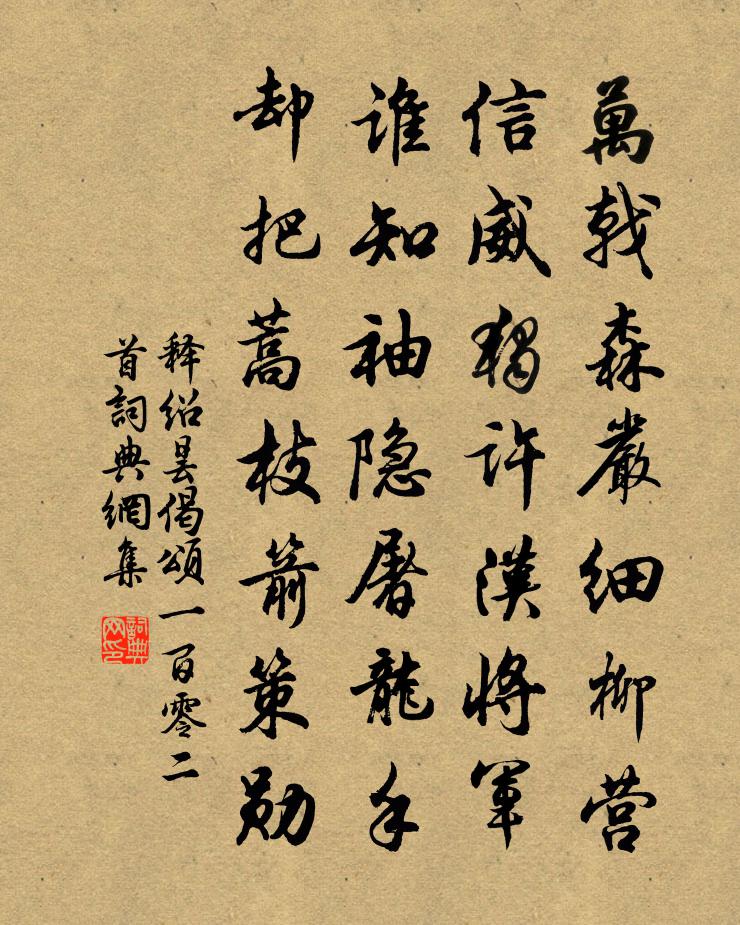 詩詞名句歷史字典書法欣賞書法字典國語詞典說文解字康熙字典古漢語字典標 題 作 者 詩 句 偈頌一百零二首作者:釋紹曇 朝代:宋代偈頌一百零二首原文萬戟森嚴細柳營,信威獨許漢將軍。誰知袖隱屠龍手,卻把蒿枝箭策勛。詩詞問答問:偈頌一百零二首的作者是誰?答:釋紹曇問:偈頌一百零二首寫於哪個朝代?答:宋代釋紹曇偈頌一百零二首書法欣賞偈頌一百零二首書法作品詩詞推薦夜坐釋行海〔宋代〕永夜青燈照獨吟,蕭蕭風雨遍山林。十年如此倦遊客,只恐梅花識此心。十月苦蠅陸游〔宋代〕十月江南未擁爐,痴蠅擾擾莫嫌渠。細看豈是堅牢物,付與清霜為掃除。元宵懷鄉二首董嗣杲〔宋代〕萬宇燈輝斂暗塵,幾年醉賞禁街春。良宵獨宿雙泉寺,負了吟風嘯月身。孝宗皇帝輓詞二首葉適〔宋代〕倫德加文景,雄才自武宣。道終遺萬乘,喪制盡三年。暫乞狂胡命,常持復漢權。全將一孝字,高謚百王前。題致政李子立問月台曾豐〔宋代〕主人詩豪寄於酒,萬象無非酒之友。主人酒豪寄於詩,萬象無非詩之題。若為詩酒興俱發,平時泛愛今一割。不問書光化軍寺壁釋秘演〔宋代〕萬家雲樹水邊州,千里秋風一錫游。晚渡無人過疏雨,亂峰寒翠入西樓。丙辰十月見梅同感其韻再賦陳淳〔宋代〕霜枝禿禿瘦,孤英自中鮮。出塵寒玉姿,熟視何清妍。端如仁者心,灑落萬物先。渾無一點累,表里俱徹然。夜意李復〔宋代〕山霧連城白,虛庭待月生。雨余秋葉潤,露重葛衣輕。陰壁鳴蟲澀,風枝宿鳥驚。淹留禾黍興,悵望故園情。惜分飛(吳氏館寄內童氏)陳著〔宋代〕築壘愁城書一紙。雁雁兒將不起。好去西風裡。到家分付眉顰底。落日闌乾羞獨倚。十里江山萬里。容易成憔悴。歲盡釋文珦〔宋代〕雲深路不通,獨處歲還窮。盡斷塵勞念,方成隱遁功。松疏斜漏日,竹勁老吟風。不是遺名者,何由到此中。寄題舒州宿松知縣戴在伯重新紫霄亭二首楊萬里〔宋代〕一代名臣張右丞,玉山頭作紫霄亭。如今再得戴安道,拈出舊時山色青。久不看鏡須之白者眾矣得數語寄成父兼示兒侄趙蕃〔宋代〕始白才二三,今白乃四五。蕭蕭十數莖,底用更縷數。年來悼亡悲,老至作詩苦。外形雖由中,不應遽如許。嘆息送冀州向團練蘇頌〔宋代〕河外諸藩北控胡,美君家世領魚書。舊傳將略名尤重,卻過親庭慶有餘。使節頻煩民未息,邊庭清晏候仍虛。惟宣太廟樂章皇帝盥洗乾安之曲周麟之〔宋代〕維皇齋精,鬷假於廟。觀盥之初,惟以潔告。衎承祖宗,恤祀昭孝。誠心有孚,介福斯報。和蕭秋屋韻文天祥〔宋代〕蘆花作雪照波流,黃葉聲中一半秋。明月嬋娟千里夢,扁舟汗漫五湖游。星辰活動驚歌笑,風露輕寒敵拍浮。贏得勸酒徐夤〔唐代〕休向尊前訴羽觥,百壺清酌與君傾。身同綠樹年年老,事比紅塵日日生。六國英雄徒反覆,九原松柏甚分明。醉鄉江上蚊子常楚老〔唐代〕飄搖挾翅亞紅腹,江邊夜起如雷哭。請問貪婪一點心。臭腐填腹幾多足。越女如花住江曲,嫦娥夜夜凝雙睩。怕君玩丹砂 景金本注云,三首本名浣溪沙 遊歷丘處機〔元代〕雲水飄飄物外吟。醍醐默默醉中斟。神仙活計道人心。容易肯爭三寸氣,尋常不貯一文金。清貧柔弱禍難侵。戲書旅況方回〔宋代〕垢癢頻搔虱欠烘,泥行草宿嘆匆匆。欲紉衣苦無針線,每煮羹難得菜蔥。險惡固宜防賊盜,愚頑莫可恕奴僮。閒人過宜興舟中見霅川諸山李曾伯〔宋代〕八年不見此山青,一見殊增老眼明。鬢髮已從霜露改,翠屏只在水天橫。纖塵不染皆秋色,久間相於若世情。朝爽名句推薦人有所好,以好誘之無不取,人有所懼,以懼迫之無不納。來俊臣《羅織經·治下卷第三》 柳外輕雷池上雨,雨聲滴碎荷聲。歐陽修《臨江仙·柳外輕雷池上雨》 仁則榮,不仁則辱。今惡辱而居不仁,是猶惡濕而居下也。孟子《孟子·公孫丑章句上·第四節》 勞歌一曲解行舟,紅葉青山水急流。許渾《謝亭送別》 黃河水繞漢宮牆,河上秋風雁幾行。李夢陽《秋望》 楚王好細腰,宮中多餓死。佚名《無題》 行人無限秋風思,隔水青山似故鄉。戴叔倫《題稚川山水》 醉不成歡慘將別,別時茫茫江浸月。白居易《琵琶行 / 琵琶引》 人無剛骨,安身不牢。施耐庵《水滸傳·第二十四回》 風急天高猿嘯哀,渚清沙白鳥飛回。杜甫《登高》