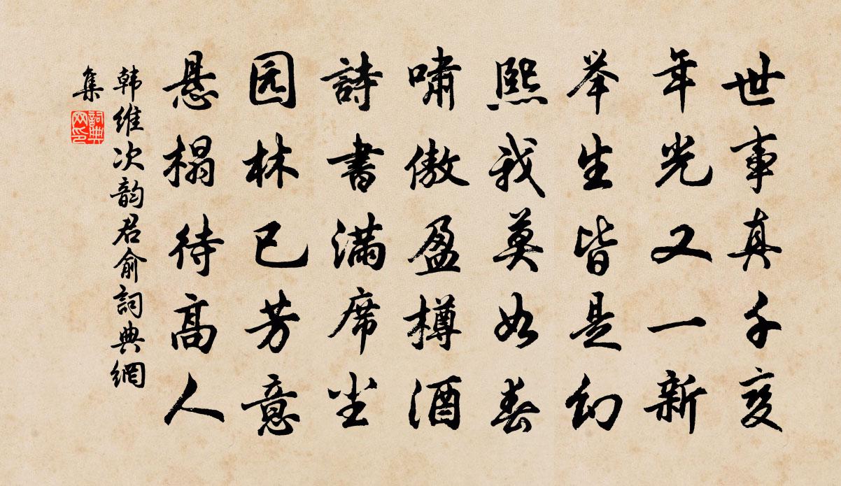 詩詞名句歷史字典書法欣賞書法字典國語詞典說文解字康熙字典古漢語字典標 題 作 者 詩 句 次韻君俞作者:韓維 朝代:宋代次韻君俞原文世事真千變,年光又一新。舉生皆是幻,熙我莫如春。嘯傲盈樽酒,詩書滿席塵。園林已芳意,懸榻待高人。詩詞問答問:次韻君俞的作者是誰?答:韓維問:次韻君俞寫於哪個朝代?答:宋代韓維次韻君俞書法欣賞次韻君俞書法作品詩詞推薦盤居六章項安世〔宋代〕雲居之陽,其水洋洋。有美一人,霞衣月裳。海棠春 已未清明對海棠有賦吳潛〔宋代〕海棠亭午沾疏雨。便一餉、胭脂盡吐。老去惜花心,相對花無語。羽書萬里飛來處。報掃蕩、狐嗥兔舞。濯錦古江寄題太和陳氏益龜堂周必大〔宋代〕講堂昔日飛三鱣,學館如今益十龜。文字上神君勿卜,明年春榜印累累。頌古二十九首釋師體〔宋代〕肌骨當初赫赤窮,麵皮今日厚千重。撩頭搭尾應更點,嬴賽闍黎齋後鍾。送趙信州二首劉克莊〔宋代〕君於朝列號名流,信在江東亦望州。保抱彼民思父母,齎咨吾輩惜交遊。香凝應物吟詩榻,虹貫元章載畫舟。澗上布袋贊釋大觀〔宋代〕兜率陀天,長汀管界。潑布袋打開,自買還自賣。眨上眉毛,敗也敗也。賢者之孝二百四十首申生林同〔宋代〕姬泣賊由於,子辭必罪姬。為憂君不樂,寧死莫君知。夜宿浙江亭曹既明〔宋代〕夜半潮聲撼客床,臥聽柔櫓鬧空江。驚回倦枕鄉關夢,海日烘山上曉窗。芹溪八詠葉善夫〔宋代〕芹溪處士古人風,寶劍塵埋未化龍。舊隱至今名不朽,扁題元出紫陽翁。夏日田園雜興范成大〔宋代〕中秋全景屬潛夫,棹入空明看太湖。身外水天銀一色,城中有此月明無。借景樓華岳〔宋代〕朱箔鉤新月,平闌架落霞。百錢呼酒炙,四壁聽笙笳。翠映誰家竹,香飄何處花。功名未歸我,且此寄生涯。秋晚真山民〔宋代〕暮色入江郊,霜風兩鬢毛。笛聲吹月落,詩興挾秋高。謝約南柯蟻,留連左手螯。孤燈竹窗底,危坐一歌騷。夜坐彈琴有感二首呈聖俞歐陽修〔宋代〕吾愛陶靖節,有琴常自隨。無弦人莫聽,此樂有誰知。君子篤自信,眾人喜隨時。其中苟有得,外物竟何為。寄謝過三郊驛卻寄楊評事時此子郭令公欲有表薦耿湋〔唐代〕冉冉青衫客,悠悠白髮人。亂山孤驛暮,長路百花新。終歲行他縣,全家望此身。更思君去就,早晚問平津。祥興第三十三文天祥〔宋代〕南遊炎海甸,沃野開天庭。真龍竟寂寞,乾坤水上萍。扇子詩李石〔宋代〕只教人喜莫教嗔,此是天公最至仁。吹落吹開俱有意,閒花野草漫爭春。令逸作歲寒知松柏題詩因作趙蕃〔宋代〕不有桃歲寒時,桃若為松柏桃知。南方桃故多暖,此物寧能奇。漫道同生植,何雲盛衰齊。不臣真浪說,難用空增泊上虞縣陸游〔宋代〕鄞江久不到,乘興偶東遊。漲水崩沙岸,歸雲抱縣樓。吟餘聲混混,梳罷發颼颼。喜見時平象,新絲入市稠。採薇(節選)佚名〔先秦〕昔我往矣,楊柳依依。今我來思,雨雪霏霏。行道遲遲,載渴載飢。我心悲傷,莫知我哀!春旱忽兩五絕劉克莊〔宋代〕周匝荒原遍,延緣斷港通。馬鬃渠有力,龍骨爾何功。名句推薦銀箭金壺漏水多,起看秋月墜江波。李白《烏棲曲》 怪見溪童出門望,雀聲先我到山家。劉因《山家·馬蹄踏水亂明霞》 蜃散雲收破樓閣,虹殘水照斷橋粱。白居易《江樓晚眺景物鮮奇吟玩成篇寄水部張員外》 喪不過三年,示民有終也。孔子及其弟子《孝經·喪親》 相顧無相識,長歌懷採薇。王績《野望》 常將有日思無日,莫把無時當有時。佚名《增廣賢文·上集》 政者正也。君為正,則百姓從政矣。戴聖《禮記·哀公問》 多情卻被無情惱。蘇軾《蝶戀花·春景》 遺廟丹青落,空山草木長。杜甫《武侯廟》 流水下灘非有意,白雲出岫本無心。佚名《增廣賢文·上集》
