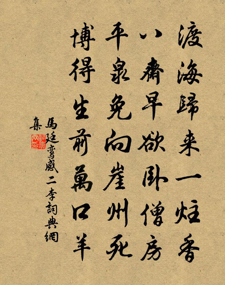 詩詞名句歷史字典書法欣賞書法字典國語詞典說文解字康熙字典古漢語字典標 題 作 者 詩 句 感二李作者:馬廷鸞 朝代:宋代感二李原文渡海歸來一炷香,八齋早欲臥僧房。平泉免向崖州死,博得生前萬口羊。詩詞問答問:感二李的作者是誰?答:馬廷鸞問:感二李寫於哪個朝代?答:宋代馬廷鸞感二李書法欣賞感二李書法作品詩詞推薦送王安之太博歸西京梅堯臣〔宋代〕聞君夢慈親,手把青玉佩。循環念歸期,月已九弦晦。既寤心悁悁,面垢不暇頮。屈指必春還,忽焉朱火代。夢兆關山五首孔武仲〔宋代〕曉上春風第一楂,豁然披眼盡天涯。原田極望人稀少,掩映茅篁數十家。淒淒行陸游〔宋代〕淒淒重淒淒,惻惻復惻惻,我媿思曠傍,人誰子思側?興邦在人材,岩穴當物色。如何清廟器,老死山南北!小儒自鹹平至太康鞍馬間得十小詩寄懷晏叔原並問黃庭堅〔宋代〕東南萬里江,緣淨一杯酒。王孫江南去,更得訊息否。煙霞石壁俞桂〔宋代〕山深入翠微,寺僻掩幽扉。景別金仙地,人忘塵世機。石滋崖雨滴,龍出洞雲飛。結屋同僧處,何須賦式微。貨丹吟鄰道場人〔唐代〕尋仙何必三山上,但使神存九竅清。煉得綿綿元氣定,自然不食亦長生。到夔門呈王待制李石〔宋代〕手挈東風上水關,鳳書迎日看新班。五湖家世烏衣巷,三峽樓台赤甲山。畫戟門開春盡永,臥龍帳穩海波閒。安危夜坐陸游〔宋代〕白首仍多病,青燈獨掩扉。雲低聞雁過,雨急待兒歸。波羅蜜果方信孺〔宋代〕累累圓實大於瓜,想見移根博望槎。三百餘篇誰識此,世間寧復有張華。鴛鴦篇陳子昂〔唐代〕飛飛鴛鴦鳥,舉翼相蔽虧。俱來綠潭裡,共向白雲涯。音容相眷戀,羽翮兩逶迤。蘋萍戲春渚,霜霰繞寒池。浦沙喜友人為僧林尚仁〔宋代〕身披雲衲瘦伶俜,一刺新添得寺名。餐供未便趺足坐,誦經猶作讀書志。禪窗欲晚聞鍾掩,吟履逢秋踏葉行。應是依韻和永叔子履冬夕小齋聯句見寄梅堯臣〔宋代〕遙知夜相過,對語冷無火。險辭斗尖奇,凍地抽筍笴。唫成欲寄誰,談極唯思我。學術窮後先,文字少許可。敢將秋夜陸游〔宋代〕老病龍鍾不入城,濁醪麤飯餞餘生。未霜村舍秋先冷,無月江天夜自明。出塞雖慚平賊手,下帷聊喜讀書聲。山童偶成俞桂〔宋代〕短髮蕭蕭滿鏡秋,家居但覺歲時流。兩年不見西湖面,笑我寒盟是白鷗。杕杜佚名〔先秦〕有杕之杜,其葉湑湑。獨行踽踽。豈無他人?不如我同父。嗟行之人,胡不比焉?人無兄弟,胡不佽焉?有杕之杜郊居李復〔宋代〕閒原渺渺散疏襟,風舞淵潛自樂生。春到雲山惟杖履,日長天地獨柴荊。百年雖健猶親藥,一飯無多懶問耕。常羨感春白玉蟾〔宋代〕晴少春光淺,寒多酒力微。一聲山鷓過,數點海棠飛。頌古六首釋鹹傑〔宋代〕賢聖法來未曾殺,而今斷這一刀休。果然葛怛胸中落,笑殺靈山老比丘。出山二首陳與義〔宋代〕陰岩不知晴,路轉見朝日。獨行修竹盡,石崖千丈碧。滿庭芳 嗚鶴餘音卷三三於真人〔元代〕落魄閒人,逍遙懶漢,逢人不語西東。騰騰兀兀,來往似塵中。乞化前街後巷,安居住、古廟閒宮。傍人問,這般名句推薦天若有情天亦老,搖搖幽恨難禁。孫洙《河滿子·秋怨》 離愁萬種,醉鄉一夜頭白。施耐庵《念奴嬌·天南地北》 綠淨春深好染衣。際柴扉。賀鑄《釣船歸·綠淨春深好染衣》 銀燭秋光冷畫屏,輕羅小扇撲流螢。杜牧《秋夕》 春愁難遣強看山,往事驚心淚欲潸。丘逢甲《春愁》 簾控鉤,掩上珠樓,風雨替花愁喬吉《春閨怨·不系雕鞍門前柳》 崖崩路絕猿鳥去,惟有喬木攙天長。蘇軾《李思訓畫長江絕島圖》 凡斗者,必自以為是而以人為非也。荀子《荀子·榮辱》 山不厭高,海不厭深曹操《短歌行》 不學自知,不問自曉,古今行事,未之有也。王充《論衡·卷二十六·實知篇》