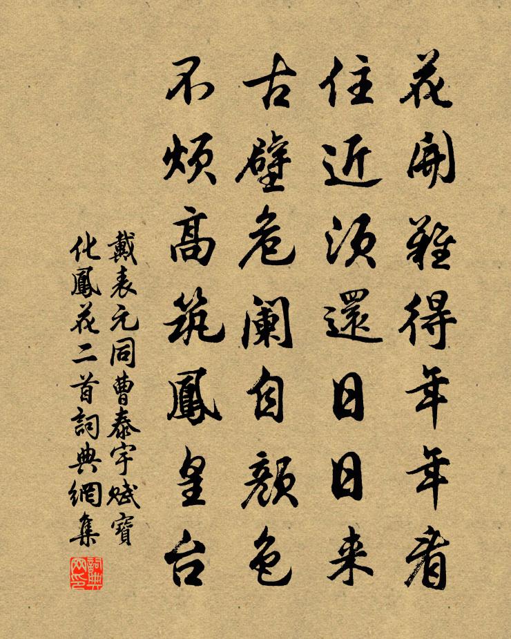 詩詞名句歷史字典書法欣賞書法字典國語詞典說文解字康熙字典古漢語字典標 題 作 者 詩 句 同曹泰宇賦寶化鳳花二首作者:戴表元 朝代:宋代同曹泰宇賦寶化鳳花二首原文花開難得年年看,住近須還日日來。古壁危闌自顏色,不煩高築鳳皇台。詩詞問答問:同曹泰宇賦寶化鳳花二首的作者是誰?答:戴表元問:同曹泰宇賦寶化鳳花二首寫於哪個朝代?答:宋代戴表元同曹泰宇賦寶化鳳花二首書法欣賞同曹泰宇賦寶化鳳花二首書法作品詩詞推薦禪人之梅陽釋曇華〔宋代〕此行不憚三千里,況是江天欲雪時。問道身心如不昧,梅陽老子已先知。和孟世功秋日吳江見寄吳芾〔宋代〕扁舟西去氣凌雲,坐看魚龍躍浪紋。風起白苹初日晚,霜雕紅葉欲秋分。忘機鷗鷺情相狎,入筆江山句不群。正恐答林石田見訪有詩相勞汪元量〔宋代〕偶攜降幟立詩壇,剪燭西窗共笑歡。落魄蘇秦今席暖,猖狂阮籍尚氈寒。山中客老乾莖白,海上人歸一寸丹。世事送森侄赴官李處權〔宋代〕郴江帶郴山,逶迤入平楚。偉觀甲瀟湘,信美非吾土。阿鹹方試吏,家風住儀矩。此時奉親輿,行李慎袢暑。別離樊登見寄四首唐彥謙〔唐代〕新辭翦秋水,洗我胸中塵。無由愜良會,極目空懷人。醉來拔劍歌,字字皆陽春。輕黃著柳條,新春喜更始。感時冬日雜興趙蕃〔宋代〕暑雨報禾熟,霜晴憂菜空。藜羹聊自誑,肉食念何功。歲晚貧兼病,年來西復東。詩成資遣悶,文就返招窮。愚溪二首劉克莊〔宋代〕青雲失腳謫零陵,十載溪邊意未平。溪不預人家國事,可能一例受愚名。麥熟有感石介〔宋代〕去年經春頻肆赦,拜赦人忙走如馬。五月不雨麥苗死,赦頻不能活窮寡。今年經春無赦書,十月一雨及時下。五月次韻徐子禮提舉鶯花亭范成大〔宋代〕灘長石出水鳴堤,城郭西頭舊小溪。遊子斷魂招不得,秋來春草更萋萋。愁邊逢酒卻成憎,衣頻寬來不自勝。煙水示智弼禮混源塔釋崇岳〔宋代〕相逢不相識,去後空相憶,靈骨撒長江。清風有何極極識,滔滔浪里休尋覓。晨起行園中陸游〔宋代〕老病厭囂煩,晨興步小園。草深移舊路,竹茂失頹垣。未暇從魚樂,惟思與石言。人家尋每得,拄杖印苔痕。哭悼朝賢虛中〔唐代〕前昨回私第,旋聞寢疾終。四鄰方響絕,二月牡丹空。冢已遷名境,碑仍待至公。只應遺愛理,長在楚南風。玉堂儤直陳與義〔宋代〕庭葉瓏瓏曉更青,斷雲吐日照寒廳。只應未上歸田奏,貪誦楞伽四卷經。游合皂王炎〔宋代〕灶臼依然在翠微,重重台殿鎖雙扉。可憐千載碧杉老,不見兩翁黃鶴歸。小倚修篁飛玉子,更升虛室奏金徽。渺茫水調歌頭·冬至子之半魏了翁〔宋代〕冬至子之半,玉管罅微陽。壺中別有天地,轉覺日增長。一樣金章紫服,一樣朱顏綠髮,翁季儼相望。翁是修何行桃源憶故人(賦桃花)史達祖〔宋代〕明霞烘透春機杼。春在明霞多處。我是有詩漁父。一夢秦天古。柳枝巷陌深朱戶。牆外風流一樹。十五年來凝佇。錢塘晚渡別友釋文珦〔宋代〕寒月照沙頭,輕風引客舟。掛帆重曠望,舉櫂復夷猶。地勢連吳越,星躔次鬥牛。雁煙縈別思,漁火點鄉愁。雙鬢偈頌一百零二首釋紹曇〔宋代〕是是,荊棘叢林,黃金田地。非非,伊蘭旃蔔,甘露蒺藜。是不是,非不非,鶴健將雛去,猿閒抱子歸。趙寶學輓詞二首林季仲〔宋代〕粲粲霜蕤晚,淒淒煙渚秋。長隨山簡馬,同上謝公樓。詩句入飛鶩,歌聲落釣舟。那知倚欄處,直北是松楸。次韻雪竇寺主僧炳同招游山二首陳著〔宋代〕萬葉逢秋又纈斑,珠林錦鏡好追攀。人生行樂非容易,本是閒人也未閒。名句推薦重陽獨酌杯中酒,抱病起登江上台。杜甫《九日五首·其一》 先到為君,後到為臣。佚名《增廣賢文·上集》 紙屏石枕竹方床,手倦拋書午夢長。蔡確《夏日登車蓋亭》 孤之有孔明,猶魚之有水也。陳壽《隆中對》 君似孤云何處歸,我似離群雁。周紫芝《卜運算元·席上送王彥猷》 智欲圓而行欲方,膽欲大而心欲小。程登吉《幼學瓊林·卷三·人事》 高樓目盡欲黃昏,梧桐葉上蕭蕭雨。晏殊《踏莎行·碧海無波》 造物無言卻有情,每於寒盡覺春生。張維屏《新雷》 戲馬台南山簇簇,山邊飲酒歌別曲。張籍《送遠曲》 只願君心似我心,定不負相思意。李之儀《卜運算元·我住長江頭》