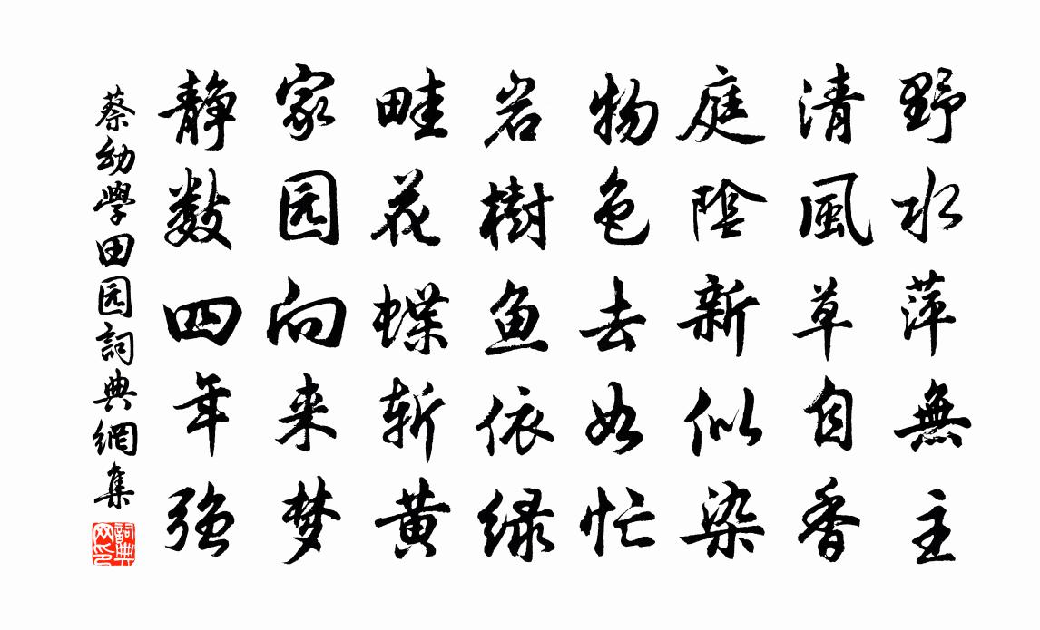 詩詞名句歷史字典書法欣賞書法字典國語詞典說文解字康熙字典古漢語字典標 題 作 者 詩 句 田園作者:蔡幼學 朝代:宋代田園原文野水萍無主,清風草自香。庭陰新似染,物色去如忙。岩樹魚依綠,畦花蝶斬黃。家園向來夢,靜數四年強。詩詞問答問:田園的作者是誰?答:蔡幼學問:田園寫於哪個朝代?答:宋代蔡幼學田園書法欣賞田園書法作品詩詞推薦送龍圖燕待制出守梓潼宋庠〔宋代〕寶構沈沈夕霧迷,儒林俊老出分麾。中天秘牒河龍負,上路鳴鐃笮馬馳。香襲寵鞶驚放獸,野連豐芋蔽蹲鴟。潼江答來上人春日即事梅堯臣〔宋代〕南國三衣客,三城一見春。花明馳道遠,雨漲御溝新。茗憶山中物,雲懷嶺上鄰。如何異鄉感,卻出解空人。句王大受〔宋代〕岸拖秋草綠。歲暮白居易〔唐代〕慘澹歲雲暮,窮陰動經旬。霜風裂人面,冰雪摧車輪。而我當是時,獨不知苦辛。晨炊廩有米,夕爨廚有薪。夾帽選官子/選冠子楊 * 〔宋代〕塞雁呼雲,寒蟬噪晚,繞砌夜蛩淒斷。迢迢玉宇,耿耿銀河,明月又歌團扇。行客暮泊郵亭,孤枕難禁,一窗風箭馬上口占二首秦觀〔宋代〕向晨結束爭長途,利風颳面冰在須。岡窮得水馬不進,霧暗失道人相呼。悠悠旁舍見汲井,軋軋隔林聞輓車。游目和清源太保閒居偶懷徐鉉〔唐代〕朝退閒齋落葉天,道心真氣本仙源。簾前風月澄秋景,門外輪蹄任世喧。棋罷早寒生北戶,酒醒 * 花滿西園。時鏡詩庾信〔南北朝〕玉匣聊開鏡。輕灰暫拭塵。光如一片水。影照兩邊人。月生無有桂。花開不逐春。試掛淮南竹。堪能見四鄰。同齊節初游吳園登四時佳興樓有懷張史君黎廷瑞〔宋代〕澹澹池中華,離離池上樹。緬懷龍山翁,婆娑此成趣。相招桃源舟,蹇予莫能赴。翁今為飛仙,乘雲還帝所。歸燕訪友人家即事戴復古〔宋代〕爛茅遮屋竹為床,口誦時文鬢已霜。妻病無錢供藥物,自尋野草試單方。次韻良佐歇心歌三首陶夢桂〔宋代〕鳥窠看了看蜂窠,才上坡來又下坡。松竹徑中逢野老,芰荷香里唱漁歌。歸來不見香風改,老去何愁明月多。況有朝中措(為人壽)辛棄疾〔宋代〕年年金蕊艷西風。人與菊花同。霜鬢經春重綠,仙姿不飲長紅。焚香度日盡從容。笑語調兒童。一歲一杯為壽,從贈棋僧侶張喬〔唐代〕機謀時未有,多向弈棋銷。已與山僧敵,無令海客饒。靜驅雲陣起,疏點雁行遙。夜雨如相憶,松窗更見招。雜體詩 袁太尉淑從駕江淹〔南北朝〕宮廟禮哀敬。枌邑道嚴玄。恭潔由明祀肅駕在祈年。詔徒登季月。戒鳳藻行川。雲斾象漢徙。宸網擬星懸。朱棹麗過東平悼曾英甫蕭澥〔宋代〕前時來客此山居,同醉梅邊酒幾壺。不道後來成死別,影堂吟落一燈孤。眠雲齋陳師道〔宋代〕已是登臨晚,長須愛惜春。終當捐世事,來往臥雲人。絕地楊備〔宋代〕列戟高門氣自雄,主人應是偶相逢。由來禍福皆人召,此地無辜喚作凶。白雲莊四首平溪堂柴望〔宋代〕亭號休休古退藏,豈如溪上構虛堂。坐邀城市真瀟灑,卻謂江湖太渺茫。下筆新題無俗事,攜筇野服是家常。臨流端午內中帖子詞夫人閣王珪〔唐代〕火雲時節促金刀,旋卷珠簾剪絳綃。天上莫將塵世比,房櫳都未覺炎歊。贈皇甫庶子白居易〔唐代〕何因散地共徘徊,人道君才我不才。騎少馬蹄生易蹶,用稀印鎖澀難開。妻知年老添衣絮,婢報天寒撥酒醅。更愧名句推薦陰晴圓缺都休說,且喜人間好時節。徐有貞《中秋月·中秋月》 其交也以道,其接也以禮孟子《孟子·萬章章句下·第四節》 成事莫說,覆水難收。佚名《增廣賢文·上集》 失之東隅,收之桑榆。范曄《後漢書·列傳·馮岑賈列傳》 見說新愁,如今也到鷗邊張炎《高陽台·西湖春感》 馬思邊草拳毛動,雕眄青雲睡眼開。劉禹錫《始聞秋風》 二月春花厭落梅。仙源歸路碧桃催。晏幾道《浣溪沙·二月春花厭落梅》 何事吟余忽惆悵,村橋原樹似吾鄉。王禹偁《村行·馬穿山徑菊初黃》 君知妾有夫,贈妾雙明珠。張籍《節婦吟·寄東平李司空師道》 恭敬不如從命。曹雪芹《紅樓夢·第六十二回》