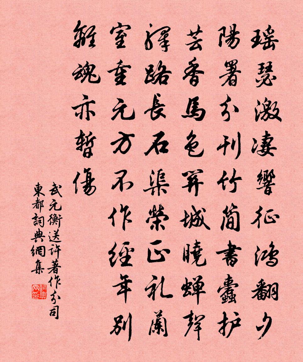 詩詞名句歷史字典書法欣賞書法字典國語詞典說文解字康熙字典古漢語字典標 題 作 者 詩 句 送許著作分司東都作者:武元衡 朝代:唐代送許著作分司東都原文瑤瑟激淒響,征鴻翻夕陽。署分刊竹簡,書蠹護芸香。馬色關城曉,蟬聲驛路長。石渠榮正禮,蘭室重元方。不作經年別,離魂亦暫傷。詩詞問答問:送許著作分司東都的作者是誰?答:武元衡問:送許著作分司東都寫於哪個朝代?答:唐代問:送許著作分司東都是什麼體裁?答:五排武元衡送許著作分司東都書法欣賞送許著作分司東都書法作品注釋全唐詩:卷317-40詩詞推薦大熱二首歐陽修〔宋代〕陽暉爍四野,萬里纖雲收。羲和困路遠,正午當空留。枝條不動影,草木皆含愁。深林虎不嘯,臥喘如吳牛。蜩蟬珊瑚井方信孺〔宋代〕可怪仙翁亦世情,珊瑚還許至殷勤。波神不是趙佗客,即是前身石季倫。和王仲儀二首凌霄花梅堯臣〔宋代〕草木不解行,隨生自有理。觀此引蔓柔,必憑高樹起。氣類固未合,縈纏豈由己。仰見蒼虬枝,上發彤霞蕊。層霄浣溪沙·身向雲山那畔納蘭性德〔清代〕身向雲山那畔行,北風吹斷馬嘶聲,深秋遠塞若為情!一抹晚煙荒戍壘,半竿斜日舊關城。古今幽恨幾時平!聞進士孫何及第因寄王禹偁〔宋代〕昨朝邸吏報商山,聞道孫生得狀元。為賀聖朝文物盛,喜於初入紫微垣。朝陽穿破衲贊釋紹曇〔宋代〕死鐵針,無鼻竅。眼昏花,穿不過。穿得過,雲擁禪衣,風生木杪。浣溪沙晁端禮〔宋代〕誤入仙家小洞來。碧桃花落亂浮杯。滿身羅綺裛香煤。醉倒任眠深逕里,醒時須插滿頭歸。更收餘蕊釀新醅。鷓鴣天倪偁〔宋代〕野曠無塵夕靄收。人間八月桂花秋。三更爽氣山圍座,萬里涼風月滿樓。登絕嶺,小遲留。人言惟酒可忘憂。一杯如夢令仇遠〔宋代〕特特問花訊息。結果剩紅殘白。芍藥可人憐,相約荼留客。消得。消得。猶有一分春色。湖中古愁三首李群玉〔唐代〕涼風西海來,直渡洞庭水。翛翛木葉下,白浪連天起。蘅蘭委皓雪,百草一時死。摧殘負志人,感嘆何窮已。昔我賦得胥台露庾抱〔唐代〕胥台既落構,荊棘稍侵扉。棟拆連雲影,梁摧照日暉。翔軍鳥逐不及,巢燕反無歸。唯有團階露,承曉共沾衣。蕉庵雜言樓鑰〔宋代〕環植巒蕉數十株,幻成方丈一屠蘇。幾重青蒼兩邊合,四壁穿空一物無。早涼日薄坐其下,爽氣肅颯風來徐。此為無瑕釋心月〔宋代〕本體溫如又瑩如,擬心雕琢費工夫。自家寶藏只這是,切莫揩磨染污渠。放言五首劉克莊〔宋代〕萬里先行腳,三家晚閉關。曾求詩入海,亦作史藏山。浣溪沙李洪〔宋代〕掃地燒香絕點塵。綠階綠草又殘春。略無閒事撓天真。時落燕泥沾幾席,亂粘飛絮上衣巾。西湖回柁少年人。失調名佚名〔宋代〕曾教入夜月添白。挽唐立夫舍人喻良能〔宋代〕才名振西蜀,老氣益中州。草制追盤誥,籌邊動冕旒。已令榮壓角,復遣飲遨頭。千古九江恨,長隨逝水流。洞霄琳宮連久道〔宋代〕玲瓏萬狀石欺玉,開闔千層秀結峰。尚有炎蒸疑夏日,未令新爽洗秋容。龍翔鳳舞來天目,水秀山明鞏帝封。新見雜詩七首黃庭堅〔宋代〕薰爐茶鼎偶然同,晴日鴉啼柿葉風。萬事盡還麴居士,百年常在大槐宮。月華寺(寺鄰岑水場施者皆坑戶也,百年間蓋三焚矣)蘇軾〔宋代〕天公胡為不自憐,結土融石為銅山。萬人探斫富媼泣,只有金帛資豪奸。脫身獻佛意可料,一瓦坐待千金還。月華名句推薦嘆隙中駒,石中火,夢中身。蘇軾《行香子·述懷》 多情只有春庭月,猶為離人照落花。張泌《寄人》 榮以榮人者榮,禍以禍人者禍。來俊臣《羅織經·瓜蔓卷第十二》 莫笑他人老,終須還到老。佚名《增廣賢文·上集》 中州遺恨,不知今夜幾人愁。辛棄疾《水調歌頭·和馬叔度游月波樓》 絕景良時難再並,他年此日應惆悵。劉禹錫《八月十五夜桃源玩月》 觸簾風送景陽鍾,鴛被繡花重。顧敻《虞美人·觸簾風送景陽鍾》 而今識盡愁滋味,欲說還休。辛棄疾《醜奴兒·書博山道中壁》 春雲不變陽關雪,桑葉先知胡地秋。李昂《從軍行》 地下千年骨,誰為輔佐臣。戎昱《詠史 / 和蕃》