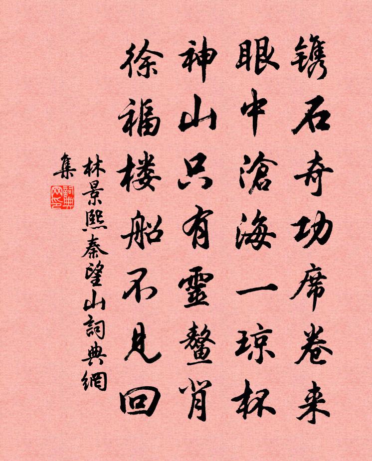 詩詞名句歷史字典書法欣賞書法字典國語詞典說文解字康熙字典古漢語字典標 題 作 者 詩 句 秦望山作者:林景熙 朝代:宋代秦望山原文鐫石奇功席捲來,眼中滄海一瓊杯。神山只有靈鰲背,徐福樓船不見回。詩詞問答問:秦望山的作者是誰?答:林景熙問:秦望山寫於哪個朝代?答:宋代林景熙秦望山書法欣賞秦望山書法作品詩詞推薦瑞鶴仙葛長庚〔宋代〕殘蟾明遠照。正一番霜訊,四山秋老。孤村帶清曉。有鳴鞭歸騎,亂林啼鳥。青簾縹緲。懶行時,持杯自笑。甚年句王隨〔宋代〕詩酒一生唯道□,田園數頃敵封侯。題倅廳吏隱堂趙眾〔宋代〕滿耳江聲滿目山,此身疑不在人寰。民含古意村村靜,吏束刑書日日閒。西江月佚名〔宋代〕良月才經四日,彭城慶誕真賢。從來斗酒百詩篇。錦繡文章燦爛。自合宰官身現,誰知富貴由天。但教福壽喜雙全扇宋伯仁〔宋代〕師璋今有幾家同,名重蒲葵價亦穹。髹柄但夸千縷骨,不知曾未掩西風。久晴十月二十四日五日連雨程以忠來同飲方回〔宋代〕侵尋小雪初,不雨五旬余。深井腥泥水,荒畦槁蛀蔬。牛災傳聚落,蛇出騙階除。巫詫瘟神王,官虞火政疏。淺流賦張袁州隱齋三首度正〔宋代〕少時見敲搒,濈濈背欲汗。及壯事州縣,稍稍覺不憚。由來只一心,今昔非異見。君子遠庖廚,夫豈惡芻豢。長恐普熏院李淛〔宋代〕征鞍曉踏山頭月,客袂晝披松下風。況有禪堂供偃息,陶然一枕夢槐宮。偈頌二十五首釋如淨〔宋代〕古今大雪滿長安,天童賣卻這心肝。無神通菩薩猛劈一椎,千手眼大悲捏怪多端。獅子教兒迷了訣,老婆心切不相禪人寫真請贊十二首釋曇華〔宋代〕豎拂拄拂,全機出沒。一喝耳聾三日,叢林至今狼籍。屈屈,且道是馬祖屈,百丈屈,歸宗屈。宗一侍者,但恁麽宮詞一百首岳珂〔宋代〕三更內省奏邊機,合子門頭等御批。坐待報籌呼絳幘,上陽曉色已多時。宋頌九首皇祖石介〔宋代〕予亦即祚,涵濤養撫。罔有失所,予德其裕。題清暉樓二首留碩〔宋代〕萬古龍濤山水窟,何人攜向嶺邊州。朝來蜃氣連城白,幻作恩平第一樓。答張郁歌洛川仙女〔唐代〕彩雲入帝鄉,白鶴又迴翔。久留深不可,蓬島路遐長。空愛長生術,不是長生人。今日洛川別,可惜洞中春。寄昭潭王中立胡宿〔唐代〕高弦一弄武陵深,六幕天空萬里心。吳苑歌驪成久別,楚峰迴雁好歸音。十千美酒花期隔,三百枯棋弈思沈。莫上好事近張孝祥〔宋代〕一朵木犀花,珍重玉纖新摘。插向遠山深處,占十分秋色。滿園桃李鬧春風,漫紅紅白白。爭似淡妝嬌面,伴蓬萊東溪張耒〔宋代〕東溪何潺潺,秋水清見底。縱橫小石圓,一一靜無滓。空山人不到,漍漍響環佩。我來每終日,漱濯弄清泚。山居別中都明府兄李白〔唐代〕吾兄詩酒繼陶君,試宰中都天下聞。東樓喜奉連枝會,南陌愁為落葉分。城隅淥水明秋日,海上青山隔暮雲。取醉送陳睦赴河中幕鄭獬〔宋代〕紫皇初放第三榜,中有英豪絕世無。天廄本生騏驥子,雲霄又得鳳凰雛。不須虎鬧終全趙,自是龍驤首破吳。雖作和原父揚州六題蒙谷}歐陽修〔宋代〕一徑崎嶇入谷中,翠條紅刺罥春叢。花深時有人相應,竹密初疑路不通。名句推薦秀樾橫塘十里香,水花晚色靜年芳。蔡松年《鷓鴣天·賞荷》 離恨又迎春,相思難重陳。和凝《菩薩蠻·越梅半拆輕寒里》 懷家寒食夜,中酒落花天。趙長卿《臨江仙·暮春》 一民之軌,莫如法。厲官威名,退淫殆,止詐偽,莫如刑。刑重,則不敢以貴易賤;法審,則上尊而不侵。韓非及後人《韓非子·有度》 雲中亂拍祿山舞,風過重巒下笑聲。杜牧《過華清宮絕句三首》 黃華自與西風約,白髮先從遠客生。元好問《秋懷》 雷雨窈冥而未半,皦日籠光於綺寮。左思《三都賦》 藕花珠綴,猶似汗凝妝。閻選《臨江仙·雨停荷芰逗濃香》 等閒識得東風面,萬紫千紅總是春。朱熹《春日》 白髮漁樵江渚上,慣看秋月春風。楊慎《臨江仙·滾滾長江東逝水》