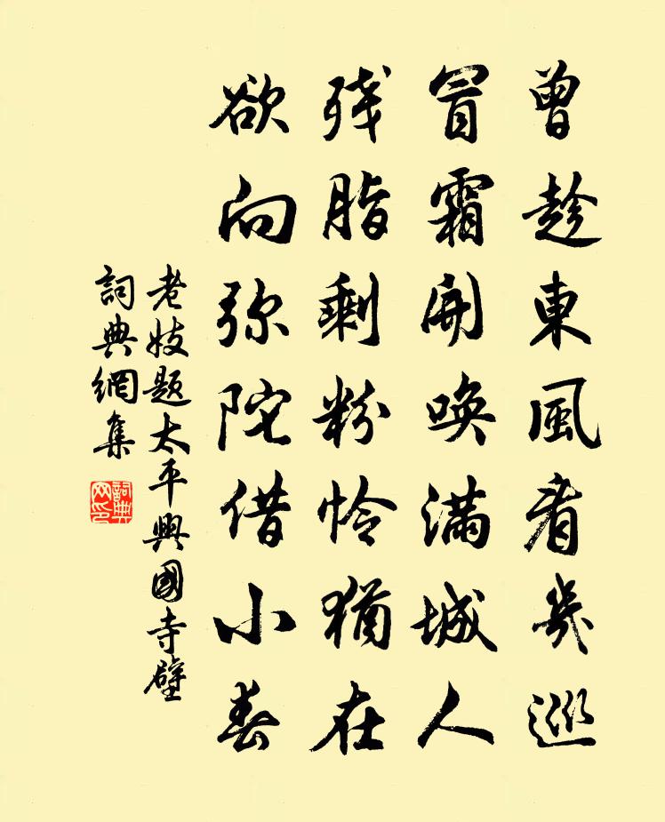 詩詞名句歷史字典書法欣賞書法字典國語詞典說文解字康熙字典古漢語字典標 題 作 者 詩 句 題太平興國寺壁作者:老妓 朝代:宋代題太平興國寺壁原文曾趁東風看幾巡,冒霜開喚滿城人。殘脂剩粉憐猶在,欲向彌陀借小春。詩詞問答問:題太平興國寺壁的作者是誰?答:老妓問:題太平興國寺壁寫於哪個朝代?答:宋代老妓題太平興國寺壁書法欣賞題太平興國寺壁書法作品詩詞推薦梅花石吟舒岳祥〔宋代〕梅花樹下梅花石,花作玉玉妝石鐵色。黃筌粉本花光枝,風吹數片尤奇特。何年處士橫斜句,影落寒溪印苔磧。又送家安國赴成都教授三絕蘇轍〔宋代〕石室多年款志平,新書久溷里中生。遣師今見朝廷意,文律還應似兩京。入青城山門詩程公許〔宋代〕入山佳氣異他山,翠邏周遭幾復關。流水白雲無盡藏,莫教容易到人間。水調歌頭(楊崇慶熹生日)魏了翁〔宋代〕風露浸秋色,煙雨媚湖弦。旌旗十里小隊,擬約醮壇仙。身在黃旗朱邸,名在玉皇香案,底事個人傳。正恐未免耳與李榮互謔僧法軌〔唐代〕姓李應須禮,言榮又不榮。 ——僧法軌身長三尺半,頭毛猶未生。 ——李榮蘭陵王(和吳宣卿)葛郯〔宋代〕亂煙簇。簾外青山漸肅。蓮房靜。荷蓋半殘,欲放清漣媚溪綠。憑高送遠目。飛起滄洲雁騖。寒窗靜,茶碗未深,樂大夫輓詞五首駱賓王〔唐代〕可嘆浮生促,吁嗟此路難。丘陵一起恨,言笑幾時歡。蕭索郊埏晚,荒涼井徑寒。誰當門下客,獨見有任安。蒿里問祖顯疾章甫〔宋代〕念子何多病,逢人問好音。可無安樂法,未用短長吟。陋巷鄰南北,春風酒淺深。杯蛇弓落影,應已斷疑心。行路難李彌遜〔宋代〕江心蟠石蒼虬立,山激江流浪頭急。風昏月暗魚龍愁,電掣雲奔鬼神入。船頭星斗天為低,夜潮生寒洲渚移。鳴舷醉落魄(次韻斯遠)韓淲〔宋代〕風高木落。壯心萬里空回薄。振衣待把塵埃濯。聲里斜陽,孤起戍樓角。人生誰會誰為錯。年來但覺多離索。黃花黃山絕頂題文殊院魏源〔清代〕峰奇石奇松更奇,雲飛水飛山亦飛。華山忽向江南峙,十丈花開一萬圍。賦桃李花曾豐〔宋代〕春風已暢上林枝,況得連朝雨發揮。越女嬌紅純任白,楊妃懲瘦少教肥。微風遠送難言意,亂蝶潛生不肖機。本是長安春日章碣〔唐代〕春日皇家瑞景遲,東風無力雨微微。六宮羅綺同時泊,九陌煙花一樣飛。暖著柳絲金蕊重,冷開山翠雪棱稀。輸他詠韓湘白玉蟾〔宋代〕汝叔做盡死模樣,雪裡出來無意史。賴有當年花一籃,至今推與閒和尚。南華道中詩朱翌〔宋代〕小市荒堤轉,湧泉春水慳。頻經石角鋪,不上馬鞍山。橋斷沖泥過,松摧塞道艱。草鞋牢踏雨,更著一蓑還。次韻道輔丈荊州吟四首吳則禮〔宋代〕故人高枕閉柴荊,應恨平生謾一經。下榻每憐揮白羽,挽溪仍喜得紅菱。酬元郎中同制加朝散大夫書懷見贈白居易〔唐代〕命服雖同黃紙上,官班不共紫垣前。青衫脫早差三日,白髮生遲校九年。曩者定交非勢利,老來同病是詩篇。終身如夢令張元乾〔宋代〕臥看西湖煙渚。綠蓋紅妝無數。簾捲曲欄風,拂面荷香吹雨。歸去。歸去。笑損花邊鷗鷺。醉蓬萊(毛氏女兄生朝三月二十八日)李處全〔宋代〕政余春眷眷,首夏駸駸,清和時候。曉色曈曨,瑞靄凝軒牖。著子青梅,裊枝紅藥,物物俱情厚。綠綺朱弦,檀槽寒劉克莊〔宋代〕趁得清明幾日閒,不禁連雨作春寒。小窗對客開新煮。藝罷沈香看牡丹。名句推薦夫人雖有性質美而心辯知,必將求賢師而事之荀子《荀子·性惡》 雲母屏風燭影深,長河漸落曉星沉。李商隱《嫦娥》 今夜不知何處宿,平沙萬里絕人煙。岑參《磧中作》 少壯不努力,老大徒傷悲!佚名《長歌行》 奢者富而不足,何如儉者貧而有餘。洪應明《菜根譚·概論》 天際兩蛾凝黛,愁與恨、幾時極。韓元吉《霜天曉角·題採石蛾眉亭》 常隨寶鐙陪金勒,絕塞指揮萬馬嘶。俞益謨《中洲株柳》 盡道有些堪恨處,無情,任是無情也動人。秦觀《南鄉子·妙手寫徽真》 清明上巳西湖好,滿目繁華。歐陽修《採桑子·清明上巳西湖好》 一聲已動物皆靜,四座無言星欲稀。李頎《琴歌》