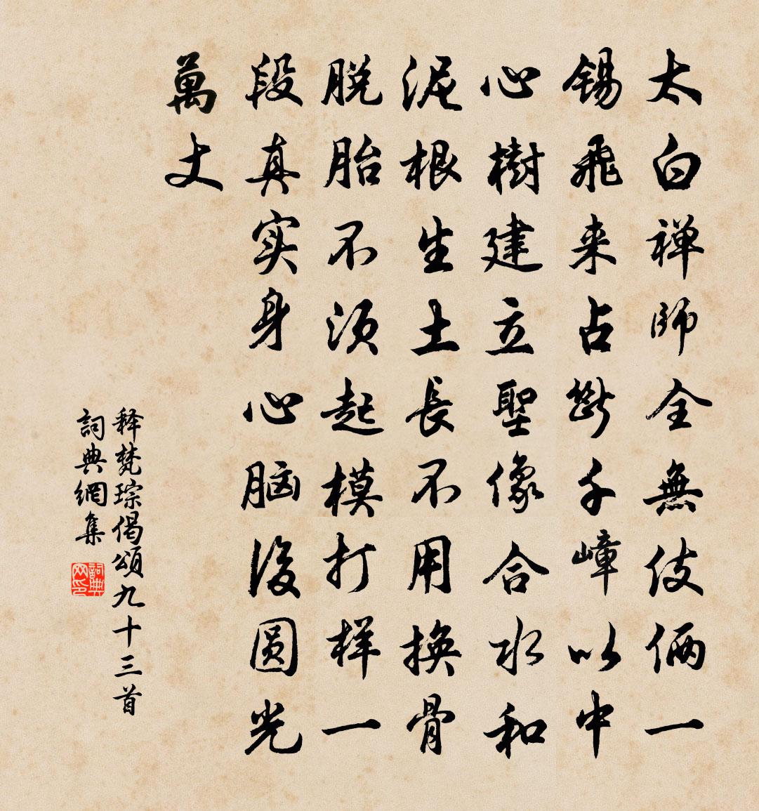 詩詞名句歷史字典書法欣賞書法字典國語詞典說文解字康熙字典古漢語字典標 題 作 者 詩 句 偈頌九十三首作者:釋梵琮 朝代:宋代偈頌九十三首原文太白禪師,全無伎倆。一錫飛來,占斷千嶂。以中心樹,建立聖像。合水和泥,根生土長。不用換骨脫胎,不須起模打樣。一段真實身心,腦後圓光萬丈。詩詞問答問:偈頌九十三首的作者是誰?答:釋梵琮問:偈頌九十三首寫於哪個朝代?答:宋代釋梵琮偈頌九十三首書法欣賞偈頌九十三首書法作品詩詞推薦次以道荷葉浦張鎡〔宋代〕向來曾愛葉田田,落日荷花擁櫂前。霜冷不移魚世界,葦殘聊作雁家緣。詩狂頃刻成三首,懶病中間接四邊。除此題王之朝所惠扇陳著〔宋代〕八十三歲衰翁,執熱也要清風。此涼來自何處,來自羲之手中。題周垣戴氏桂林池館梁泰來〔宋代〕地偏不受點塵侵,日涉園亭得趣深。竹外移梅曾辟徑,月中分桂定成林。雲山環碧醉人眼,池水澂泓鑒此心。淨幾中秋夜喜晴方回〔宋代〕秋來剩賦倚樓吟,天慰衰翁此夜心。霽色一輪升白玉,歡聲萬鎰價黃金。酒才半醉吾忘我,詩最難題古到今。日□寄德升大光陳與義〔宋代〕君王優詔起群公,也寘樵夫尺一中。易著青衫隨世事,難將白髮犯秋風。共談太極非無意,能系蒼生本不同。卻倚句譚峭〔唐代〕雲外星霜如走電,世間娛樂似拋磚。八翁十首張載〔宋代〕步虛聲裹八奇翁,八奇須信古英雄。賓朋未散山翁醉,聽歌同入醉鄉中。擲盧作馮袞〔唐代〕八尺台盤照面新,千金一擲斗精神。合是賭時須賭取,不妨回首乞閒人。室思徐幹〔魏晉〕峨峨高山首,悠悠萬里道。君去日已遠,鬱結令人老。人生一世間,忽若暮春草。時不可再得,何為自愁惱?每誦謝人送白山茶花二首張鎡〔宋代〕韻勝初聞不記年,偶逢俄在軟紅邊。山礬不遇南昌老,爭得嘉名亞水仙。送高生歸青社魏野〔宋代〕去指滄溟畔,來辭翠靄間。程遙過鳳闕,家近見牛山。紅葉飄行色,清溪照別顏。蹇驢看上處,拄杖出柴關。林深羅與之〔宋代〕林深氛雜不相關,眾建芳馨兩廡間。月榭琴彈新制曲,曉窗畫展舊遊山。淒涼風滿竹十個,的皪春歸梅一班。可笑家有含笑花開因成三首李呂〔宋代〕山花弄春妍,紫霧巧映帶。凝羞香乍吐,顰蹙有餘態。芍藥畏陽艷,愁紅爭斂黛。幽姿小嫣然,已復傾下蔡。紀聖詩宋祁〔宋代〕沙麓披祥牒,金刀襲裔昆。嬪虞冠媯汭,生子首姜嫄。自昔儀椒壺,乘時正翟軒。褘褕躬象服,黃老好名言。慈蔭建安遣興陸游〔宋代〕古今清絕沅湘路,臥想蒲帆十幅開。不是避人思遠適,肺肝塵土要詩才。偈頌七十一首釋了惠〔宋代〕起寨重招五百兵,等閒恢復百餘城。凌煙閣上清風起,留得將軍卷世名。頌古四首釋亮〔宋代〕一色通身白,天然絕點塵。吒少當古路,不吼也驚人。雜詠黃庚〔宋代〕持螯已飽團臍蟹,砟膾猶思巨口鱸。風物秋來多感慨,天寒酒醒客心孤。楊極父輓詩魏了翁〔宋代〕高堂元佑腳,下澤少游鄉。自得林泉趣,不登聲利場。年方榮四豆,日已下三商。有子翁無咎,存心味更長。月先圓/好女兒賀鑄〔宋代〕才色相憐。難偶當年。屢逢迎、幾許 * 意,記鞦韆架底,摴蒲局上,祓禊池邊。收貯一春幽恨,細書遍、砑綾箋名句推薦側見雙翠鳥,巢在三珠樹張九齡《感遇十二首·其四》 露清枕簟藕花香,恨悠揚。顧敻《虞美人·觸簾風送景陽鍾》 春近寒雖轉,梅舒雪尚飄。陰鏗《雪裡梅花詩》 心者修裔之根,未有根不植而枝葉榮茂者。洪應明《菜根譚·概論》 我住長江頭,君住長江尾。李之儀《卜運算元·我住長江頭》 寧可枝頭抱香死,何曾吹落北風中。鄭思肖《畫菊》 美之所在,雖污辱,世不能賤;惡之所在,雖高隆,世不能貴。劉安及其門客《淮南子·說山訓》 金風飄菊蕊,玉露泫萸枝。韋安石《奉和九日幸臨渭亭登高應制得枝字》 軍中宜劍舞,塞上重笳音。張說《幽州夜飲》 故人何處。帶我離愁江外去。呂本中《減字木蘭花·去年今夜》