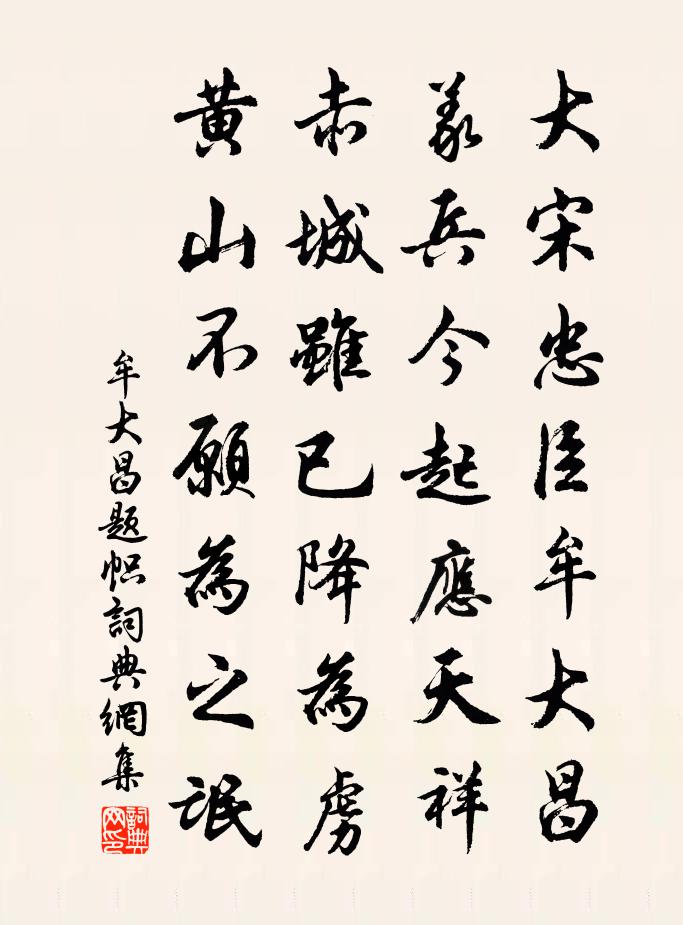 詩詞名句歷史字典書法欣賞書法字典國語詞典說文解字康熙字典古漢語字典標 題 作 者 詩 句 題幟作者:牟大昌 朝代:宋代題幟原文大宋忠臣牟大昌,義兵今起應天祥。赤城雖已降為虜,黃山不願為之氓。詩詞問答問:題幟的作者是誰?答:牟大昌問:題幟寫於哪個朝代?答:宋代牟大昌題幟書法欣賞題幟書法作品詩詞推薦山居圖唐寅〔明代〕隱居深在碧山空,澗壑才堪側步通。芋栗一園秋計足,僮奴百指治生同。短牆甃石牢牽荔,薄酒盈壇共轉筒。我欲菩薩蠻(七夕·般涉調)張先〔宋代〕雙針競引雙絲縷。家家盡道迎牛女。不見渡河時。空聞烏鵲飛。西南低片月。應恐雲梳發。寄語問星津。誰為得巧天津感事二十六首邵雍〔宋代〕自古別都多隙地,參天喬木亂昏鴉。荒垣壤堵人耕處,半是前朝卿相家。冬日寫懷薛能〔唐代〕幕府盡平蠻,客留戎閫間。急流霜夾水,輕靄日連山。設醴徒慚楚,為郎未姓顏。斯文苦不勝,會擬老民閒。漁梁嶺禹廟胡仲參〔宋代〕古今陳跡幾興亡,閩嶺何因祀夏王。莫是當年平水日,曾驅魚鱉渡漁梁。句釋方會〔宋代〕劍為不平離實匣,藥因救病出金瓶。道室試筆陸游〔宋代〕浮雲萬事不到眼,千歲人間心尚孩。屏風疊下看花落,扇子峽中聞雪來。悼王思中卷剛中〔宋代〕風前不見玉壺水,追想欷歔淚欲橫。官小僅能離令尹,家貧還祗似書生。深沉每見仁人勇,惠愛常留長者名。不負峽山二首戴復古〔宋代〕欲訪飛來殿,維舟上峽山。有溪流屋下,無路入雲間。犀解捐金索,猿能記玉環。無從旌往事,有地足躋攀。詠史八首蔡文姬蒲壽宬〔宋代〕琴彈十八拍,聽此雙淚流。一死固已難,萬言復誰尤。九原見衛子,何語可以酬。高祖二首陳造〔宋代〕坐馘關東扛鼎雄,指呼奴隸走王公。只緣奪嫡中心慊,反畏商山鶴髮翁。征婦怨趙崇嶓〔宋代〕梧桐葉葉生涼秋,燕山早寒已知遒。則則力力嘆不休,堂前月光使人愁。停針罷線淚沾裳,朔風漸高天雨霜。妾憂跋王介甫游鐘山圖張栻〔宋代〕林影溪光靜自如,蕭疎短鬢獨騎驢。可能胸次都無事,擬向山中更著書。臘雪五首蘇轍〔宋代〕長恐冬無雪,今朝忽暗空。細聲聞簌簌,遠勢望蒙蒙。濕潤猶兼雨,傾斜半雜風。豐登解多事,歡喜助三農。驕陽女冠子·淡煙飄薄柳永〔宋代〕淡煙飄薄。鶯花謝、清和院落。樹陰翠、密葉成幄。麥秋霽景,夏雲忽變奇峰、倚寥廊。波暖銀塘,漲新萍綠魚躍對雪二首宋祁〔宋代〕縈叢著樹半瀟瀟,皓氣妍華混泬寥。為倚風流偏解舞,故藏朝晛未成消。玉繩四徹仙峰迥,銀界三千佛國遙。向曙堪笑方岳〔宋代〕堪笑劉安若學仙,雲中雞犬事茫然。早知官職乃如許,悔不人間差自賢。莎庭釋文兆〔宋代〕苒苒從莎長,淒涼雨乍晴。窮秋間客步,落日亂蛩鳴。近接苔階迥,遙連竹徑平。杖痕兼鶴跡,來往自從橫。酬崔峒王烈〔唐代〕徇世甘長往,逢時忝一官。欲朝青瑣去,羞向白雲看。榮寵無心易,艱危抗節難。思君寫懷抱,非敢和幽蘭。秋日田園雜興范成大〔宋代〕榾柮無煙雪夜長,地爐煨酒暖如湯。莫嗔老婦無盤飣,笑指灰中芋栗香。名句推薦無由持一碗,寄與愛茶人。白居易《山泉煎茶有懷》 生當作人傑,死亦為鬼雄。李清照《夏日絕句》 愁一箭風快,半篙波暖,回頭迢遞便數驛周邦彥《蘭陵王·柳》 世事茫茫難自料,春愁黯黯獨成眠。韋應物《寄李儋元錫》 馬嘶經戰地,雕認打圍山。王鎡《塞上曲》 滿隄芳草不成歸,斜日畫橋煙水冷。吳翌鳳《玉樓春·空園數日無芳信》 威加海內兮歸故鄉,安得猛士兮守四方劉邦《大風歌》 生當復來歸,死當長相思。蘇武《留別妻》 楚江湄,湘娥乍見,無言灑清淚周密《繡鸞鳳花犯·賦水仙》 如何同枝葉,各自有枯榮李白《樹中草》