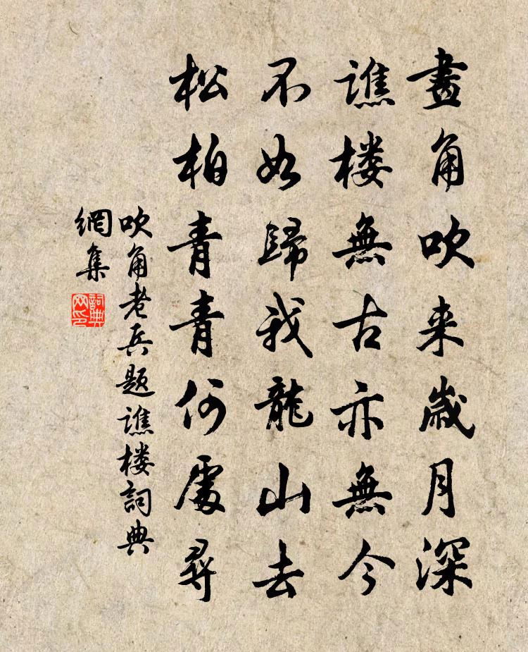 詩詞名句歷史字典書法欣賞書法字典國語詞典說文解字康熙字典古漢語字典標 題 作 者 詩 句 題譙樓作者:吹角老兵 朝代:宋代題譙樓原文畫角吹來歲月深,譙樓無古亦無今。不如歸我龍山去,松柏青青何處尋。詩詞問答問:題譙樓的作者是誰?答:吹角老兵問:題譙樓寫於哪個朝代?答:宋代吹角老兵題譙樓書法欣賞題譙樓書法作品詩詞推薦和梁簽判潁州西湖十三題臨勝閣蘇頌〔宋代〕近郭溪流一衣帶,中流鳧嶼小蓬萊。西園勝事憑高盡,到者踟躕不忍回。望水詩鮑照〔南北朝〕刷鬢垂秋日。登高觀水長。千澗無別源。萬壑共一廣。流駛巨石轉。湍回急沫上。苕苕嶺岸高。照照寒洲爽。東歸不雨裘萬頃〔宋代〕農時閱月天不雨,嘉穀叢中龜兆生。雲勢只隨風聚散,鳩聲空報客陰晴。半生憂國發欲白,一飽無期心屢驚。尚願晚晴聞角有感陸游〔宋代〕暑雨初收白帝城,小荷新竹夕陽明。十年塵土青衫色,萬里江山畫角聲。零落親朋勞遠夢,淒涼鄉社負歸耕。議郎寄李狀元鄧肅〔宋代〕渡頭送君泛小舟,絲絲細雨織寒愁。自聞君來天亦喜,急掃陰霾霽九州。聚星高會古難續,也欲從君勤秉燭。期君酬謝宣城朓詩沈約〔南北朝〕王喬飛鳧舄。東方金馬門。從宦非宦侶。避世不避諠。揆予發皇鑒。短翮屢飛翻。晨趨朝建禮。晚沐臥郊園。賓至諸人頗有和余百梅詩者各賦一首劉克莊〔宋代〕詩境千梅匝草堂,參軍今又課梅忙。懸知句子追群謝,每見鄉人說季方。處士骨寒誰得髓,老夫鼻塞尚聞香。諸君相和歌辭。長門怨沈佺期〔唐代〕月皎風泠泠,長門次掖庭。玉階聞墜葉,羅幌見飛螢。清露凝珠綴,流塵下翠屏。妾心君未察,愁嘆劇繁星。菩薩蠻蔡伸〔宋代〕杏花零落清明雨。捲簾雙燕來還去。枕上玉芙蓉。暖香堆錦紅。翠翹金鈿雀。蟬鬢慵疏掠。心事一春閒。黛眉顰遠偈頌一百四十一首釋師範〔宋代〕太白峰前收陣腳,鑑湖歸唱村田樂。無端調轉入新豐,誰知錯處非常錯。直得洞水逆流,乳峰倒卓。石女攢眉,木李參政生日魏了翁〔宋代〕天馬流行不見痕,黃鐘吹簽煦乾坤。坎離互處靈根峙,剝復機中碩果存。旦氣詩陳普〔宋代〕書氣如大霧,蒙我大明鏡。主人莫如鄉,奴柰竊權柄。不能巍巍蒞,惟聽紛紛命。是非既昧瞀,操執豈中正。不惟蟬陸九淵〔宋代〕風露枯腸里,宮商兩翼頭。壯號森木晚,清嘯茂林秋。題柴言山水陸游〔宋代〕懸水三十仞,疾雷聞數里。正暑凜生秋,倚杖者誰子?寓嘆陸游〔宋代〕事外痴頑老,人中剩長身。開顏時賴酒,閉口不言貧。淡話常終夕,閒遊動歷旬。漁翁偶相遇,疑是武陵人。棲霞寺趙伯晟〔宋代〕棲霞境界何清壯,岳立五峰如列障。三徵不復見高人,千刻尚能瞻寶相。摩空老木韻秋聲,雲屋天岩滿意行。夜闌漁家傲歐陽玄〔元代〕九月都城秋日亢。馬頭白露迎朝爽。曾向西山觀蒼莽。川原廣。千林紅葉同春賞。一本黃花金十鏹。富家菊譜簽銀與參徒辨事釋印肅〔宋代〕仲元亨老,殷勤圓淨。此中大事,雪曲高歌。騎白牛兒,漫空唱唱囉。這家也舂米,那畔爭打禾。且道乘誰力,天金橋感事吳融〔唐代〕太行和雪疊晴空,二月春郊尚朔風。飲馬早聞臨渭北,射鵰今欲過山東。百年徒有伊川嘆,五利寧無魏絳功。日暮寄任山人錢起〔唐代〕天階崇黼黻,世路有趨競。獨抱中孚爻,誰知苦寒詠。行潦難朝海,散材空遇聖。豈無鳴鳳時,其如問津命。所思名句推薦故父母、學、君三者,莫可以為治法。墨子《墨子·04章 法儀》 莊生曉夢迷蝴蝶,望帝春心托杜鵑。李商隱《錦瑟》 顛狂柳絮隨風去,輕薄桃花逐水流。杜甫《絕句漫興九首·其五》 日落謝家池館,柳絲金縷斷。韋莊《歸國遙·春欲晚》 尚想舊情憐婢僕,也曾因夢送錢財。元稹《遣悲懷三首·其二》 手種黃柑二百株,春來新葉遍城隅。柳宗元《柳州城西北隅種柑樹》 秋已無多,早是敗荷衰柳。潘希白《大有·九日》 不用憑欄苦回首,故鄉七十五長亭。杜牧《題齊安城樓》 今年游寓獨游秦,愁思看春不當春。杜審言《春日京中有懷》 把酒祝東風,且莫恁、匆匆去。王安石《傷春怨·雨打江南樹》