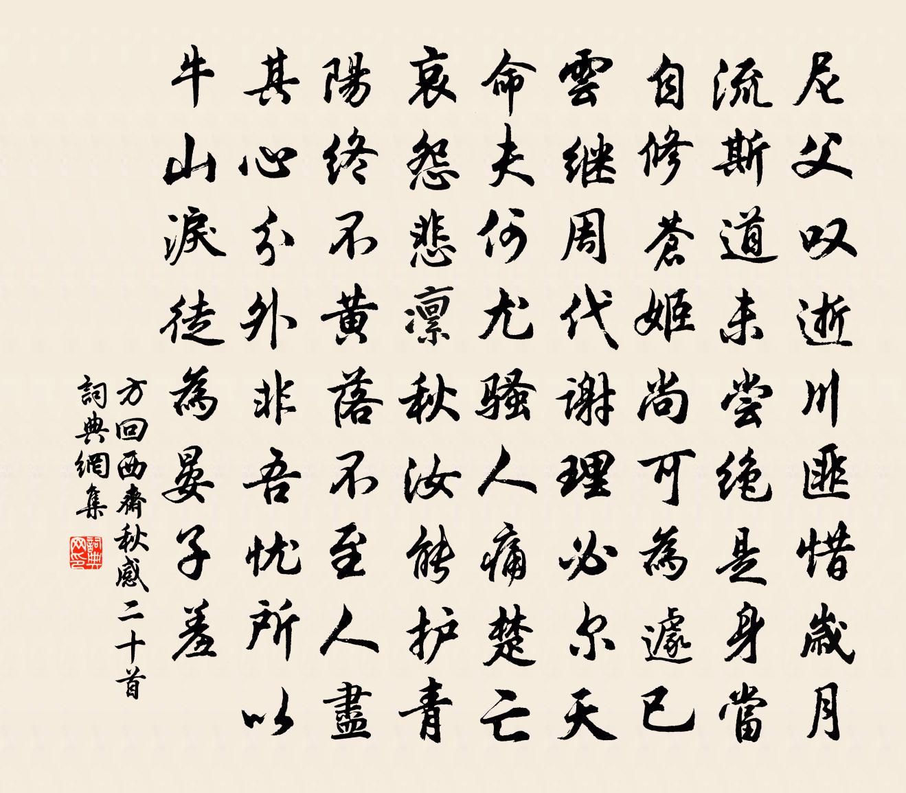 詩詞名句歷史字典書法欣賞書法字典國語詞典說文解字康熙字典古漢語字典標 題 作 者 詩 句 西齋秋感二十首作者:方回 朝代:宋代西齋秋感二十首原文尼父嘆逝川,匪惜歲月流。斯道未嘗絕,是身當自修。蒼姬尚可為,遽已雲繼周。代謝理必爾,天命夫何尤。騷人痛楚亡,哀怨悲凜秋。汝能護青陽,終不黃落不。至人盡其心,分外非吾憂。所以牛山淚,徒為晏子羞。詩詞問答問:西齋秋感二十首的作者是誰?答:方回問:西齋秋感二十首寫於哪個朝代?答:宋代方回西齋秋感二十首書法欣賞西齋秋感二十首書法作品詩詞推薦頌古八首釋如淨〔宋代〕張來張打油,李來李打油。通身骨轆轉,打得最風流。恣逍遙 贈韓守玄馬鈺〔元代〕恣意逍遙,逍遙恣意。逍遙自在無縈系。行坐逍遙,逍遙似醉。逍遙到處,似雲似水。悟徹逍遙,逍遙養氣。逍遙丙子歲三月十有二日游嵩山宿峻極中院時天氣李廌〔宋代〕穿雲上虛無,彷佛凌倒景。微茫鴻鵠背,指點眾山頂。出日上扶桑,徘徊萬林影。東軒小室即事五首曾幾〔宋代〕去聖未雲遠,故在黃卷中。孰能領其要,直用一理通。森羅廢興事,瑩若磨青銅。使我見萬古,敬謝典午公。雪中游北山呈廣州使君和叔同年王安石〔宋代〕南州歲晚亦花開,有底堪隨驛使來。看取鍾山如許雪,何須持寄嶺頭梅。梅林八景總詠葉夢鼎〔宋代〕黃墩巨海通昌國,花園大路連西域。九頃農歌樂豐年,赤山牧唱喧朝夕。羅溪流水出通潮,仕岆高山古賢跡,方寺偈六十九首釋道寧〔宋代〕叢林浩浩,誰是知音。馬祖堂中,盤山回首。雲門會裡,明教翻身。彼此一時,孰分優劣。入鄽不露跡,隨處是家卜運算元佚名〔宋代〕我有一枝花,斟我些兒酒。唯願花心似我心,歲歲長相守。滿滿泛金杯。重把花來嗅。不願花枝在我旁,付與他人送山芥與徐稚山朱翌〔宋代〕北風撼坤軸,飛雪封高崖。萬草坐凍死,不復存根荄。蔚然蒼山底,有此紫玉釵。本無塵土侵,寧畏霜霰埋。偶為次韻宇文使君山行陸游〔宋代〕城中鐵望西山,鐵爽氣固可鐵致。不如山中行,衣屨染濃翠。使君資格逸,鐵馬奏橫吹。平郊何曠盪,修竹亦清閟江南田家劉攽〔宋代〕種田江南岸,六月才樹秧。借問一何晏,再為霖雨傷。官家不愛農,農貧彌自忙。盡力泥水間,膚甲皆疥瘡。未知雜詩絕句十七首梅堯臣〔宋代〕沙頭風雨來,帖水野雲黑。如觀曹公營,萬弩射船側。聽九座鈍庵禪師端午日外堂說法詩王邁〔宋代〕人在塵中醉玉蒲,師於瓶里瀉醍醐。傳來雙徑清香遠,喚起叢森病骨蘇。炳炳毫光爭日月,琅琅舌本有江湖。他年書懷陸游〔宋代〕老人舉動須扶掖,跣婢椎奴少得閒。從此漸須都畫斷,疋如避難在空山。蝶戀花 暮春別李公擇蘇軾〔宋代〕簌簌無風花自嚲。寂寞園林,柳老櫻桃過。落日多情還照坐。山青一點橫雲破。路盡河回千轉柁。系纜漁村,月暗彭九廷評改丞衛首垂臨訪未遂馳賀輒成鄙句少強至〔宋代〕三年廷尉評,別事忽除丞。步武通規近,生涯薄俸增。翰林終必復,雅道已難能。不預聞新命,那期念舊朋。馬鞍舟過橫塘有感劉宰〔宋代〕平波淺草橫塘路,曾挽扁舟沖急雨。朱顏綠鬢氣催嵬,欲斥九關揮玉女。萬古功我付汗青,九天光寵生門戶。邯鄲山中和韻文天祥〔宋代〕白扇揮殘暑,青鞋踏嫩晴。花床尋小隱,石鼎引長鳴。紗帽有時去,酒壺惟意傾。山僧痴與坐,閒卻瘦彌明。詠史唐士恥〔宋代〕明皇固英主,開元天下昌。如何林甫輩,得產無盡殃。國色真國色,多惑四海慝。華清宮裡人如玉,解喚胡雛起東陪王明府泛舟劉長卿〔唐代〕花縣彈琴暇,樵風載酒時。山含秋色近,鳥度夕陽遲。出沒鳧成浪,蒙籠竹亞枝。雲峰逐人意,來去解相隨。名句推薦任你官清似水,難逃吏滑如油。馮夢龍《醒世恆言·卷二十》 莫笑他人老,終須還到老。佚名《增廣賢文·上集》 天街小雨潤如酥,草色遙看近卻無。韓愈《早春呈水部張十八員外 / 初春小雨 / 早春》 夕陽西下,斷腸人在天涯。馬致遠《天淨沙·秋思》 看來豈是尋常色,濃淡由他冰雪中。曹雪芹《詠紅梅花得“紅”字》 福無雙至,禍不單行。張南莊《何典·第三回》 朝為越溪女,暮作吳宮妃。王維《西施詠》 裊裊城邊柳,青青陌上桑。張仲素《春閨思》 江上月明胡雁過,淮南木落楚山多。劉長卿《江州重別薛六柳八二員外》 君子以見善則遷,有過則改。佚名《易傳·象傳下·益》