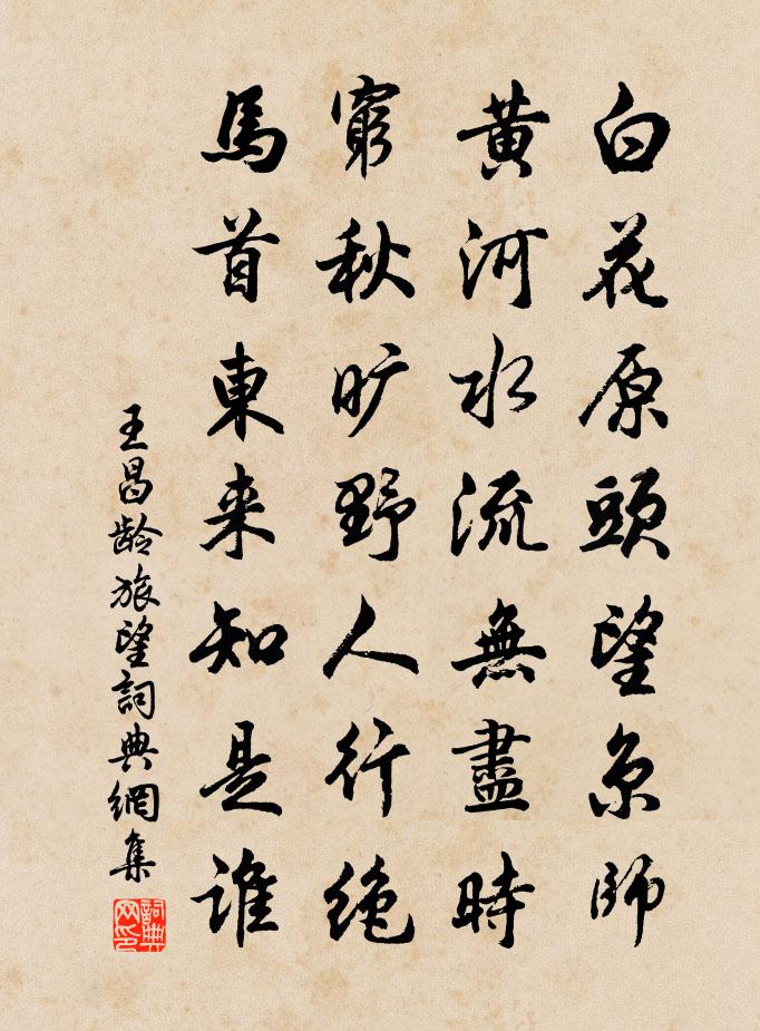 詩詞名句歷史字典書法欣賞書法字典國語詞典說文解字康熙字典古漢語字典標 題 作 者 詩 句 旅望 / 出塞行作者:王昌齡 朝代:唐代旅望 / 出塞行原文白花原頭望京師,黃河水流無盡時。窮秋曠野人行絕,馬首東來知是誰?詩詞問答問:旅望 / 出塞行的作者是誰?答:王昌齡問:旅望 / 出塞行寫於哪個朝代?答:唐代問:王昌齡的名句有哪些?答:王昌齡名句大全王昌齡旅望 / 出塞行書法欣賞旅望 / 出塞行書法作品注釋全唐詩全唐詩:卷143_66標籤:抒情詩詞推薦木蘭詞·擬古決絕詞柬友納蘭性德〔清代〕人生若只如初見,何事秋風悲畫扇。等閒變卻故人心,卻道故人心易變。驪山語罷清宵半,淚雨霖鈴終不怨。何如漁家傲蘇軾〔宋代〕臨水縱橫回晚鞚。歸來轉覺情懷動。梅笛煙中聞幾弄。秋陰重。西山雪淡雲凝凍。美酒一杯誰與共。尊前舞雪狂歌贈內李白〔唐代〕三百六十日,日日醉如泥。雖為李白婦,何異太常妻。浣溪沙朱敦儒〔宋代〕雨濕清明香火殘。碧溪橋外燕泥寒。日長獨自倚闌乾。脫籜修篁初散綠,褪花新杏未成酸。江南春好與誰看。採桑子·誰翻樂府淒涼曲納蘭性德〔清代〕誰翻樂府淒涼曲?風也蕭蕭,雨也蕭蕭,瘦盡燈花又一宵。不知何事縈懷抱,醒也無聊,醉也無聊,夢也何曾到謝與歌者何戡劉禹錫〔唐代〕二十餘年別帝京,重聞天樂不勝情。舊人唯有何戡在,更與殷勤唱渭城。庚戌歲九月中於西田獲早稻陶淵明〔魏晉〕人生歸有道,衣食固其端;孰是都不營,而以求自安。開春理常業,歲功聊可觀;晨出肆微勤,日入負耒還。山中去者日以疏佚名〔兩漢〕去者日以疏,來者日以親。出郭門直視,但見丘與墳。古墓犁為田,松柏摧為薪。白楊多悲風,蕭蕭愁 * 。思還佳人醉(雙調)柳永〔宋代〕暮景蕭蕭雨霽。雲淡天高風細。正月華如水。金波銀漢,瀲灩無際。冷浸書帷夢斷,卻披衣重起。臨軒砌。素光遙【雙調】水仙子_廉香林南園喬吉〔元代〕廉香林南園即事山中富貴相公衙,江左風流學士家,壁間水墨名人畫。六一泉陽羨茶,書齋打簇得繁華。玉龍筆架九日登山李白〔唐代〕淵明歸去來,不與世相逐。為無杯中物,遂偶本州牧。因招白衣人,笑酌黃花菊。我來不得意,虛過重陽時。題輿秋蓮劉因〔元代〕瘦影亭亭不自容,淡香杳杳欲誰通?不堪翠減紅銷際,更在江清月冷中。擬欲青房全晚節,豈知白露已秋風。盛衰滄浪亭記蘇舜欽〔宋代〕予以罪廢,無所歸。扁舟吳中,始僦舍以處。時盛夏蒸燠,土居皆褊狹,不能出氣,思得高爽虛辟之地,以舒所懷客亭杜甫〔唐代〕秋窗猶曙色,落木更天風。日出寒山外,江流宿霧中。聖朝無棄物,老病已成翁。多少殘生事,飄零似轉蓬。送劍與傅岩叟辛棄疾〔宋代〕鏌邪三尺照人寒,試與挑燈子細看。且掛空齋作琴伴,未須攜去斬樓蘭。定風波李珣〔唐代〕志在煙霞慕隱淪,功成歸看五湖春。一葉舟中吟復醉,雲水,此時方認自由身。花島為鄰鷗作侶,深處,經年不見後赤壁賦蘇軾〔宋代〕是歲十月之望,步自雪堂,將歸於臨皋。二客從予過黃泥之坂。霜露既降,木葉盡脫, 人影在地,仰見明月,顧早發白帝城 / 白帝下江陵李白〔唐代〕朝辭白帝彩雲間,千里江陵一日還。兩岸猿聲啼不盡,輕舟已過萬重山。柳營曲·嘆世馬謙齋〔元代〕手自搓,劍頻磨。古來丈夫天下多。青鏡摩挲,白首蹉跎,失志困衡窩。有聲名誰識廉頗?廣才學不用蕭何。忙忙送劉司直赴安西王維〔唐代〕絕域陽關道,胡沙與塞塵。三春時有雁,萬里少行人。苜蓿隨天馬,葡萄逐漢臣。當令外國懼,不敢覓和親。名句推薦求財恨不多,財多害自己。佚名《增廣賢文·上集》 桃李出深井,花艷驚上春。李白《中山孺子妾歌》 綠竹含新粉,紅蓮落故衣。王維《山居即事》 又是重陽近也,幾處處,砧杵聲催。秦觀《滿庭芳·碧水驚秋》 一往情深深幾許?深山夕照深秋雨。納蘭性德《蝶戀花·出塞》 驚塞雁,起城烏,畫屏金鷓鴣。溫庭筠《更漏子·柳絲長》 崑崙之高有積雪,蓬萊之遠常遺寒。王令《暑旱苦熱》 城頭鐵鼓聲猶震,匣里金刀血未乾。王昌齡《出塞二首》 長江一帆遠,落日五湖春。劉長卿《餞別王十一南遊》 憑闌半日獨無言,依舊竹聲新月似當年。李煜《虞美人·風回小院庭蕪綠》