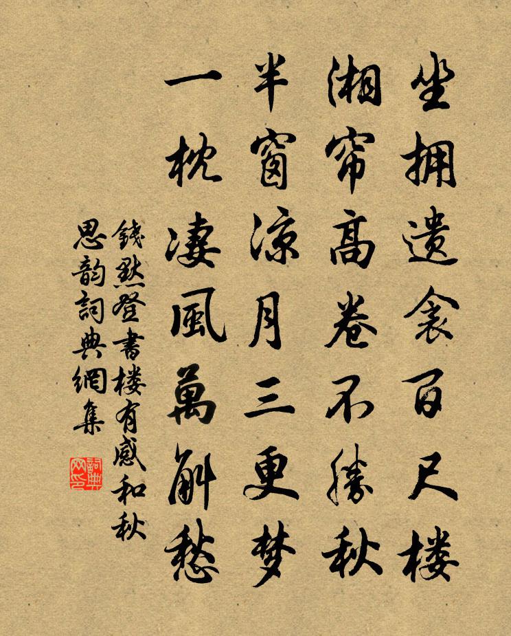 詩詞名句歷史字典書法欣賞書法字典國語詞典說文解字康熙字典古漢語字典標 題 作 者 詩 句 登書樓有感和秋思韻作者:錢默 朝代:宋代登書樓有感和秋思韻原文坐擁遺衾百尺樓,湘簾高卷不勝秋。半窗涼月三更夢,一枕淒風萬斛愁。詩詞問答問:登書樓有感和秋思韻的作者是誰?答:錢默問:登書樓有感和秋思韻寫於哪個朝代?答:宋代錢默登書樓有感和秋思韻書法欣賞登書樓有感和秋思韻書法作品詩詞推薦題束季博山園二十首垂柳牟巘五〔宋代〕是誰挼藍染,千條萬條碧。我欲問東風,東風澹無跡。老叟趙希邁〔宋代〕鬢髮如霜心未灰,尚營活計待將來。嶺頭盡日敲松子,猶向山園空處栽。元友山新山新居仇遠〔宋代〕桃柳參差出短牆,小樓突兀看湖光。出門便與青山對,讀易能消白日長。硯石洗來如玉潤,藥苗曬得似茶香。鄰僧以六經左氏傳莊子遺伯中第有詩來謝次韻樓鑰〔宋代〕書種傳來直到今,讀書幾似孝標淫。欲君終就九經庫,與子平分一片心。更向漆園窮妙旨,何殊清廟奏遺音。中郎春風鄭剛中〔宋代〕劉郎桃樹欲撓春,一夜飄零最惱人。不似窮秋作霜露,摧殘蒲柳有誰嗔。送丁端公赴河陰姚合〔唐代〕炎天木葉焦,曉夕絕涼飆。念子獨歸縣,何人不在朝。市連風浪動,帆徹海門遙。飲盡樽中酒,同年同寂寥。滿江紅佚名〔宋代〕一片閒心,髑髏子、無窮生滅。被化機搬弄,馳驟許多顛*蹶。販骨如山成底事, * 似海難超越。痛亘初、靈物西江月周紫芝〔宋代〕發白猶敧旅枕,溪深未掛煙莎。往來苕霅意如何。應有輕鷗笑我。細算年來活計,只消一個漁舟。金魚無分不須求寄於秘丞釋重顯〔宋代〕飛瀑千萬層,五月狀冰雪。將期雲霧開,永夜對孤月。句令狐楚〔唐代〕何日居三署,終年尾百僚。(見《定命錄》)。移石几回敲廢印,開箱何處送新圖。(《春明退朝錄》)。唯應四送晦庵南歸尤袤〔宋代〕二年摩手撫瘡痍,恩與廬山五老齊。合侍玉皇香案側,卻持華節大江西。鼎新白鹿諸生學,築就長虹萬丈堤。待哺句舒坦〔宋代〕宿雨閣雲千嶂碧,野花弄日一村香。紀事二十四首梁啓超〔清代〕後顧茫茫虎穴身,忍將多難累紅裙。君看十萬頭顱價,遍地鉏麑欲噬人。寄劉伯山趙蕃〔宋代〕魁梧任嘲劇,短少蓋風流。邂逅為頤解,殷勤成刺投。遙知江夏閣,不減仲宣樓。頗願相從去,湖南兵未休。夜行船周密〔宋代〕寒菊欹風棲小蝶。簾櫳靜、半規涼月。夢不分明,恨無憑據,腸斷錦箋盈篋。哀角吹霜寒正怯。倚瑤箏、暗愁誰說重寄虬上人儲光羲〔唐代〕一作雲峰別,三看花柳朝。青山隔遠路,明月空長霄。鵲浴西江雨,雞鳴東海潮。此情勞夢寐,況道雙林遙。送清演禪者釋重顯〔宋代〕我年老大,心力衰微。贈別無語,冥同振飛。因思古之送人有言,吾不知其殊途同歸。獨愛新豐,曲騰清輝。寸草寄方乾曹松〔唐代〕桐廬江水閒,終日對柴關。因想別離處,不知多少山。釣舟春岸闊,庭樹晚煙還。莫便求棲隱,桂枝堪恨顏。王忠文公輓詞樓鑰〔宋代〕梁木今其壤,誰能問大鈞。恩深兩宮賻,哀動四州民。已矣天人策,傷哉社稷臣。吾生良可恥,不及見斯人。姚江釋曇瑩〔宋代〕沙尾鱗鱗水退潮,柳行出沒見漁樵。客船自載鐘聲去,落日殘僧立寺橋。名句推薦玉階空佇立,宿鳥歸飛急。李白《菩薩蠻·平林漠漠煙如織》 一點烽傳散關信,兩行雁帶杜陵秋。陸游《秋晚登城北樓》 立身之道何窮,只得一敬字,便事事皆整。王永彬《圍爐夜話·第一六三則》 教人無處寄相思,落花芳草過前期,沒人知。孫光憲《虞美人·好風微揭簾旌起》 紅臉青腰,舊識凌波女。晏幾道《蝶戀花·笑艷秋蓮生綠浦》 秋陰不散霜飛晚,留得枯荷聽雨聲。李商隱《宿駱氏亭寄懷崔雍崔袞》 料因循誤了,殘氈擁雪,故人心眼。張炎《解連環·孤雁》 地白風色寒,雪花大如手。李白《嘲王歷陽不肯飲酒》 新知遭薄俗,舊好隔良緣。李商隱《風雨》 治國有常,而利民為本;政教有經,而令行為上。劉安及其門客《淮南子·汜論訓》