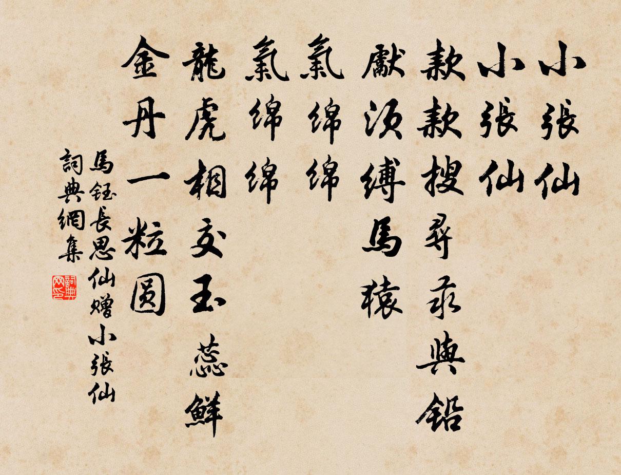詩詞名句歷史字典書法欣賞書法字典國語詞典說文解字康熙字典古漢語字典標 題 作 者 詩 句 長思仙 贈小張仙作者:馬鈺 朝代:元代長思仙 贈小張仙原文小張仙。小張仙。款款搜尋汞與鉛。先須縛馬猿。氣綿綿。氣綿綿。龍虎相交玉蕊鮮。金丹一粒圓。詩詞問答問:長思仙 贈小張仙的作者是誰?答:馬鈺問:長思仙 贈小張仙寫於哪個朝代?答:元代問:長思仙 贈小張仙是什麼體裁?答:詞馬鈺長思仙 贈小張仙書法欣賞長思仙 贈小張仙書法作品詩詞推薦贈高九萬並寄孫季蕃二首劉克莊〔宋代〕菊磵說花翁,飄蓬向浙中。無書上皇帝,有句惱天公。世事年年異,詩人個個窮。築台並下榻,今豈乏英雄。世居亭謝安之〔宋代〕後皇來何從,頓此八紘網。神皋塵冥冥,冠蓋爭勇往。研桑到白首,塞屋猶怏怏。云何石南牧,上印歸州黨。虛裝曲遊春趙功可〔宋代〕千樹玲瓏罩,正蒲風微過,梅雨新霽。客里幽窗,算無春可到,和愁都閉。萬種人生計。應不似、午天閒睡。起來次蕭饒州韻仇遠〔宋代〕謙謙賢在守,止止樂閒居。健筆凌三謝,高風繼二疏。家猶傳故笏,夢不到安車。何處溪山好,相從結草廬。端午貼子詞皇帝閣六首周麟之〔宋代〕日永三得正,風薰萬宇涼。要知垂艾意,期與庶發康。夏日過莊嚴寺寺僧索詩為留三絕拉舍弟同賦晃公休〔宋代〕病起支離倚瘦筇,幅巾芒屩竹陰中。聞蟬未有驚人句,且就禪床一榻風。菩薩蠻·渚蓮紅亂風翻張孝祥〔宋代〕渚蓮紅亂風翻雨。雨翻風亂紅蓮渚。深處宿幽禽。禽幽宿處深。澹妝秋水鑒。鑒水秋妝澹。明月思情人。情人思月定號依韻和禹玉梅堯臣〔宋代〕言出君門日,遙聞紫禁鍾。詔書中使降,駿馬上閒供。天下持平手,毫偏不置胸。文從有司較,卷是近臣封。勝陣奉酬中書相公至日圓丘攝事合於中書後閣宿齋…之作裴度〔唐代〕翼亮登三命,謨猷本一心。致齋移秘府,祗事見沖襟。皓月當延閣,祥風自禁林。相庭方積玉,王度已如金。運偶汪達可招游臧園次韻樓鑰〔宋代〕城下名園稱老懷,乳鶯飛燕共低徊。寒梅送臘曾先到,嫩綠留春喜再來。眼底芳時能幾許,樓頭衙鼓謾相催。主人偈釋谷泉〔宋代〕今朝六月六,谷泉被氣{上祝下土}。不是上天堂,便是入地獄春日書事呈歷陽縣蘇仁仲八首王之道〔宋代〕情似長江流不斷,事如芳草剗還生。此身何苦浮名絆,正擬花時取次行。頌古二十五首釋崇岳〔宋代〕不是風兮不是幡,分明裂破萬重關。誰知用盡腕頭力,惹得閒名落世間。和徐先輩秋日游涇州南亭呈三二同年姚鵠〔唐代〕多此歡情泛鷁舟,桂枝同折塞同游。聲喧島上巢松鶴,影落杯中過水鷗。送日暮鍾交戍嶺,叫雲寒角動城樓。酒酣晚歸馳道遇雨馬上作宋庠〔宋代〕朝雨雜輕霾,濃陰暮未開。天低五里霧,日晦九成台。宮溜輕淙玉,坊車小隱雷。不愁馳道遠,賓色來千槐。過鄱陽湖天晴風順楊萬里〔宋代〕湖外廬山已見招,春風好送木蘭橈。青天挾日波中浴,白晝繁星地上跳。萬頃琉璃吹一葉,半簪霜雪快今朝。廬陵比以補陀刻寄少馮有詩復答之並楊吉老釋介然吳則禮〔宋代〕吾以無作語,刊彼月面背。遣似呂南山,未要餘子會。平生太玄雄,猶有一語在。只憐粥飯和,已復不驚怪。頌古釋守緣〔宋代〕世間無物可羅籠,獨立嵯峨萬仞峰。忽若有人猛推落,騰身雲外不留縱。再次前韻廖行之〔宋代〕午日晴明軒眼力,煙浮波面融融碧。隔溪誰家雞一聲,人在叢篁更深寂。纖鱗弄暖吹波微,飢雁為作低回飛。漁翁思山居一十首思登家山林嶺李德裕〔唐代〕自知無世用,只是愛山游。舊有嵇康懶,今慚趙武偷。登巒未覺疾,泛水便忘憂。最惜殘筋力,捫蘿遍一丘。名句推薦絲槐煙柳長亭路,恨取次、分離去。惠洪《青玉案·絲槐煙柳長亭路》 念故人,千里至此共明月。寇準《踏莎行·寒草煙光闊》 我當二十不得意,一心愁謝如枯蘭。李賀《開愁歌》 誠既勇兮又以武,終剛強兮不可凌。屈原《國殤》 跨馬出郊時極目,不堪人事日蕭條杜甫《野望》 遠樹帶行客,孤城當落暉。王維《送綦毋潛落第還鄉 / 送別》 採蓮南塘秋,蓮花過人頭。佚名《西洲曲》 糟糠不飽者不務粱肉,短褐不完者不待文繡。韓非及後人《韓非子·五蠹》 去年米貴闕軍食,今年米賤大傷農。杜甫《歲晏行》 醉中渾不記,歸路月黃昏辛棄疾《臨江仙·探梅》