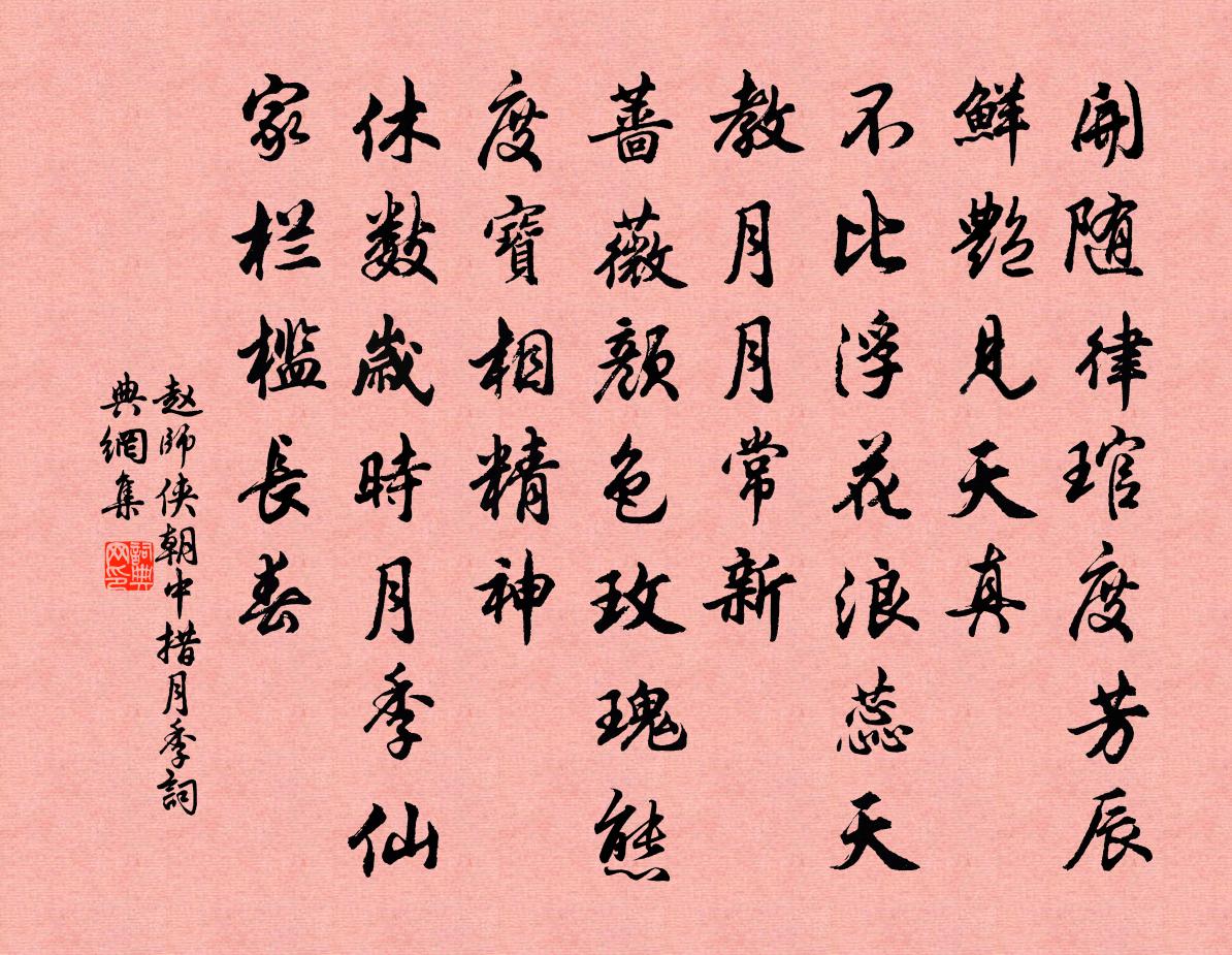 詩詞名句歷史字典書法欣賞書法字典國語詞典說文解字康熙字典古漢語字典標 題 作 者 詩 句 朝中措(月季)作者:趙師俠 朝代:宋代朝中措(月季)原文開隨律琯度芳辰。鮮艷見天真。不比浮花浪蕊,天教月月常新。薔薇顏色,玫瑰態度,寶相精神。休數歲時月季,仙家欄檻長春。詩詞問答問:朝中措(月季)的作者是誰?答:趙師俠問:朝中措(月季)寫於哪個朝代?答:宋代問:朝中措(月季)是什麼體裁?答:詞趙師俠朝中措(月季)書法欣賞朝中措(月季)書法作品詩詞推薦望蓬萊 了蟬馬鈺〔元代〕秋蟬噪,聲細又聲長。飲罷聞風聲不困,聲聲都了顯行藏。使我起悽惶。堪嗟嘆,模樣是蜣娘。尚自超然蟬退去,獵橋午憩坐睡楊萬里〔宋代〕路是山腰帶,苔為石面花。隔溪聞鳥語,疏竹見人家。雨足睛須耐,神勞睡卻佳。睡魔推不去,知我怪新茶。化僧求詩往宣城王洋〔宋代〕草鞋踏破世間塵,乞飯因緣不為身。一路春風好訊息,不知此事付何人。浣溪沙(和葆先春晚飲會)舒亶〔宋代〕金縷歌殘紅燭稀。梁州舞罷小鬟垂。酒醒還是獨歸時。畫棟日高來語燕,綺窗風暖度遊絲。幾多落葉上青枝。龍圖閣會宴應製楊億〔宋代〕冊府藏書在紫微,退朝稽古助論思。中天召宴衢樽滿,乙夜觀文列象垂。綵鳯翩翻巢綺閣,靈龜夭矯冠金碑。大風漢老弟近書雲欲看文字無暇作記者證財用韻虞儔〔宋代〕脫粟羹藜未厭餐,何必華屋薦金盤。風前覓句巾常岸,月下揮觴影亦單。懶拙不堪當世用,行藏留與後人看。也知種藥苗二首其一種甖粟蘇轍〔宋代〕老人氣衰,飲食無幾。食肉不消,食菜寡味。柳槌石缽,煎以蜜水。便口利喉,調養肺胃。道中艾性夫〔宋代〕共僧分晚供,呼渡立橋東。雁背西風緊,漁梁落照紅。雲添疏樹影,葉補敗船蓬。舊日津亭酒,黃壚蔓草中。燕燕于飛江總〔隋代〕二月春暉暉。雙燕理毛衣。銜花弄藿蘼。拂葉隱芳菲。或在堂間戲。多從幕上飛。若作仙人履。終向日南歸。西湖鄭清之〔宋代〕官程未了是敲推,課督無人只自催。不到西湖無半句,西湖端合號詩媒。左掖梨花丘為〔唐代〕冷艷金歇雪,余香乍入衣。春風且莫定,吹向玉階飛。贈洪都高士蕭野鶴蒲壽宬〔宋代〕自從華表去蹁躚,縠頂丹深不計年。萬里孤光中夜月,一聲清唳九重天。偶然夢覺思遼海,不是飢驅向野田。赤壁春秋戰國門趙宣子周曇〔唐代〕門人曾不有提彌,連嗾呀呀孰敢支。臨難若教無苟免,亂朝爭那以獒為。宮詞一百首岳珂〔宋代〕雒壇爟火夜升煙,鹵簿如雲繡色鮮。萬姓歡呼感泣,此生重遇太平年。擬古納蘭性德〔清代〕朔風吹古柳,時序忽代續。庭草萎已盡,顧視白日速。吾本落拓人,無為自拘束。倜儻寄天地,樊籠非所欲。嗟載和詠梅衛宗武〔宋代〕點檢春工首到梅,枝枝羞澀未全開。試看詩句相料理,換得清香入夢來。次韻賓暘齋中獨坐五首方回〔宋代〕誰歟載筆掌絲綸,霧雨何傷隱豹文。絕望都俞參稷契,劣能損益記周殷。蠹殘書冊猶堪覷,草沒階除盡不耘。鄭老秋風王珪〔唐代〕獵桂來鍾嶺,翍椒度漢宮。雲飛汾水闊,葉下洞庭空。海國檣帆壯,邊城鼓角雄。誰知洛陽客,歸意在江東。景德祀皇寺祗三首佚名〔宋代〕至哉厚德,陟配天長。沈潛剛克,廣大無疆。資生萬物,神化含章。同和八變,神靈郊祥。新辟小園陸游〔宋代〕東軒嫩日上疏欞,吹盡浮雲作意晴。林暖牆頭雙鵲語,水清池面小魚行。畦添藥品誰能別?架引藤陰忽已成。倚杖名句推薦待人寬一分是福,利人實利己的根基。洪應明《菜根譚·概論》 下窺指高鳥,俯聽聞驚風。岑參《與高適薛據同登慈恩寺浮圖》 玉樹猶難伸,壓倒千竿竹。環山樵《薛寶釵·雪竹》 江山代有才人出,各領風騷數百年。趙翼《論詩五首·其二》 床前明月光,疑是地上霜。李白《靜夜思》 還君明珠雙淚垂,恨不相逢未嫁時。張籍《節婦吟·寄東平李司空師道》 口之宣言也,善敗於是乎興左丘明《國語·周語·邵公諫厲王弭謗》 小立紅橋柳半垂,越羅裙颺縷金衣。納蘭性德《山花子·小立紅橋柳半垂》 名無固實,約之以命實,約定俗成,謂之實名。荀子《荀子·正名》 郵亭無人處,聽檐聲不斷,困眠初熟。周邦彥《大酺·越調春雨》