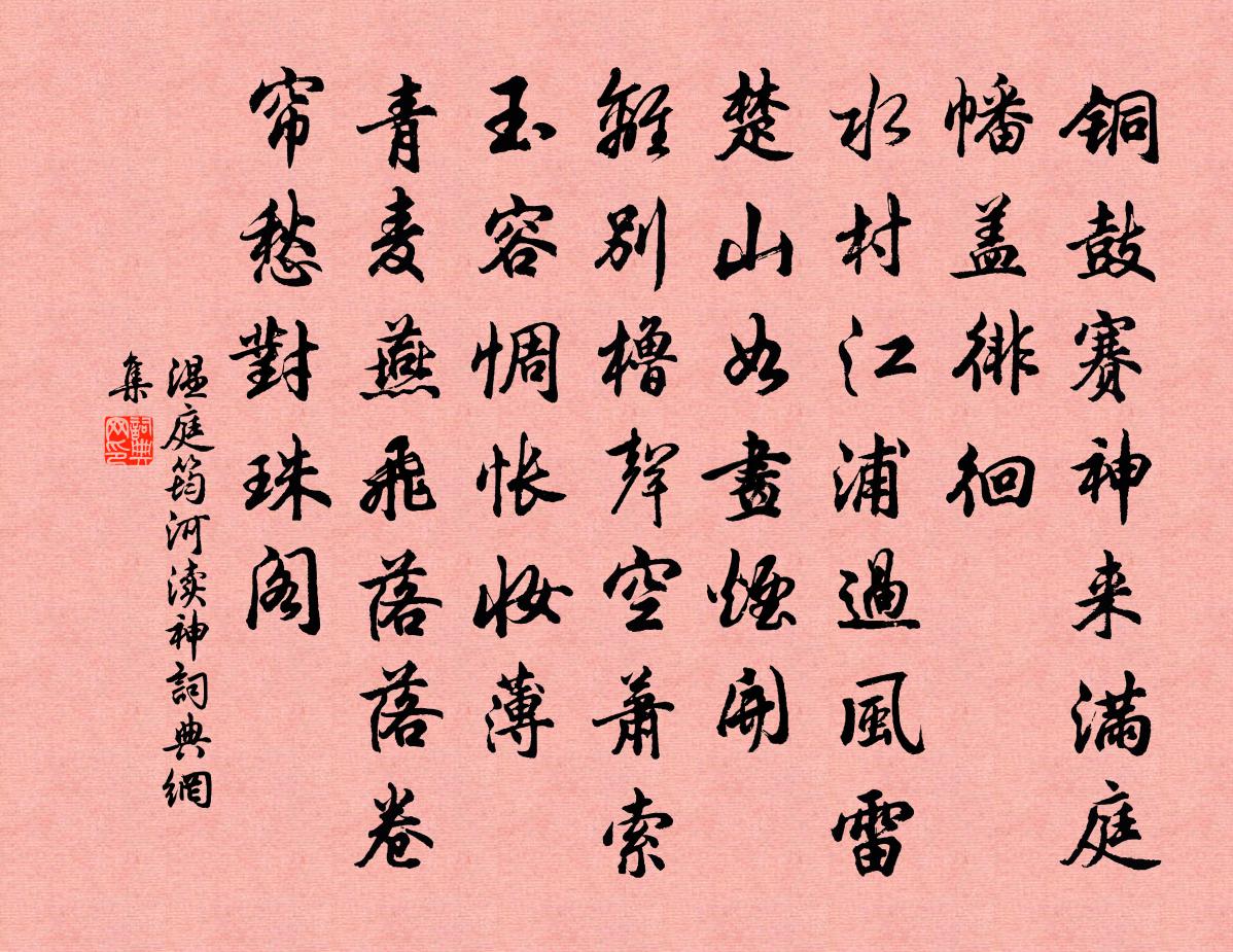 敲響銅鼓賽神來,滿庭都是幡旗,還有華村徘徊。神來去時疾鼓如風雷,一陣陣卷過山村水寨,吹開如煙的濃霧,露出楚山如畫的丰采。