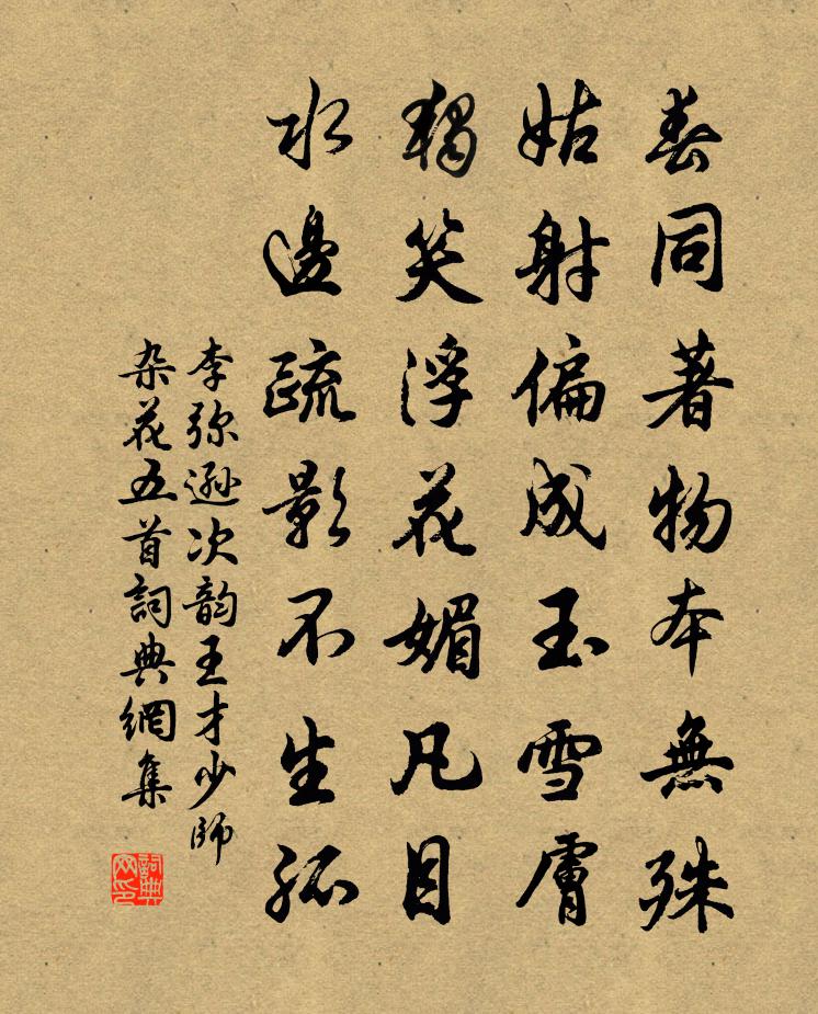 詩詞名句歷史字典書法欣賞書法字典國語詞典說文解字康熙字典古漢語字典標 題 作 者 詩 句 次韻王才少師雜花五首作者:李彌遜 朝代:宋代次韻王才少師雜花五首原文春同著物本無殊,姑射偏成玉雪膚。獨笑浮花媚凡目,水邊疏影不生孤。詩詞問答問:次韻王才少師雜花五首的作者是誰?答:李彌遜問:次韻王才少師雜花五首寫於哪個朝代?答:宋代李彌遜次韻王才少師雜花五首書法欣賞次韻王才少師雜花五首書法作品詩詞推薦景祐釋奠武成王六首佚名〔宋代〕獵涓之陽,理冥嘉應。非龍非彪,聿求元聖。平易近民,五月報政。禮典之崇,於斯為盛/孤城王安石〔宋代〕孤城回望距幾何,記得好處常經過。最思東山煙樹色,更憶南湖秋水波。百年顛倒如夢寐,萬事乖隔徒悲歌。應須居厚弟和七十四吟再賦劉克莊〔宋代〕曾厭承明儤直勞,中宵麻卷攬衣操。退閒已久袖雙手,老懶渠能注二螯。雲水生涯今易足,人天供養昔非饕。三家憶仙姿(九之九)賀鑄〔宋代〕夢想山陰遊冶。深徑碧桃花謝。曲水穩流觴,暖絮芳蘭堪藉。蕭灑。蕭灑。月棹煙蓑東下。食早荔七首劉克莊〔宋代〕薴蘿仙子絳紗裳,歲歲年年逞色香。不比阿環池上果,一千年得一番嘗。偈頌一百三十六首釋惟一〔宋代〕飛雪亭前,宜春台上。物有萬殊,春無兩樣。住不雇去底,猶欠劈面拳。去不雇住底,好與攔腮掌。直饒去住兩忘題樟林寺玉盤居士〔宋代〕千岩壁立任蒼苔,今日玉盤居士來。洗斸雲根堪宴坐,不教獨秀在天台。南鄉子晏幾道〔宋代〕何處別時難,玉指偷將粉淚彈。記得來時樓上燭,初殘。待得清霜滿畫闌。不慣獨眠寒,自解羅衣襯枕檀。百媚也飛雁王安石〔宋代〕雁飛冥冥時下泊,稻粱雖少江湖樂。人生何必慕輕肥,辛苦將身到沙漠。漢時蘇武與張騫,萬里生還值偶然。丈夫宴山亭/燕山亭曹邍〔宋代〕香月玲瓏,柔風鏤刻,嫩綠枝頭圓膩。緋桃院宇,絮柳池塘,獨立萬紅塵外。戲舞千團,訝粉羽、留連春媚。非是老病六言十首呈竹溪劉克莊〔宋代〕昔似子期善聽,今如祈父不總。怕有學人問話,向道老僧害聾。謝浩然嘗為余作異夢余再被召浩然有詩次韻復李石〔宋代〕舟楫風濤檜與松,一堂白髮幾篙工。江湖萬里吳天迥,正在巴陵日本東。贈錢道人鄧深〔宋代〕善說相傳唐世術,不言錢有晉人風。非錢可況言真寔,肯志尋常賣相同。戲次前韻寄王鞏二首蘇轍〔宋代〕細竹寒花出短{上四下離},故山耕耒手曾持。宦遊暫比鳧鷖集,歸計長遭句僂欺。歌舞夢回空歷記,友朋飛去自木犀許月卿〔宋代〕桂犀明辨不雷同,長憶先師品藻公。風到如開香積國,月明疑在廣寒宮。含香結佩風宜月,累印懷香月稱風。酒里水調歌頭(送趙閬州希異之官)魏了翁〔宋代〕凍雨洗煩濁,烈日霽威光。逸人去作太守,旗志倍精芒。莎外馬蹄香濕,柳下旟陰晨潤,景氣踏蒼蒼。夾道氣成霧丙申重九前後得今日都無病一句成十首方回〔宋代〕今日都無病,黃花酒一觴。登臨憐老者,風雨過重陽。稔歲真希有,南天始欲涼。餘生容苟活,不敢昧蒼蒼。寒夜讀書陸游〔宋代〕北窗暖焰滿爐紅,夜半濤翻古檜風。老死愛書心不厭,來生恐墮蠹魚中。漁家傲·三十年來無孔竅黃庭堅〔宋代〕三十年來無孔竅,幾回得眼還迷照。一見桃花參學了。呈法要,無弦琴上單于調。摘葉尋枝虛半老,看花特地重年次韻馬少伊、郁舜舉寄示同游石湖詩卷七首范成大〔宋代〕蕪城老蘚不知春,忽有柴門月色新。芝草琅玕無鎖鑰,自無超俗扣門人。名句推薦不以規矩,不能成方圓孟子《孟子·離婁章句上·第一節》 候館梅殘,溪橋柳細。歐陽修《踏莎行·候館梅殘》 灞橋煙柳,曲江池館,應待人來。陸游《秋波媚·七月十六日晚登高興亭望長安南山》 如何亡國恨,盡在大江東!屈大均《秣陵》 甚獨抱清高,頓成淒楚。王沂孫《齊天樂·蟬》 桃花流水窅然去,別有天地非人間。李白《山中問答》 天山三丈雪,豈是遠行時。李白《獨不見》 梅子金黃杏子肥,麥花雪白菜花稀。范成大《四時田園雜興·其二》 風定落花深,簾外擁紅堆雪。李清照《好事近·風定落花深》 春路雨添花,花動一山春色。秦觀《好事近·夢中作》