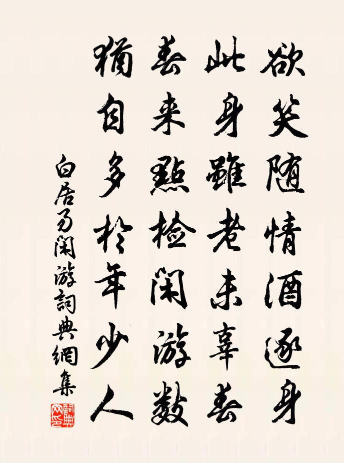 詩詞名句歷史字典書法欣賞書法字典國語詞典說文解字康熙字典古漢語字典標 題 作 者 詩 句 閒遊作者:白居易 朝代:唐代閒遊原文欲笑隨情酒逐身,此身雖老未辜春。春來點檢閒遊數,猶自多於年少人。詩詞問答問:閒遊的作者是誰?答:白居易問:閒遊寫於哪個朝代?答:唐代問:白居易的名句有哪些?答:白居易名句大全白居易閒遊書法欣賞閒遊書法作品注釋全唐詩:卷462-34詩詞推薦贈劉琨詩二十首 十七盧諶〔魏晉〕先民頤意。潛山隱几。仰熙丹崖。俯澡綠水。無求於和。自附眾美。慷慨遐蹤。有愧高旨。郊廟歌辭。周郊祀樂章。治順樂佚名〔唐代〕羽衛離丹闕,金軒赴泰壇。珠旗明月色,玉佩曉霜寒。黼黻龍衣備,琮璜寶器完。百神將受職,宗社保長安。用元韻答李郎中王炎〔宋代〕冰玉談清洗老懷,興濃亦覆手中杯。平生蠟屐登山慣,豈必因花特地來。華城西北雉堞最高崔相公首創樓台錢左丞繼種…悵然成詠白居易〔唐代〕高居稱君子,瀟灑四無鄰。丞相棟樑久,使君桃李新。凝情看麗句,駐步想清塵。況是寒天客,樓空無主人。幽趣十二首鄭剛中〔宋代〕幽趣無人會,閒中見物天。綠虛甘露結,紅皺水晶圓。倒孕潛資化,成行出暮膻。寰中無巨細,動靜各隨緣。同嚴逸人東溪泛舟錢起〔唐代〕子陵江海心,高跡此閒放。漁舟在溪水,曾是敦夙尚。朝霽收雲物,垂綸獨清曠。寒花古岸傍,唳鶴晴沙上。紛吾思隱二首董嗣杲〔宋代〕夢落家村野屋磯,欲治生事與心違。偃禾雨久溪聲改,採菊人歸鬢色非。灌圃肯差陳仲子,登山莫遜謝玄暉。從今和人秋歸終南山別業錢起〔唐代〕舊居三顧後,晚節重幽尋。野逕到門盡,山窗連竹陰。昔年鶯出谷,今日鳳歸林。物外凌雲操,誰能繼此心。送王廣淵司門出守絳州蘇頌〔宋代〕仕宦人言為郡樂,名藩古有絳台雄。居園幽絕刻樊記,分國盛強歌晉風。歷覽勝游千騎上,坐頒仁政兩河中。當年丘慶餘畫兔周文璞〔宋代〕家住棲賢雲,泉石恣幽討。寫出明視孫,眉目增媚好。卯日行踆踆,衣褐坐芳草。脫身文字禍,見機恨不早。仰候夏日偕友晚步飲聽泉軒周權〔元代〕終日局環堵,散策窮深幽。嘉我二三子,落落誠罕儔。適意隨所詣,行行遂經丘。青松如高人,含風自蕭颼。夕雲次呂之壽韻寄肯體丘葵〔宋代〕甚矣吾衰也,時哉道亦然。詩書輿脫輹,歲月箭辭弦。所欠惟一死,期須便百年。細思禽與犢,等是食和眠。泊慈湖北岸陳造〔宋代〕坐覺江流平,漶漫裂三股。舟子告風橫,因循宿中浦。慈湖古戍近,猶復小江阻。漁翁家葦間,蝸舍無鄰伍。把酒送杜陽安奉親還蜀二首洪咨夔〔宋代〕訪落方勤止,而翁苦掉頭。立幾遺世獨,行盍為王留。日月馳雙轂,乾坤寄一舟。勿緣歸計得,忘卻緯邊憂。連夜書方回〔宋代〕秋涼斷是合還家,三伏今年暑倍加。病痛百般營藥草,精神一半減菱花。宴楊駙馬山亭(一作朱灣詩)朱灣〔唐代〕垂楊拂岸草茸茸,繡戶窗前花影重。鱠下玉盤紅縷細,酒開金瓮綠醅濃。中朝駙馬何平叔,南國詞人陸士龍。落日北行第九十五文天祥〔宋代〕遊子無根株,世梗悲路澀。關山雪邊看,愁思胡笳夕。縛雞行杜甫〔唐代〕小奴縛雞向市賣,雞被縛急相喧爭。家中厭雞食蟲蟻,不知雞賣還遭烹。蟲雞於人何厚薄,吾叱奴人解其縛。雞蟲五更仇遠〔宋代〕醜夜方向寅,被衾冷如鐵。江南貧者多,奈此霜加雪。漫書呈仲謀黃庭堅〔宋代〕漫來從宦著青衫,秣馬何嘗解轡銜。眼見人情如格五,心知外物等朝三。經時道上衝風雨,幾日樽前得笑談。賴有名句推薦催成清淚,驚殘孤夢,又揀深枝飛去。陸游《鵲橋仙·夜聞杜鵑》 相顧無相識,長歌懷採薇。王績《野望》 谷不熟為飢,蔬不熟為饉,果不熟為荒,仍飢為薦。佚名《爾雅·釋天》 簾外雨潺潺,春意闌珊。李煜《浪淘沙令·簾外雨潺潺》 不及夜台塵土隔,冷清清、一片埋愁地納蘭性德《金縷曲·亡婦忌日有感》 人間四月芳菲盡,山寺桃花始盛開。白居易《大林寺桃花》 輕解羅裳,獨上蘭舟。李清照《一剪梅·紅藕香殘玉簟秋》 長者立,幼勿坐。長者坐,命乃坐。李毓秀《弟子規·出則弟》 明朝且做莫思量,如何過得今宵去。周紫芝《踏莎行·情似遊絲》 夜發清溪向三峽,思君不見下渝州。李白《峨眉山月歌》