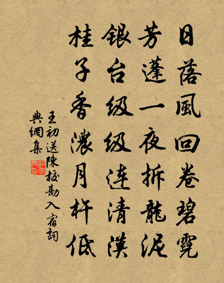 詩詞名句歷史字典書法欣賞書法字典國語詞典說文解字康熙字典古漢語字典標 題 作 者 詩 句 送陳校勘入宿作者:王初 朝代:唐代送陳校勘入宿原文日落風回卷碧霓,芳蓬一夜拆龍泥。銀台級級連清漢,桂子香濃月杵低。詩詞問答問:送陳校勘入宿的作者是誰?答:王初問:送陳校勘入宿寫於哪個朝代?答:唐代問:送陳校勘入宿是什麼體裁?答:七絕王初送陳校勘入宿書法欣賞送陳校勘入宿書法作品注釋全唐詩:卷491-24詩詞推薦留別僧訥賀鑄〔宋代〕冗從西班誰比數,牛儈馬醫猶爾汝。詩解窮人未必工,苦調酸聲效梁父。滎陽道人方外交,謂我有言追屈騷。驪珠王寶謨輓詩魏了翁〔宋代〕滬江鮫夜泣,柳廟鶴秋飛。零露傷蘭穎,淒風撼王徽。焄蒿恍兮惚,精爽是邪非。豈必存亡問,吾知全以歸。和王尉早梅二首舒坦〔宋代〕霜林盡處碧溪傍,小露檀心媚夕陽。天下三春無正色,人間一味有真香。相思誰向風前寄,趁早先從雪後芳。朝夕入書室東垣有神光自几案出三首羅公升〔宋代〕若以俗眼觀,榮枯幾翻手。若以法眼觀,窮達竟何有。吾身以覺贅,身外安足守。若□謝□□,為我作不朽。酬別留後侍郎(蔡平,命馬總為留後)韓愈〔唐代〕為文無出相如右,謀帥難居郤縠先。歸去雪銷溱洧動,西來旌旆拂晴天。為向子諲寫卦影並題狄偁〔宋代〕水畔幡竿險,分符得異恩。潮回波似鏡,聊以寄君身。挽李樓山觀文三首李曾伯〔宋代〕相從劍南幕,公壯我丁年。寘彼諸生後,薦之明主前。承顏台袞近,托跡午橋邊。壤廈千秋隔,潸然老淚漣。賞菊四首楊萬里〔宋代〕菊生不是遇淵明,自是淵明遇菊生。歲晚霜寒心獨苦,淵明元是菊花精。死別離方維儀〔清代〕昔聞生別離,不聞死別離。無論生與死,我獨身當之。 北風吹枯桑,日夜為我悲。上視滄浪天,下無黃口兒。人清平樂(絳河清)毛滂〔宋代〕絳河千歲。一照昇平事。萬里青銅開碧霽。俯見南山晚翠。紺寒不翅湘酃。清於練靜江澄。流向萬年觴里,玉波可題章和甫釣亭放言黃庭堅〔宋代〕斬木開亭,卻倚石壁。寒潭百雷,古木千尺。觀魚樂而相忘,聽鳥啼而自得。去而之京洛之間數年,猶常夢嶄岩之相和歌辭長門怨劉言史〔唐代〕獨坐爐邊結夜愁,暫時恩去亦難留。手持金箸垂紅淚,亂撥寒灰不舉頭。多景樓汪元量〔宋代〕多景樓中晝掩扉,畫梁不敢住烏衣。禪房花木兵燒殺,佛寺干戈僧怕歸。山雨欲來淮樹立,潮風初起海雲飛。酒尊楊郡王輓詞二首釋寶曇〔宋代〕乞得身閒日,仍煩臥護歸。將軍三尺箠,天子一戎衣。生死真談笑,功名愈發揮。西風卷丹旐,人淚濕斜暉。宮怨任翻〔唐代〕淚乾紅落臉,心盡白垂頭。自此方知怨,從來豈信愁。春雨示鄰曲陸游〔宋代〕春來天氣苦蕭森,如縷雲升便作霖。寒溜何曾住一滴,綠陰忽已遍千林。蒪絲箭茁垂垂老,蓼浦菱塘灩灩深。聞道如大坂二絕王炎〔宋代〕輕風掠面作微涼,盡日筍輿行澗岡。畦稻欲花新得雨,老農屈指計秋嘗。觀獵李白〔唐代〕太守耀清威,乘閒弄晚暉。江沙橫獵騎,山火繞行圍。箭逐雲鴻落,鷹隨月兔飛。不知白日暮,歡賞夜方歸。恭進度宗皇帝輓詞馬廷鸞〔宋代〕道遠年何駛,民肥身獨癯。寶龜傳聖子,玉幾導宸謨。百世尊王度,千秋拱帝圖。孤臣斬舜輔,悉絕望蒼梧。夜過五牧楊萬里〔宋代〕船頭更鼓打兩聲,如何未到常州城。道旁火炬如晝明,道上牽夫如蟻行。今宵到得荊溪館,我欲眠時夜還短。明朝名句推薦攜籮驅出敢偷閒,雪脛冰須慣忍寒。范成大《雪中聞牆外鬻魚菜者求售之聲甚苦有感》 九萬里風鵬正舉。李清照《漁家傲·天接雲濤連曉霧》 細柳開營揖天子,始知灞上為嬰孩李白《司馬將軍歌》 來說是非者,便是是非人。佚名《增廣賢文·上集》 卻將萬字平戎策,換得東家種樹書。辛棄疾《鷓鴣天·有客慨然談功名因追念少年時事戲作》 治大者不治細,成大功者不成小列子及其弟子《列子·楊朱》 文章是山水化境,富貴乃煙雲幻形。王永彬《圍爐夜話·第一二二則》 素臣稱有道,守在於四夷。田錫《塞上曲》 傷情燕足留紅線,惱人鸞影閒團扇。張可久《塞鴻秋·春情》 千錘萬鑿出深山,烈火焚燒若等閒。于謙《石灰吟》