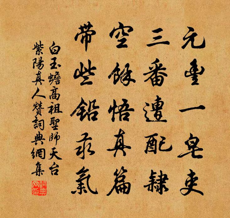 詩詞名句歷史字典書法欣賞書法字典國語詞典說文解字康熙字典古漢語字典標 題 作 者 詩 句 高祖聖師天台紫陽真人贊作者:白玉蟾 朝代:宋代高祖聖師天台紫陽真人贊原文元豐一皂吏,三番遭配隸。空餘悟真篇,帶些鉛汞氣。詩詞問答問:高祖聖師天台紫陽真人贊的作者是誰?答:白玉蟾問:高祖聖師天台紫陽真人贊寫於哪個朝代?答:宋代問:高祖聖師天台紫陽真人贊是什麼體裁?答:五絕白玉蟾高祖聖師天台紫陽真人贊書法欣賞高祖聖師天台紫陽真人贊書法作品詩文賞析原註:姓張,諱伯端,一名用成,字平叔詩詞推薦又又空舍封書篋,陸游〔宋代〕貧知藜糝美,渴愛粟漿酸。食少從奴去,人稀苦屋寬。宇文袞臣吏部予在蜀日與之游至厚契闊死生二陸游〔宋代〕英姿爽氣宇邛州,雖古人中豈易求。六月長途將暍死,一天風雹起龍湫。臨江仙(杜安人生日)魏了翁〔宋代〕九十秋光三十八,新居初度稱觴。青衫彩服列郎娘。孫枝無處著,猶欠兩東床。儘是當年親手種,如今滿院芬芳。書事陶夢桂〔宋代〕有書有史聊遮眼,半瓦半茅還是家。莫道幽人無受用,銅瓶遍插木犀花。奉贈李八丈判官(曛)杜甫〔唐代〕我丈時英特,宗枝神堯後。珊瑚市則無,騄驥人得有。早年見標格,秀氣沖星斗。事業富清機,官曹正獨守。頃來送房處士閒遊李群玉〔唐代〕採藥陶貞白,尋山許遠遊。刀圭藏妙用,岩洞契冥搜。花月三江水,琴尊一葉舟。羨君隨野鶴,長揖稻粱愁。和僕射二十四丈牡丹八韻徐夤〔唐代〕帝王城裡看,無故亦無新。忍摘都緣借,移栽未有因。光陰嫌太促,開落一何頻。羞殺登牆女,饒將解佩人。蕊堪潤州釋輝〔宋代〕北固樓前一笛風,斷雲飛出建章宮。江南二月多芳草,春在濛濛細雨中。聖人之孝十首孔子林同〔宋代〕事親良不易,戰戰復兢兢。學得如夫子,猶言丘未能。泛江送客杜甫〔唐代〕二月頻送客,東津江欲平。煙花山際重,舟楫浪前輕。淚逐勸杯下,愁連吹笛生。離筵不隔日,那得易為情。問秋光白居易〔唐代〕殷卿領北鎮,崔尹開南幕。外事信為榮,中懷未必樂。何如不才者,兀兀無所作。不引窗下琴,即舉池上酌。淡交自詠陸游〔宋代〕食飲從來戒失時,衣裘亦復要隨宜。老人最索調停處,正在初寒與半飢。醉中作陸游〔宋代〕駕鶴孤飛萬里風,偶然來憩大峨東。持杯露坐無人會,要看青天入酒中。游峴山次韻三首陳與義〔宋代〕高人買山隱,百萬猶恨少。客兒最省事,有屐一生了。東莊良不遙,十里望縹緲。縈紆並麥壠,翠浪四山繞。先生尋山於鄴〔唐代〕到此絕車輪,萋萋草樹春。青山如有利,白石亦成塵。水闊應無路,松深不見人。如知巢與許,千載跡猶新。武昌懷古宋慶之〔宋代〕極目平蕪送落暉,六朝征戰尚依稀。風生戰舸周郎過,月落南樓庾老歸。秋塞戌閒番馬病,春江流下蜀魚肥。神州賢者之孝二百四十首子貢林同〔宋代〕未須論大塊,以死息乎人。所願學賜也,姑惟息事親。十三夜風雨作暑氣頓盡明日與晁郎小飲張耒〔宋代〕雨洗風掃除,老火不復燎。蓐收行正令,一夕清八表。衰骸困燒煮,魂魄始可招。東窗美一睡,燈火清自照。銀河讀素問十六首方回〔宋代〕凡火以水沃,無不立銷滅。龍火行雨中,沃水乃愈烈。甚者則從之,不以寒治熱。後主先所因,神聖有祠訣。寄賈元鎮並問楊似賢譚德稱李石〔宋代〕客子推移地,聞雞敢晏眠。酒樓春夜雨,柳岸早行天。龍臥風雷宅,蠶叢綿繡川。譚楊兩州教,記我別時年。名句推薦青山一道同雲雨,明月何曾是兩鄉。王昌齡《送柴侍御》 樹大招風風撼樹,人為名高名喪人。吳承恩《西遊記·第三十三回》 世人結交須黃金,黃金不多交不深。張謂《題長安壁主人》 無數春筍滿林生,柴門密掩斷行人。杜甫《詠春筍》 挽弓當挽強,用箭當用長。杜甫《前出塞九首》 惜衣有衣,惜食有食。馮夢龍《警世通言·卷三》 本來無一物,何處惹塵埃!惠能《菩提偈》 處顛者危,勢豐者虧。王充《論衡·卷一·累害篇》 黃衫飛白馬,日日青樓下。陳克《菩薩蠻·赤闌橋盡香街直》 燕子不歸春事晚,一汀煙雨杏花寒。戴叔倫《蘇溪亭》