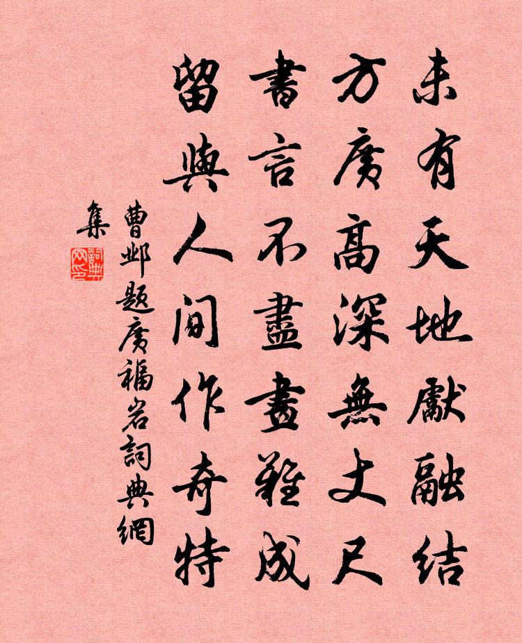 詩詞名句歷史字典書法欣賞書法字典國語詞典說文解字康熙字典古漢語字典標 題 作 者 詩 句 題廣福岩作者:曹鄴 朝代:唐代題廣福岩原文未有天地先融結,方廣高深無丈尺。書言不盡畫難成,留與人間作奇特。詩詞問答問:題廣福岩的作者是誰?答:曹鄴問:題廣福岩寫於哪個朝代?答:唐代問:題廣福岩是什麼體裁?答:七古曹鄴題廣福岩書法欣賞題廣福岩書法作品注釋全唐詩詩詞推薦頌古二首釋曇瑩〔宋代〕溪山盡處夕陽斜,溪上冬風雪滿沙。便是江南舊行路,和煙隔水見梅華。頌四賓主釋印肅〔宋代〕直下無君迴避處,聲色全彰第一義。取相凡夫承不知,頓悟圓音方了利。臨江仙(訪梅)劉辰翁〔宋代〕西曲罥衣迷去路,雪銷斷岸無痕。尋花不擬到前村。暖風初轉袖,小徑忽開門。卻憶臨塘橋下馬,暗香不是黃昏。賦雙松堂王柏〔宋代〕和平堂前列四皓,雙松為主雙檜賓。深山大澤不肯住,鞭霆駕雨來重闉。蒼髯梳風音瑟瑟,霜皮凝雪冰粼粼。靜有清心鏡 因何先生往寧海,作詞以寄鄉人馬鈺〔元代〕勸鄉人,當省悟。浮利浮名,不堅不固。妻男是、走骨行屍,自身是臭腐。早因頭,投真趣。學取馬風,樂然歸去和董伯玉不向東山久韻吳芾〔宋代〕讀書想前人,往往得師友。每愛釣渭濱,頗喜耕谷口。夫豈與世違,甘心臥岩藪。升沉自有時,此意君知不。鷓鴣天·搭柳欄乾倚佇史達祖〔宋代〕搭柳欄乾倚佇頻,杏簾胡蝶繡床春。十年花骨東風淚,幾點螺香素壁塵。簫外月,夢中雲,秦樓楚殿可憐身。新愁送石昌言知宿州蔡襄〔宋代〕符離封城古雲望,扼控東南地形壯。飛流金粟走舟車,鎮壓奸雄宿兵仗。昌言才思老台閣,聲名遠出風騷將。倦直祝牛宮辭陸龜蒙〔唐代〕四牸三牯,中一去乳。天霜降寒,納此室處。老農拘拘,度地不畝。東西幾何,七舉其武。南北幾何,丈二加五。郡中每晨興輒見群鶴東飛至暮又行列而返…所羨遂賦以詩張九齡〔唐代〕雲間有數鶴,撫翼意無違。曉日東田去,煙霄北渚歸。歡呼良自適,羅列好相依。遠集長江靜,高翔眾鳥稀。豈煩寄題夏椿年賞桂樓曾豐〔宋代〕廣寒韻度中央質,故侍仙娥新見黜。高天委氣得金行,平地披身成玉立。月下風前為誰香,諸郎一詠翁一觴。功成秋夜齋中陸游〔宋代〕殘年冉冉返丘園,敗屋蕭蕭長子孫。久悔文辭妨大學,偶因憂患得玄門。扶持後死知天幸,容養無能荷國恩。急雨老學庵北窗雜書陸游〔宋代〕茅齋遙夜養心君,靜處工夫自策勛。正喜殘香伴幽獨,鴉鳴窗白又紛紛。次韻致遠木人洲二首王安石〔宋代〕杌爾何年客此洲,飄流誰棄止誰收。無心使口肝使目,有乾作身根作頭。暴露神靈難寄託,禱祠村落幾依投。紛紛建康道中方回〔宋代〕土入江東厚,民方浙右醇。疏鬆岡路雪,晴麥野田春。往事更離亂,衰年厭苦辛。興亡不須嘆,請看石麒麟。次鄒希賢買魚不得三首衍為漁翁問答六詩漁姚勉〔宋代〕游魚驚餌總沉淵,一任攜竿晚立船。今世有錢人總愛,漁翁豈獨不貪錢。秋晚寓嘆陸游〔宋代〕幽夢雞呼覺,孤愁雨滴成。天高那可問,年往若為情?孱虜猶遺育,神州未削平。登高西北望,衰涕對誰傾?送二友游湘中黃滔〔唐代〕千里楚江新雨晴,同征肯恨跡如萍。孤舟泊處聯詩句,八月中旬宿洞庭。為客早悲菸草綠,移家晚失岳峰青。今來苦寒孔武仲〔宋代〕十年被冷東南方,未慣清寒客帝鄉。碧落有聲飛夜霰,輕裘無力拒晨霜。鯨依海凍先摧鬣,雁起邊沙易失行。蒲柳范致能以詩求二色桃再次韻二首周必大〔宋代〕霓裳舞罷醉流霞,翠袖頻揎眼欲花。丈室蕭然那用此,春深料得客思家。名句推薦繁華事散逐香塵,流水無情草自春。杜牧《金谷園》 野老念牧童,倚杖候荊扉。王維《渭川田家》 登高壯觀天地間,大江茫茫去不還。李白《廬山謠寄盧侍御虛舟》 苦心豈免容螻蟻,香葉終經宿鸞鳳。杜甫《古柏行》 十年驅馳海色寒,孤臣於此望宸鑾。戚繼光《望闕台》 雨過橫塘水滿堤,亂山高下路東西。曾鞏《城南·雨過橫塘水滿堤》 邊蛇口中草,蠍子尾後針。馮夢龍《警世通言·卷二十五》 綠葉紫裹,丹莖白蒂。宋玉《高唐賦》 夢後樓台高鎖,酒醒簾幕低垂。晏幾道《臨江仙·夢後樓台高鎖》 墦間人散後,烏鳥正西東。范成大《清明日狸渡道中》