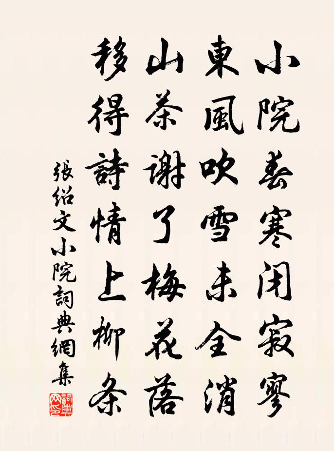 詩詞名句歷史字典書法欣賞書法字典國語詞典說文解字康熙字典古漢語字典標 題 作 者 詩 句 小院作者:張紹文 朝代:宋代小院原文小院春寒閉寂寥,東風吹雪未全消。山茶謝了梅花落,移得詩情上柳條。詩詞問答問:小院的作者是誰?答:張紹文問:小院寫於哪個朝代?答:宋代張紹文小院書法欣賞小院書法作品詩詞推薦經陸補闕隱居綦毋潛〔唐代〕不敢要君征亦起,致君全得似唐虞。讜言昨嘆離天聽,新象今聞入縣圖。琴鎖壞窗風自響,鶴歸喬木隱難呼。學書奉楊公近蒙答四六狀極為精麗晁說之〔宋代〕博物張公適聖神,經營佐國不謀身。一槍採擷朝林下,八駿遨遊暮海濱。詩就秦州寧獨樂,政成周道要相親。敗軍巋然亭錢時〔宋代〕西山紫翠入層霄,老木塵風萬竅號。會得此時亭上意,巍然非下亦非高。晚春戴復古〔宋代〕池塘渴雨蛙聲少,庭院無人燕語長。午枕不成春草夢,落花風靜煮茶香。將使送玉堂春花江南竹筍次韻二絕王炎〔宋代〕此君長得籜龍兒,不為供人口腹資。養就翠梢如結實,來儀當有鳳師師。梅花樹下讀高兄詩蘇泂〔宋代〕尋思秘閣賢郎樣,一似梅花帶竹枝。每到君邊作梅想,卻來梅下讀君詩。崇奎堂暖春風候,射的山寒夜雪時。安得虞美人趙長卿〔宋代〕燈前忍見啼紅面。別酒頻斟勸。愁蛾斂翠不勝情。報導看看天色、待平明。殷勤重把陽關唱。休要教人望。出門猶端午帖子太上皇后閣周必大〔宋代〕瑞雀巢珍木,雙雙枕石圓。翠娥誰採得,傳旨賜金錢。和因上人三首王之道〔宋代〕歸騎何時遂到家,蒼頭獵獵走風車。醜妻終勝長為客,薄酒能無更飲茶。夢斷北窗涼似水,望中南畝雨飛花。採蓮高陽台王觀〔宋代〕紅入桃腮,青回柳眼,韶華已破三分。人不歸來,空教草怨王孫。平明幾點催花雨,夢半闌、欹枕初聞。問東君,賀聖朝佚名〔宋代〕白 * ,曉星明滅,秋風落葉。故址頹垣,冷煙衰草,前朝宮闕。長安道上行客,依舊利深名切。改變容顏,消磨吳興三絕張文規〔唐代〕蘋洲須覺池沼俗,薴布直勝羅紈輕。清風樓下草初出,明月峽中茶始生。吳興三絕不可舍,勸子強為吳會行。和徐季功舒蘄道中二十首王之道〔宋代〕光風習習日暉暉,墮絮飛紅積漸稀。芍藥酴醿看正好,一尊能共送春歸。臨江仙 壽黃鎮撫王旭〔元代〕莫怪今年秋色晚,黃花留過重陽。要隨仙客九霞觴。助添無量壽,滿意泛清香。富貴功名天已了,何須更問行藏。聞鶯姚勉〔宋代〕風吹微湍入松篁,雲幢葉蓋相低昂。山禽此時似得意,雜奏一曲娛新涼。流鶯頗嫌無宮商,飛來中間作笙簧。廣寒長思仙侯善淵〔元代〕這頭起,那頭行。面門出入任縱橫。現天光,一點星。真實相,本無形。無形之體自然明。現寥陽,入大成。揖翠軒朱翌〔宋代〕篛笠蓑衣一葉舟,西風吹我與同游。洋洋盈耳松聲亂,亹亹逼人山翠浮。講罷已聞花雨落,心清暗與妙香投。道人次韻單君范行李中諸詩前數章自道後二章為單陳著〔宋代〕心如古井不生瀾,無奈形骸寄兩閒。老境陽春亦風雪,危時明月自江山。琴書有舊聊相與,門戶雖貧未是閒。兒女通源驛別顏茂才蔡襄〔宋代〕躍馬東來不記時,酒醒寒色入征衣。垂楊官道連天去,落日郵亭別我歸。寧宗登門肆赦二首佚名〔宋代〕天日清晏,朝野靖安。三靈答祉,萬國勝歡。帝命不達,王業艱難。天子萬年,永迪監觀。名句推薦洛陽城東西,長作經時別。范雲《別詩》 夫治身與治國,一理之術也。呂不韋《呂氏春秋·覽·審分覽》 昨夜星辰昨夜風,畫樓西畔桂堂東。李商隱《無題·昨夜星辰昨夜風》 念天地之悠悠,獨愴然而涕下。陳子昂《登幽州台歌》 舜其大知也與!舜好問而好察邇言。隱惡而揚善。子思《中庸·第六章》 日中則移,月滿則虧。劉向《戰國策·秦三·蔡澤見逐於趙》 輕淘起,香生玉塵,雪濺紫甌圓。米芾《滿庭芳·詠茶》 取酒須勤醉,鄉關不可思。司馬光《送張寺丞覲知富順監》 山遠近,路橫斜,青旗沽酒有人家。辛棄疾《鷓鴣天·陌上柔桑破嫩芽》 讀書破萬卷,下筆如有神。杜甫《奉贈韋左丞丈二十二韻》
