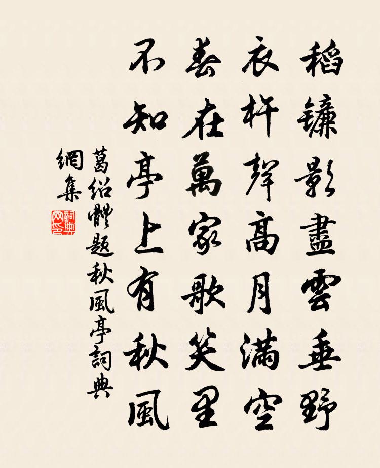 詩詞名句歷史字典書法欣賞書法字典國語詞典說文解字康熙字典古漢語字典標 題 作 者 詩 句 題秋風亭作者:葛紹體 朝代:宋代題秋風亭原文稻鐮影盡雲垂野,衣杵聲高月滿空。春在萬家歌笑里,不知亭上有秋風。詩詞問答問:題秋風亭的作者是誰?答:葛紹體問:題秋風亭寫於哪個朝代?答:宋代葛紹體題秋風亭書法欣賞題秋風亭書法作品詩詞推薦漫興汪藻〔宋代〕燕子年年入戶飛,向人無是亦無非。來春強健還相見,送汝將雛又一歸。元夕万俟紹之〔宋代〕小小茅居傍野橋,青燈一點度元宵。新詩多在景中得,宿酒都從睡里消。繞舍菜滋春後雨,過門船趁晚來潮。休嫌自閔陸游〔宋代〕破帽羸驂厭垢氛,掛冠歸伴故溪雲。年光疾病占強半,日景睡眠居七分。廬冢蕭條頻霣涕,交朋零落久離群。殘年賀新郎(聽琵琶)陳紀〔宋代〕趁拍哀弦促。聽冷冷、弦間細語,手間推覆。鶯語間關花底滑,急雨斜穿梧竹。又澗底、松風簌簌。鐵撥鵾弦春夜游山寺無可〔唐代〕千峰路盤盡,林寺昔何名。步步入山影,房房聞水聲。多年人跡斷,殘照石陰清。自可求居止,安閒過此生。雜詠一百首東海王彊劉克莊〔宋代〕聖經非拒父,古誼有傳賢。據以兵求勝,彊能智自全。寄同年封舍人渭(時得來書)黃滔〔唐代〕唐城接軫赴秦川,憂合歡離驟十年。龍頷摘珠同泳海,鳳銜輝翰別升天。八行真跡雖收拾,四戶高扃奈隔懸。能使六言呂岩〔唐代〕春暖群花半開,逍遙石上徘徊。獨攜玉律丹訣,閒踏青莎碧苔。古洞眠來九載,流霞飲幾千杯。逢人莫話他事,笑漫成二絕宋庠〔宋代〕代故由來足糾紛,高才憂世強云云。太宗不用長沙傳,虛使群臣諡孝文。題汪水雲詩卷十首胡斗南〔宋代〕螺子江頭酒一壺,瑒花香處賦歸歟。西湖他日笙歌里,還憶山中人姓胡。二風詩亂風詩五篇至傷元結〔唐代〕夫可傷兮?傷王乎,欲何為乎?將蠹枯矣,無人救乎?蠹枯及矣,不可救乎?嗟傷王!自為人君,變為人奴!為人從潘丈求字二首趙蕃〔宋代〕摩挲石刻嘆微茫,孰若汗青移硬黃。几淨窗明肯遊戲,千金便當橐中裝。秋旱得雨子大詩言祈禱所致炎謂不可貪天之功王炎〔宋代〕宦遊碌碌本無奇,失腳歸來莫皺眉。只合一廛修穡事,豈堪千騎把州麾。旱乾偶得崇朝雨,秋熟應無卒歲飢。耕鑿景泰晚眺白玉蟾〔宋代〕海岸孤絕處,晴沙露遠汀。潮花人鬢白,山色佛頭青。夕照雌黃筆,秋煙水墨屏。天空杉月冷,鶴夢幾回醒。京口懷古二首釋仲殊〔宋代〕北顧橫江盡,東南第一州。六朝都在望,回首倦登樓。賢者之孝二百四十首張湛林同〔宋代〕下車父母國,自重豈其輕。謂我詐為善,何憂被此名。和九兄賀二十六兄除大諫李處權〔宋代〕祖德當年吐握勤,諫垣人物典刑存。在陰鳴鶴和有子,產嶧孤桐枝見孫。王室艱難欣得士,世家矜伐敢援恩。清明和陶命子韻示津調官吳芾〔宋代〕喬木千尋,竟困斧柯。屈原特立,終隕汨羅。水行地中,尚值坳窊。縱如賈誼,猶滯長沙。題德新堂許月卿〔宋代〕同年吾憶鄭盤翁,獨向盤銘緊用工。似玉躬行勤淬礪,如棋世事極磨礲。初年晚節渾無斁,昨日今朝便不同。遺子新涼書懷陸游〔宋代〕烏帽圍寬頻眼移,閉門慣忍日長飢。文章雖媿聲名誤,志節寧隨血氣衰?天地無私非困我,聖賢可學有餘師。短檠名句推薦馬嘶經戰地,雕認打圍山。王鎡《塞上曲》 晚來風起花如雪,飛入宮牆不見人。劉禹錫《楊柳枝詞九首》 蓬門未識綺羅香,擬托良媒益自傷。秦韜玉《貧女》 紅板橋空,濺裙人去,依舊曉風殘月。納蘭性德《淡黃柳·詠柳》 楚王好細腰,宮中多餓死。佚名《無題》 暝色入高樓,有人樓上愁。李白《菩薩蠻·平林漠漠煙如織》 露葉翻風驚鵲墜。暗落青林紅子。陳師道《清平樂·秋光燭地》 綠衣監使守宮門,一閉上陽多少春。白居易《上陽白髮人》 制在己曰重,不離位曰靜。重則能使輕,靜則能使躁。韓非及後人《韓非子·喻老》 春草如有情,山中尚含綠李白《金門答蘇秀才》
