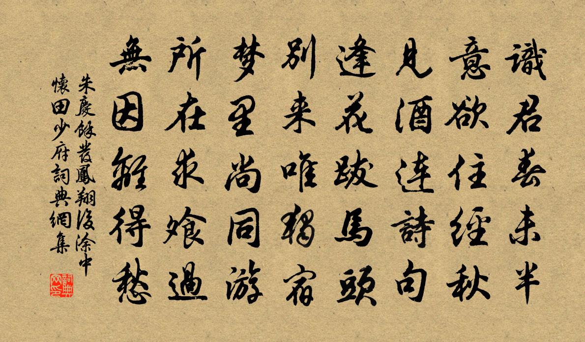 詩詞名句歷史字典書法欣賞書法字典國語詞典說文解字康熙字典古漢語字典標 題 作 者 詩 句 發鳳翔後塗中懷田少府作者:朱慶餘 朝代:唐代發鳳翔後塗中懷田少府原文識君春未半,意欲住經秋。見酒連詩句,逢花跋馬頭。別來唯獨宿,夢裡尚同游。所在求飧過,無因離得愁。詩詞問答問:發鳳翔後塗中懷田少府的作者是誰?答:朱慶餘問:發鳳翔後塗中懷田少府寫於哪個朝代?答:唐代朱慶餘發鳳翔後塗中懷田少府書法欣賞發鳳翔後塗中懷田少府書法作品注釋全唐詩:卷514-22詩詞推薦和友人題僧院薔薇花三首崔櫓〔唐代〕何人移得在禪家,瑟瑟枝條簇簇霞。爭那寂寥埋草暗,不勝惆悵舞風斜。無緣影對金尊酒,可惜香和石鼎茶。看取送王省副寶臣北使梅堯臣〔宋代〕紫服黃金帶,銀鞍翠錦韉。犯寒辭漢省,持禮入胡天。左衽通華語,名王接右賢。舊山回可記,碣石與燕服。春日獨酌郭祥正〔宋代〕桃花不解飲,向我如情親。迎風更低昂,狂殺對酒人。桃無十日花,人無百歲身。竟須醒復醉,不負花上春。絕句二首陳師道〔宋代〕里中饋杏得嘗新,馬上逢花始見春。勤苦著書如作吏,世間枉是最閒人。青山二章章四句王奕〔宋代〕青青者山,並祠其間。郭李遐矣,高義莫攀。南鄉子王哲〔元代〕物物要休休。打破般般是徹頭。認得本來真面目,修修。一個靈芽穩穩求。火里好行舟。焰裏白蓮素臉幽。復郁風和朱簿對雪韓維〔宋代〕公堂寂無事,默會擁重裘。余霰竹上集,寒風日颼颼。哀鴻不停徵,好鳥鳴相求。君能於此時,為我發新謳。上言道室書事陸游〔宋代〕榻上一琴橫,中函太古聲。丹砂燒已死,芝草種初生。道勝魔軍破,方靈疾豎平。明朝有蜀使,細字報青城。復留侯從效問南漢劉岩改名龑字音義詹敦仁〔唐代〕伏羲布初畫卦,布蒼氏乃制布字。點畫布有偏旁,陰陽貴協比。古者不嫌名,周公始稱諱。始諱猶未酷,後習轉多八月七日被命上會稽沿途所歷拙於省記為韻語魏了翁〔宋代〕越台雨壑壓層巔,下有蓬萊鎮越顏。拄笏正當秦望嶺,繞城總號會稽山。一落索陳允平〔宋代〕淡淡雙蛾疏秀。為誰頻皺。落花何處不春愁,料不是、因花瘦。錦字香箋封久。鱗鴻稀有。舞腰銷減不禁愁,怕一張文裕侍郎輓詞蘇轍〔宋代〕持節西南二十年,華堂遺像已蒼然。歸來侍從三朝舊,老去雍容平地仙。落筆縱橫題壁處,誦詩清壯舉杯前。東遊憶廬山舊遊黃滔〔唐代〕前年入廬岳,數宿在靈溪。殘燭松堂掩,孤峰月狖啼。平生為客老,勝境失雲棲。縱有重遊日,煙霞會恐迷。滿庭芳晁補之〔宋代〕鄉物牽情,家山回首,浩然歸興難收。報恩心事,投老拼悠悠。卻笑當年牛下,輕自許、激烈寒謳。成何事,夷猶法相寺可賦亭吳時顯〔宋代〕塵埃誰復識瞿野,高座風生玉麈談。露浥芙蓉心與淨,香浮檐卜鼻先參。杜陵托興歌茅屋,山谷留情賦草庵。試叩安穩眠白居易〔唐代〕家雖日漸貧,猶未苦飢凍。身雖日漸老,幸無急病痛。眼逢鬧處合,心向閒時用。既得安穩眠,亦無顛倒夢。陳氏太君輓詩二首李彌遜〔宋代〕淑德嬪賢裔,宜家有令人。苹蘩寒更潔,繭織老猶親。月館虛陶客,雲阡失孟鄰。悲風獵丹旐,行路亦沾巾。泰伯廟迎享送神辭三章龔頤正〔宋代〕車兮載旃,舟兮揚帆,鼓咽咽兮君當還。君肯來兮尚盤桓,我心煢煢兮其無端,君不我留兮下土囂煩。福我吳人兮過多福寺次王龜齡壁間韻熊應亨〔宋代〕七尺枯藤手自摩,閒過僧寺坐橫坡。花開曲徑霜前密,雲壓層城雨後多。田舍竹林分鷲嶺,山城蘆水漾魚波。禪床別海南黎民表蘇軾〔宋代〕我本海南民,寄生西蜀州。忽然跨海去,譬如事遠遊。平生生死夢,三者無劣優。知君不再見,欲去且少留。名句推薦按其實而審其名,以求其情;聽其言而察其類,無使方悖。呂不韋《呂氏春秋·覽·審分覽》 孤鴻號外野,翔鳥鳴北林。阮籍《詠懷八十二首·其一》 路上有飢人,家中有剩飯。佚名《增廣賢文·上集》 袨服華妝著處逢,六街燈火鬧兒童。元好問《京都元夕》 浩氣清英,仙材卓犖,下土難分別丘處機《無俗念·靈虛宮梨花詞》 靜言庸違,像恭滔天。佚名《尚書·虞書·堯典》 無計奈情何,且醉金杯酒。晏幾道《生查子·輕勻兩臉花》 我本不棄世,世人自棄我。李白《送蔡山人》 銀鞍照白馬,颯沓如流星。李白《俠客行》 君子以同道為朋,小人以同利為朋脫脫《宋史·列傳·卷七十八》