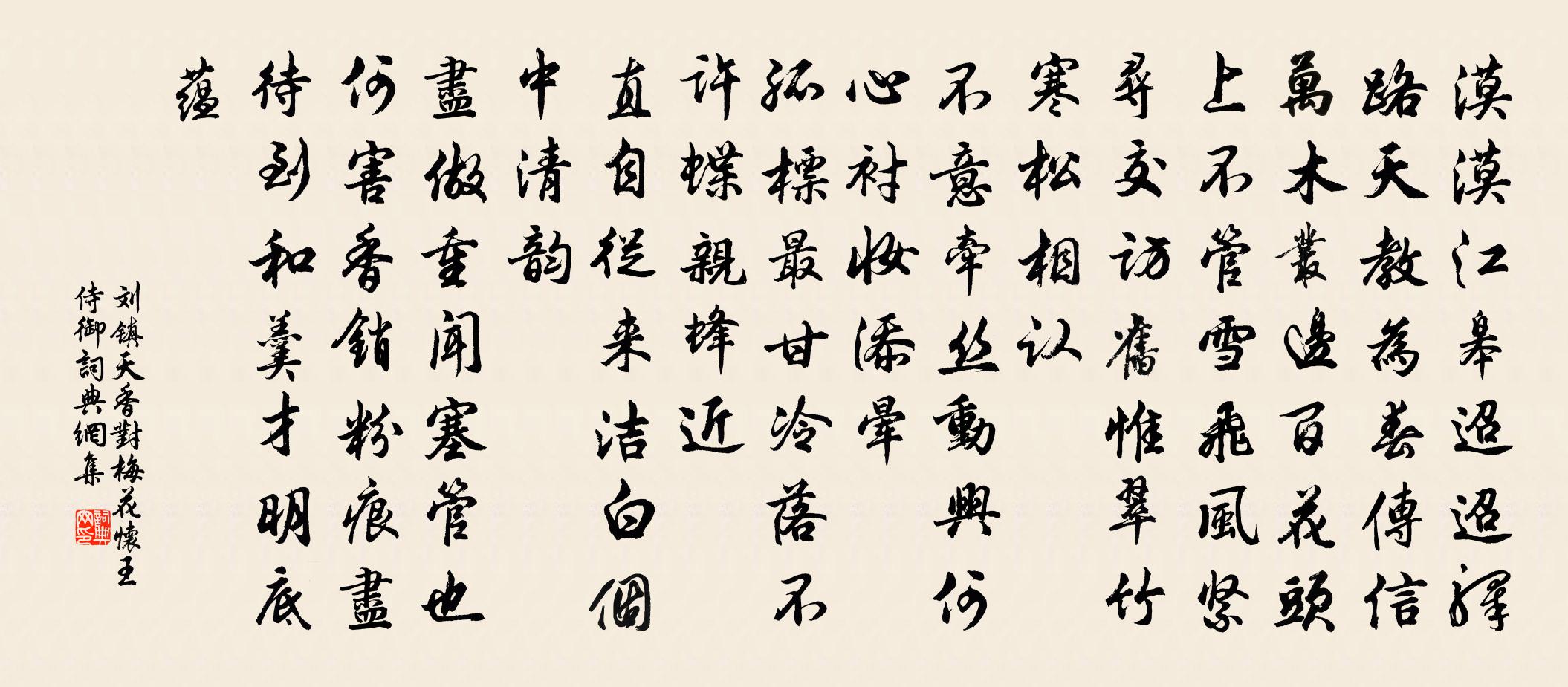 詩詞名句歷史字典書法欣賞書法字典國語詞典說文解字康熙字典古漢語字典標 題 作 者 詩 句 天香(對梅花懷王侍御)作者:劉鎮 朝代:宋代天香(對梅花懷王侍御)原文漠漠江皋,迢迢驛路,天教為春傳信。萬木叢邊,百花頭上,不管雪飛風緊。尋交訪舊,惟翠竹、寒松相認。不意牽絲動興,何心襯妝添暈。孤標最甘冷落,不許蝶親蜂近。直自從來潔白,箇中清韻。盡做重聞塞管,也何害、香銷粉痕盡。待到和羹,才明底蘊。詩詞問答問:天香(對梅花懷王侍御)的作者是誰?答:劉鎮問:天香(對梅花懷王侍御)寫於哪個朝代?答:宋代問:天香(對梅花懷王侍御)是什麼體裁?答:詞劉鎮天香(對梅花懷王侍御)書法欣賞天香(對梅花懷王侍御)書法作品詩詞推薦早秋楊億〔宋代〕楚客悲秋至,庭柯一葉凋。鶴天驚曉露,蘭畹怯涼飈。團扇流塵暗,單衣爽氣饒。江東菰米熟,歸夢隔寒潮。蟲鳴歐陽修〔宋代〕葉落秋水冷,眾鳥聲已停。陰氣入牆壁,百蟲皆夜鳴。蟲鳴催歲寒,唧唧機杼聲。時節忽已換,壯心空自驚。平明九懷江夫人高似孫〔宋代〕江上兮青山,水既去兮復還。引微風兮無瀾,擢桂槳兮閒閒。望美人兮來下,靈翩翩兮從女,劈中流兮揚舲,雁邕滿庭芳趙長卿〔宋代〕雨洗長空,風清雲路,又還畢備佳期。夜涼如水,一似去秋時。渺渺銀河浪靜,星橋外、香靄馡馡。霞軺舉,鸞驂調笑晁補之〔宋代〕行步步隨。郎去蘇台雲水國。青青滿地成輕擲。聞君車馬向江南,為傳春草遙相憶相憶。頓輕擲。春草佳名慚贈璧七夕宋白〔宋代〕纖吹浮雲薦,非因散巧樓。靈儔不可覿,仙溪泛悠悠。山中吟釋文珦〔宋代〕偶為山中游,遂作山中住。猿鶴盡相忘,不記山前路。架有古仙書,立言談信去。往往賾其玄,頗有會心處。乃知閒居示友人釋智圓〔宋代〕冷淡誰知趣,閒房枕水湄。秋窗開暮景,孤枕夢天涯。道直時流笑,心清夜月知。何當學支遁,共約買山期。初夏即事簡昞仲李曾伯〔宋代〕夏雲方建漢旗赤,春事已如周轍東。幾度炎涼經嫩綠,一番榮辱委殘紅。杜鵑豈為歸心設,蝴蝶也無清夢通。萬里病中偶書二首蔡襄〔宋代〕已感節候變,物態舒陽春。那復壯年意,如今多病身。淨室焚香久,烘爐煮藥頻。神歡百慮解,銷盡眼前塵。曉汲宋庠〔宋代〕曉汲過春畦,高梧待鳳欹。瓮思閒鑿{左土右遂},瓶險畏居湄。照影香釵墜,蠲煩素綆垂。寂寥無醉轄,瓢飲共早春山居寄城中知己姚合〔唐代〕陽和潛發盪寒陰,便使川原景象深。入戶風泉聲瀝瀝,當軒雲岫影沉沉。殘雲帶雨輕飄雪,嫩柳含煙小綻金。雖有送宋中道倅洺州王安石〔宋代〕漳水不灌鄴,不知幾何時。後世有史起,乃能為可為。余嘗憐洺民,舄鹵半不治。頗覺漳可引,但為談者嗤。高議偈十三首釋慧空〔宋代〕月生一,上下四維無等匹。月生二,須彌拽脫虛空鼻。月生三,明正為南方盡南。滿庭芳盧祖皋〔宋代〕盤谷居成,輞川圖就,便從鷗鷺尋盟。泛溪窈窕,游釣寄高情。尚憶兒童舊地,疏簾外、煙雨新晴。微吟罷,漁歌日本源侍者游台雁釋智愚〔宋代〕師道嚴明善應酬,石橋過了問龍湫。一花一草人皆見,是子知機獨點頭。達磨贊釋妙倫〔宋代〕西竺乾,東震旦。遍流毒,是者漢。不知賺了多少衲僧,至今八錯七差三馬九亂。魏府君輓詞林季仲〔宋代〕霜露長悲陟岵人,見翁強健卻酸辛。家徒四壁知無恨,掌有雙珠未是貧。老去米鹽渾不問,病來藥石強相親。歸從劉貢父見余歌詞數首以詩見戲聊次其韻蘇軾〔宋代〕十載漂然未可期,那堪重作看花詩。門前惡語誰傳去,醉後狂歌自不知。刺舌君今猶未戒,灸眉我亦更何辭。相從晚春郭印〔宋代〕三月韶華破,東君誰送歸。浮空新綠漲,舞砌亂紅飛。柳絮風初定,桃花水漸肥。羲和無計挽,獨立又斜暉。名句推薦殘螢棲玉露,早雁拂金河。許渾《早秋三首·其一》 李白乘舟將欲行,忽聞岸上踏歌聲。李白《贈汪倫》 唯器與名,不可以假人左丘明《左傳·成公·成公二年》 雪雰雰而薄木兮,雲霏霏而隕集。劉向《九嘆》 那年離別日,只道住桐廬。劉采春《囉嗊曲·那年離別日》 大者不能,小者不為,是棄國捐身之道也。荀子《荀子·大略》 泉聲咽危石,日色冷青松。王維《過香積寺》 雁足無書古塞幽。一程菸草一程愁。史達祖《鷓鴣天·衛縣道中有懷其人》 不是冤家不聚頭,冤家相聚幾時休?馮夢龍《警世通言·卷二》 今古長如白練飛,一條界破青山色。徐凝《廬山瀑布》
