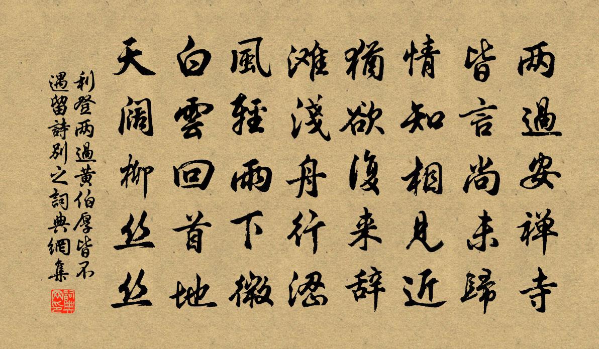 詩詞名句歷史字典書法欣賞書法字典國語詞典說文解字康熙字典古漢語字典標 題 作 者 詩 句 兩過黃伯厚皆不遇留詩別之作者:利登 朝代:宋代兩過黃伯厚皆不遇留詩別之原文兩過安禪寺,皆言尚未歸。情知相見近,猶欲復來辭。灘淺舟行澀,風輕雨下微。白雲回首地,天闊柳絲絲。詩詞問答問:兩過黃伯厚皆不遇留詩別之的作者是誰?答:利登問:兩過黃伯厚皆不遇留詩別之寫於哪個朝代?答:宋代利登兩過黃伯厚皆不遇留詩別之書法欣賞兩過黃伯厚皆不遇留詩別之書法作品詩詞推薦今年立冬後菊方盛開小飲陸游〔宋代〕胡床移就菊花畦,飲具酸寒手自攜。野實似丹仍似漆,村醪如蜜復如齏。傳芳那解烹羊腳,破戒猶慚擘蟹臍。一醉秋懹陸游〔宋代〕昨者風雨過,浩然天地秋。年光雙雪鬢,生計一漁舟。賣藥來查浦,聽猿到沃洲。平生畏暑毒,八月記初游。逍遙詠宋太宗〔宋代〕逍遙抱一豈相差,方便門開智慧花。神室分形添石髓,華池巨燄隱靈砂。穹隆備實歸宗旨,釋意從容不是賒。滋味狼山崔敦禮〔宋代〕行攜三尺虎臂杖,歸飲十分魚枕樵。飲罷招船歌一曲,馮夷亦合泣潛綃。偈公六十五首釋鹹傑〔宋代〕在眼曰見,在耳曰聞。在手執捉,在足運奔。豁開則東西南北,把住則毫髮不存。武夷有感十一首白玉蟾〔宋代〕千山猿叫月如晝,萬籟風號天正秋。霧濕蒼苔煙漠白,白雲飛夢過瀛洲。和張中大王洋〔宋代〕憶昔開元夜宴圖,錦為方丈玉為壺。但夸北里樓吹笛,誰問長安米勝珠。事去牽連難雪恥,愁來陪奉長霜須。兔園挽胡澹庵二首趙蕃〔宋代〕昔我曾大夫,嘗作舂陵適。時惟蕭子荊,袖書實見客。公經本蕭自,於義豈秦越。三年期掃門,竟欠今生識。淳化鄉飲酒三十三章佚名〔宋代〕賢淑來思,人心表德。風化天下,何樂如之。贈京尹八首袁燮〔宋代〕上醫醫國豈無方,讜論扶持弱必強。屹若中流為砥柱,男兒如此是真剛。南堂五首蘇軾〔宋代〕掃地焚香閉閣眠,簟紋如水帳如煙。客來夢覺知何處,掛起西窗浪接天。雨中春山楊萬里〔宋代〕誰作蓋春山新幛蓋子,尖峰蓋為筆天為蓋紙。近看點綴 * 山,山外遠山三萬里。紙痕慘澹遠山昏,上有長松青到寒食東城作晏殊〔宋代〕王城五百車馬繁,重帷黕幕紛郊原。遊人得意惜光景,恣尋復樹登高軒。平蕪遠水知何許,眼入迢迢空處所。梨花嚴陵道上雜詠七首洪咨夔〔宋代〕半江雲濕欲成雨,兩岸水渾初退潮。短短竹籬花朵壓,深深麥塢雉媒嬌。聽范玄長吟施肩吾〔唐代〕聲聲扣出碧琅玕,能使秋猿欲叫難。詩興未窮心更遠,手垂青拂向雲看。題太白五松書堂林桷〔宋代〕蕩漾清溪兩漿飛,趨行不及到斜暉。無人跪進雕胡飯,只學盧仝啜茗歸。感舊彭秋宇〔宋代〕五更漏盡醉魂醒,誰富胸中十萬兵。如昔襄陽堅砥柱,至今江左屹金城。南來鐵馬吹唇沸,北去銅人淚眼盈。聞說和司徒侍中同賞梨花強至〔宋代〕映花急把玉交杯,鳳掃殘香已幾堆。酷愛豈惟公假借,慣曾御苑見花來。送劉師服韓愈〔唐代〕夏半陰氣始,淅然雲景秋。蟬聲入客耳,驚起不可留。草草具盤饌,不待酒獻酬。士生為名累,有似魚中鉤。齎材依韻和吳仲庶苗蔡二君村墅閒居梅堯臣〔宋代〕聞說江南庾子山,卜居泉石愛孱顏。古來得喪何須問,世上榮枯只等閒。高闕浮雲徒有戀,夕陽飛鳥亦知還。予貧名句推薦閉門覓句陳無己,對客揮毫秦少游。黃庭堅《病起荊江亭即事》 凌波不過橫塘路,但目送、芳塵去。賀鑄《青玉案·凌波不過橫塘路》 烽火連三月,家書抵萬金。杜甫《春望》 四月南風大麥黃,棗花未落桐葉長。李頎《送陳章甫》 菡萏香銷翠葉殘,西風愁起綠波間。李璟《攤破浣溪沙·菡萏香銷翠葉殘》 今日斗酒會,明旦溝水頭。卓文君《白頭吟》 凡學之道,嚴師為難。戴聖《禮記·學記》 故人何在,煙水茫茫。柳永《玉蝴蝶·望處雨收雲斷》 悵恨不逢如意酒。尋思難值有情人。晏幾道《浣溪沙·閒弄箏弦懶系裙》 禍患常積於忽微,而智勇多困於所溺歐陽修《伶官傳序》