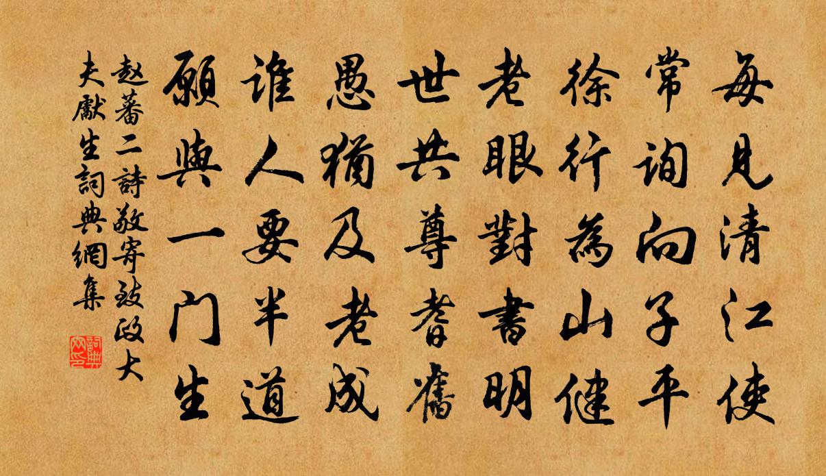 詩詞名句歷史字典書法欣賞書法字典國語詞典說文解字康熙字典古漢語字典標 題 作 者 詩 句 二詩敬寄致政大夫先生作者:趙蕃 朝代:宋代二詩敬寄致政大夫先生原文每見清江使,常詢向子平。徐行為山健,老眼對書明。世共尊耆舊,愚猶及老成。誰人要半道,願與一門生。詩詞問答問:二詩敬寄致政大夫先生的作者是誰?答:趙蕃問:二詩敬寄致政大夫先生寫於哪個朝代?答:宋代趙蕃二詩敬寄致政大夫先生書法欣賞二詩敬寄致政大夫先生書法作品詩詞推薦賢者之孝二百四十首古初林同〔宋代〕長沙有孝子,姓字死猶香。料得郡舉首,他無人敢當。和慎思秋日同文館詩蔡肇〔宋代〕秸卵因時化,如何赴越雞。逸群來冀北,屏氣入淮西。盛事兼三物,浮辭斥百題。慎須精藻鑒,寵辱異雲泥。垂柳李商隱〔唐代〕娉婷小苑中,婀娜曲池東。朝佩皆垂地,仙衣盡帶風。七賢寧占竹,三品且饒松。腸斷靈和殿,先皇玉座空。謁金門(重午)韓元吉〔宋代〕幽檻暑。又是一年重午。獵獵風蒲吹翠羽。楚天梅熟雨。往事瀟湘南浦。魂斷畫船簫鼓。雙葉石榴紅半吐。倩君聊六絕句呈趙帥兼簡鄭機宜陳造〔宋代〕宦路平時欲陸沉,先生誨語每南金。長庚配月空回首,古井無波已此心。木蘭花/玉樓春楊 * 〔宋代〕奇容壓盡群芳秀。枕臂濃香猶在袖。自從草草為傳杯,但覺厭厭長病酒。堤上路長官柳瘦。愁在月明霜落後。須知送逸歸上饒赴試趙蕃〔宋代〕謂汝可勿去,汝去意已堅。念欲終不遣,汝請倍諄然。平時父母傍,一事略不與。及今身自行,凡百誰汝護。況當中秋終日霧雨予還自都下宿分水嶺夜漏約七八喻良能〔宋代〕烏飯山邊白玉團,瑞光千丈溢清寒。斜穿逆旅茆茨室,正照先生苜蓿盤。聊向青天思太白,卻吟飛鵲憶曹瞞。今宵橫吹曲辭。白鼻騧李白〔唐代〕銀鞍白鼻騧,綠地障泥錦。細雨春風花落時,揮鞭直就胡姬飲。蘇幕遮 贈同友王哲〔元代〕這華宗,能順我。淨意清心,認取逍遙臥。日日凡塵仍便躲。管取教公,快樂無摧挫。早回頭,休漫過。滅盡無明賈秋壑圃黃庚〔宋代〕不學蒼龍臥浙東,驚飈吟佩墮青璁。既無良策安江左,空有名園似洛中,危棧連雲晴亦雨,飛樓近海夜生風。人間和鄭閎中仙居十一首陳襄〔宋代〕我愛仙居好,公餘日在房。憂民極反覆,責已未周詳。法律行隨手,詩書坐滿箱。老來須向學,多病喜平康。吾富有錢時王梵志〔唐代〕吾富有錢時, 婦兒看我好。吾若脫衣裳, 與吾疊袍襖。吾出經求去, 送吾即上道。將錢入舍來, 見吾滿面海棠樓鑰〔宋代〕海棠昨日始萌芽,一夜驚雷發萬葩。老眼恍然何所得,凌雲庵外見桃花。百牢關元稹〔唐代〕天上無窮路,生期七十間。那堪九年內,五度百牢關。金國報登位使人到闕集英殿宴致語口號真德秀〔宋代〕時平朝野寂無嘩,南北歡盟共一家。不遣纖塵驚塞上,要將和氣匝天涯。星馳琛幣來鄰境,雲擁衣冠會正衙。聖澤挽曾伯充大夫詞二首韓元吉〔宋代〕宦達雖無意,安榮自一門。剖符看令子,曳綬及諸孫。盛德清難繼,高風俗為敦。葬東駢百兩,歸臥九華根。用東坡贈晁新城韻呈朱烏江王之道〔宋代〕偶然來賦瓦梁行,亂後欣聞醉客聲。村戍火明人指路,江城風靜夜鳴鉦。對床聽雨他時念,撥火喔詩此意清。聞說點絳唇曹勛〔宋代〕一氣沖融,浩然識取生緣處。斂歸靈府。便作真鉛柱。九任玄歸,行處龍先虎。山頭雨。散成清露。瑪瑙生玄圃。奉和聖制次瓊岳應制李林甫〔唐代〕東幸從人望,西巡順物回。雲收二華出,天轉五星來。十月農初罷,三驅禮復開。更看瓊岳上,佳氣接神台。名句推薦白鳥悠悠自去,汀洲外、無限蒹葭。王國維《滿庭芳·水抱孤城》 夫因兵死守蓬茅,麻薴衣衫鬢髮焦。杜荀鶴《山中寡婦 / 時世行》 青山相待,白雲相愛,夢不到紫羅袍共黃金帶宋方壺《山坡羊·道情》 意內稱長短,終身荷聖情。杜甫《端午日賜衣》 長歌吟松風,曲盡河星稀。李白《下終南山過斛斯山人宿置酒》 事有所出,功有所止。劉向《戰國策·趙二·武靈王平晝閒居》 潯陽江頭夜送客,楓葉荻花秋瑟瑟。白居易《琵琶行 / 琵琶引》 方慚不耕者,祿食出閭里。韋應物《觀田家》 有眼不識泰山。施耐庵《水滸傳·第二回》 腸已斷,淚難收。相思重上小紅樓。辛棄疾《鷓鴣天·晚日寒鴉一片愁》
