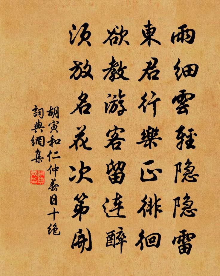 詩詞名句歷史字典書法欣賞書法字典國語詞典說文解字康熙字典古漢語字典標 題 作 者 詩 句 和仁仲春日十絕作者:胡寅 朝代:宋代和仁仲春日十絕原文雨細雲輕隱隱雷,東君行樂正徘徊。欲教遊客留連醉,須放名花次第開。詩詞問答問:和仁仲春日十絕的作者是誰?答:胡寅問:和仁仲春日十絕寫於哪個朝代?答:宋代胡寅和仁仲春日十絕書法欣賞和仁仲春日十絕書法作品詩詞推薦與杭州薛司戶登樟亭樓作孟浩然〔唐代〕水樓一登眺,半出青林高。帟幕英僚敞,芳筵下客叨。山藏伯禹穴,城壓伍胥濤。今日觀溟漲,垂綸學釣鰲。賀聖朝(春遊)馬子嚴〔宋代〕遊人拾翠不知遠。被子規呼轉。紅樓倒影背斜陽,墜幾聲弦管。荼香透,海棠紅淺。恰平分春半。花前一笑不須慳舟中睡起虞儔〔宋代〕望外星占婺,年餘水記苕。去思誰結戀,來暮豈聞謠。季布從渠毀,馮唐莫我招。舟中無一事,睡足有今朝。送張君玉赴寧江幕府七首晁公溯〔宋代〕莫言地近嶲昆明,刺史題書筆不停。解道澄江淨如練,空濛山水是昭亭。超真獨覺辭晃逈〔宋代〕了達事終虛,往事何殊夢。此後事來乾,屹如山不動。了達事終虛,往事今何在。此後事來乾,豁若空虛礙。獨覺湖州歌九十八首 其五十六汪元量〔宋代〕歌風台畔水沄沄,地面官人饋酒葷。宮女上船嬉一霎,不禁塵土污衣裙。慧和尚三絕文天祥〔宋代〕畫我郎潛先帝時,而今白髮漸參差。若交傳入都人眼,疑汝前身妙善師。風雪衡山涕滿膺,懶殘不管自家身。殷勤送蔡京東歸迎侍劉得仁〔唐代〕高堂惟兩別,此別是榮歸。薄俸迎親遠,平時知己稀。鄆郊秋木見,魯寺夜鍾微。近臘西來日,多逢霰雪飛。滿江紅趙希蓬〔宋代〕勁節剛姿,誰與比、歲寒松柏。幾度欲、排雲呈腹,叩頭流血。杜老愛君□謾苦,賈生流涕衣空濕。為國家、子細滿江紅 贈孫居士李道純〔元代〕這點虛靈,自古來、無虧無缺。更爍爍圓圓,澄澄徹徹。照破洪蒙前底事,分開蟾窟中間穴。向庵中、養個白蝦蟆題武適安寧卷胡仲弓〔宋代〕聽琴未了聽吟聲,瀉出冰壺一片清。學到唐人超絕處,前身便是武元衡。游洞霄周文璞〔宋代〕天柱青峨峨,石筍危不墮。晃晃銀雲收,誰子開玉鎖。崩騰放閘水,煜爚入洞火。神境偕靈休,乃欲搜碎瑣。愧彼山中寄外龍輔〔宋代〕一到空山下,回看遠俗塵。松枝堪作塵,無計贈情人。三月十二日作詩董氏欲為築堂。張耒〔宋代〕黃鳥聲中花已盡,綠楊風外日何長。柯家山下有幽築,雲夢澤南飛故鄉。老病袷衣猶怯冷,春深煮酒漸聞香。本無點絳唇毛並〔宋代〕夜色侵霜,蕭蕭絡緯啼金井。夢寒初驚。一倍銅壺永。無限思量,展轉愁重省。熏爐冷。起來人靜。窗外梧桐影。鶯啼序·重過金陵汪元量〔宋代〕金陵故都最好,有朱樓迢遞。嗟倦客、又此憑高,檻外已少佳致。更落盡梨花,飛盡楊花,春也成憔悴。問青山、生查子向子諲〔宋代〕春心如杜鵑,日夜思歸切。啼盡一川花,愁落千山月。遙憐白玉人,翠被餘香歇。可慣獨眠寒,減動豐肌雪。臨高台王易從〔唐代〕漢主事祁連,良人在高闕。空台寂已暮,愁坐變容發。泛艷春幌風,裴回秋戶月。可憐軍書斷,空使流芳歇。次前韻寄天寧老可舉避生日於西山陳著〔宋代〕迎錫清風掃宿埃,煙霏空翠畫圖開。西山山上千年鶴,認取年年一度來。使至廣州張九齡〔唐代〕昔年嘗不調,茲地亦邅回。本謂雙鳧少,何知駟馬來。人非漢使橐,郡是越王台。去去雖殊事,山川長在哉。名句推薦長江後浪推前浪,世上新人趕舊人。佚名《增廣賢文·上集》 浮雲暮南征,可望不可攀。杜甫《前出塞九首》 群芳爛不收,東風落如糝歐陽修《春日西湖寄謝法曹歌》 搖落深知宋玉悲,風流儒雅亦吾師。杜甫《詠懷古蹟五首·其二》 有一言,無一行,胃(謂)之誣。佚名《黃帝四經·十大經·雌雄節》 待到山花爛漫時,她在叢中笑。 * 《卜運算元·詠梅》 香臉半開嬌旖旎。當庭際。玉人浴出新妝洗。李清照《漁家傲·雪裡已知春信至》 淮水東邊舊時月,夜深還過女牆來。劉禹錫《金陵五題·石頭城》 永豐西角荒園裡,盡日無人屬阿誰。白居易《楊柳枝二首》 城上日出群烏飛,鴉鴉爭赴朝陽枝。柳宗元《跂烏詞》