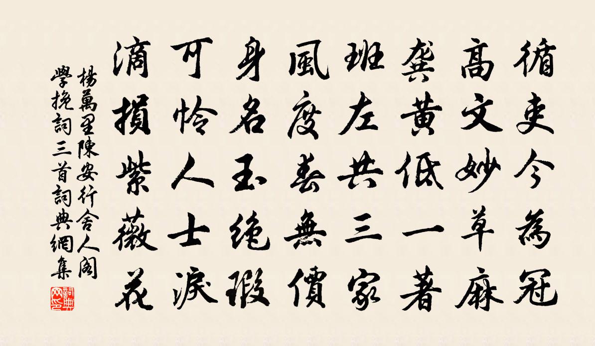 詩詞名句歷史字典書法欣賞書法字典國語詞典說文解字康熙字典古漢語字典標 題 作 者 詩 句 陳安行舍人閣學輓詞三首作者:楊萬里 朝代:宋代陳安行舍人閣學輓詞三首原文循吏今為冠,高文妙草麻。龔黃低一著,班左共三家。風度春無價,身名玉絕瑕。可憐人士淚,滴損紫薇花。詩詞問答問:陳安行舍人閣學輓詞三首的作者是誰?答:楊萬里問:陳安行舍人閣學輓詞三首寫於哪個朝代?答:宋代問:楊萬里的名句有哪些?答:楊萬里名句大全楊萬里陳安行舍人閣學輓詞三首書法欣賞陳安行舍人閣學輓詞三首書法作品詩詞推薦送小師元賁釋重顯〔宋代〕愧爾求師,為吾弟子。學雖無聞。道亦可擬。平飛辯月,照複流水。斯意斯言兮如不忘,行行拂拂兮步蘭芷。早行示同舟趙蕃〔宋代〕了了晴山見,紛紛宿霧空。樵歸婦腰斧,漁罷叟收筒。但取登臨適,何須吟嘯工。平生釣台路,明日與君同。王宗卿答春堂葉適〔宋代〕春以喻母慈,慈深春不如。兒欲答母恩,恩重答無餘。華堂頓有雲嶺隔,夢裡分明與親劇。阿連進奉新批敕,翠裘題華嚴寺白玉蟾〔宋代〕匹馬追風訪地靈,山銜夕照鳥飛驚。裴休雖是參黃檗,韓愈何曾嗣哲兄。豎拂拈槌吾不會,篇詩斗酒過平生。儂家陳西老母氏輓詞翁卷〔宋代〕八十餘年壽,孀居備苦辛。成家無別物,有子作詩人。遠客移書吊,新墳得佛鄰。秋堂掛遺像,癯若在時身。官滿寓濟川館得葉嘉仲和朱宰梅花詩次韻雲作戴栩〔宋代〕飢雀啄芳蕾,蠹苔侵碧枝。是中渾不較,刻畫未嫌時。西施灘崔道融〔唐代〕宰嚭亡吳國,西施陷惡名。浣紗春水急,似有不平聲。四月上澣日同寮約游西湖十絕張鎡〔宋代〕喜逐芻蕘禁苑東,舜弦調處剩薰風。戎葵學得宮衣纈,不作人間錦樣紅。家居陸游〔宋代〕清世念遺民,常情重老人。饋漿煩郡府,分胙媿鄉鄰。獲稻黃雲卷,舂粳玉粒新。膨脝自摩腹,一笑欲忘貧。漢廣亭曾鞏〔宋代〕悠悠漢水長,剡剡楚山密。若與心目期,爭從窗戶出。太守樸鄙人,迂無適時術。治民務不煩,得以偷暇日。北城呈葉先生侍郎劉植〔宋代〕位雖奎閣貴,獨處一齋空。還以經綸事,全歸著述中。閒心同野水,煦物盡春風。掩面將何向,西楹奠已終。洞中天 本名鷓鴣天 寄呈馬運甫馬鈺〔元代〕休賭休飲保人。減些煙焰少婪塵。能搜己過為長便,不見他非獲好因。驚寵辱,樂清貧。修心養性惜精神。常憑如五言夜宴詠燈聯句顏真卿〔唐代〕桂酒牽詩興,蘭釭照客情。 ——陸士修詎慚珠乘朗,不讓月輪明。 ——張薦破暗光初白,浮雲色轉清。 ——送矩上人董嗣杲〔宋代〕單懸淮楚寺,裓染歲時塵。踏雪歸何處,看雲悟此身。三乘新見性,一缽晚隨人。江北蕭條甚,還期莫待春。高兄徐倉高弟和劉公之兩絕見寄再韻謝之杜范〔宋代〕我輩周旋實地中,此身窮處此心通。荷君一見如平素,跡未相親味已同。送朱明之昌叔赴尉山陽王令〔宋代〕朱使拜書天上回,去以身試百里障。青衫飄若風外荷,借馬載出塵土上。準眉嶄如見天秀,獨立系馬萬里望。身軀漫成曹勛〔宋代〕年來老懶絕緘{左月右上米下糸},陋巷甘貧得未曾。秋枕厭聞中夕雨,夜窗且對短檠燈。念隨壯志銷沈盡,愁與下攝市樂雷發〔宋代〕吟到湘潭一葉黃,賈胡蹤跡正悲涼。抱琴沽酒異鄉客,打鼓發船何郡郎。楚女越商相雜沓,淮鹽浙楮自低昂。塵埃題石門洞徐璣〔宋代〕瀑水東南冠,廬山未足論。飛來長似雨,流處不知源。洞裹龍為宅,溪邊石作門。修竹謝康樂,庵有故基存。滿江紅薩都剌〔元代〕六代繁華,春去也,更無訊息。空悵望、山川形勝,已非疇昔。王謝堂前雙燕子,烏衣巷口曾相識。聽夜深、寂寞名句推薦年少辭家從冠軍,金鞍寶劍去邀勛。王涯《塞下曲二首·其二》 童子解吟長恨曲,胡兒能唱琵琶篇。李忱《吊白居易》 金鞍玉勒尋芳客,未信我廬別有春。于謙《觀書》 蕙風如薰,甘露如醴。左思《三都賦》 山中一夜雨,樹杪百重泉。王維《送梓州李使君》 音塵遠,楚天危樓獨倚。陸游《月上海棠·斜陽廢苑朱門閉》 紗廚藤簟,玉人羅扇輕縑。白樸《天淨沙·夏》 死生驚懼不入乎其胸,是故忤物而不懾。列子及其弟子《列子·黃帝》 林暗草驚風,將軍夜引弓。盧綸《和張僕射塞下曲·其二》 自見者不明;自是者不彰老子《老子·道經·第二十四章》