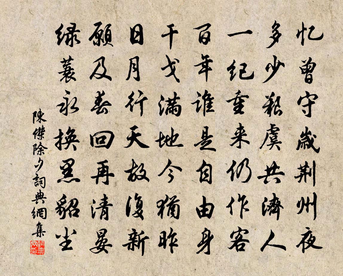 詩詞名句歷史字典書法欣賞書法字典國語詞典說文解字康熙字典古漢語字典標 題 作 者 詩 句 除夕作者:陳杰 朝代:宋代除夕原文憶曾守歲荊州夜,多少艱虞共濟人。一紀重來仍作客,百年誰是自由身。干戈滿地今猶昨,日月行天故復新。願及春回再清晏,綠蓑永換黑貂塵。詩詞問答問:除夕的作者是誰?答:陳杰問:除夕寫於哪個朝代?答:宋代陳杰除夕書法欣賞除夕書法作品詩詞推薦寫真汪晫〔宋代〕鬚眉數得莖莖古,果是環谷山中人。道眼靜觀付一笑,借問兩個若個真。合宮歌佚名〔宋代〕泰階平。勳業屬全盛。旰昃焦勞,訪道纘三朝仁政。大庭蕆事款上靈。服冕執圭,侑饗尊累聖。豆籩奕奕嘉靖。神送杜陽安奉親還蜀二首洪咨夔〔宋代〕買我歸吳棹,揚君泝蜀旃。雖為萬里別,端有一家緣。臘雪添新漲,春風減舊綿。江山隨處好,橫槊小留連。綠筠軒舊在於潛寂照寺今移立縣治之東竹間鑿張鎡〔宋代〕氣韻非關竹有魚,莫嫌清蔭雜芙蕖。官居不俗從何得,窗下風翻末盡書。八月十八日觀潮喻良能〔宋代〕萬疊銀山出海門,百川渺渺不勞吞。晴江鬥起黏天浪,一洗忠胥憤屈魂。漁村遠望因思槐逕弟同游之樂薛嵎〔宋代〕滿山殘雪滿溪雲,唯有沙鷗獨見親。往事不堪頻入夢,吟篇無數更愁人。扁舟欲流同誰載,破衲蒙頭近六旬。尚擬和卓廷瑞贈詩之韻四絕陳淳〔宋代〕長書一卷墨新題,志在斯民壽域躋。歷歷愛君憂國語,施行須自起鋤犁。滿江紅(和叔永吳尚書,時吳喪少子)劉克莊〔宋代〕著破青鞋,渾不憶、踏他龍尾。更冷笑、痴人擘劃,二三百歲。殤子彭籛誰壽夭,靈均漁父爭醒醉。向江天、極目呈張太平三首趙蕃〔宋代〕貴者多驕士,古然寧邇來。惟公獨超俗,片善靡遺才。譽已滿台閣,勤方散草萊。深知桃李徑,不為看花栽。齒痛戲成三首汪炎昶〔宋代〕強把殘編閱,支頤坐北堂。味從中夜永,痛偶暫時忘。意外逢奇藥,人間欠此方。倉公如欲覓,寄語不珍藏。送俊兄歸桃源省母釋紹曇〔宋代〕故國胡塵蔽不開,拿舟深入武陵家。野桃花映娘生面,莫學靈雲眼著沙。題三茆郡道士雲隱陸游〔宋代〕興盡當年句曲秋,卻歸罨畫弄肩舟。有時信腳來沙際,拾得殘雲補破裘。話舊(亭中對兄姊話蘭陵崇賢懷真已來故事,泫然而作)韋應物〔唐代〕存亡三十載,事過悉成空。不惜沾衣淚,並話一宵中。之官新定寓興三首張伯玉〔宋代〕關山雨雪征人淚,京洛風塵倦客心。誰信子陵溪上去,一川秋淨滌煩襟。憶王孫(秋閨)仲並〔宋代〕庭梧葉密未驚秋。風雨瀟瀟特地愁。愁緒如絲無盡頭。思悠悠。悵望王孫空倚樓。富東山海師文同〔宋代〕上人者何人,富樂之禪客。成都昔嘗見,時已坐法席。別來二十年,嗟此出處隔。昨過芙蓉溪,舍楫得攜策。盤盤簡艮齋曾豐〔宋代〕廣東漕臣重,本朝名士多。梁題年月古,壁記姓名訛。畫象初何補,濂溪自不磨。聞名猶起敬,況睹大冠峨。詩王粲〔魏晉〕哀笑動梁塵。急觴盪幽默。陋居一首蘇籀〔宋代〕平生瓮牖蔀茆菁,江左那無雨土寧。遊宦飄然紆幕燕,陋居粗有讀書螢。浮生佛腳須當抱,亂世儒衣便欲停。天定謝子蕭任崑山丞和餘留題舊遊詩複次韻謝之吳芾〔宋代〕故鄉春好阻同游,誰與花前倒玉舟。陳跡未能忘茂苑,新詩俄喜寄丹丘。開緘已慰三年別,展誦還消萬斛愁。文行名句推薦晚日寒鴉一片愁。柳塘新綠卻溫柔。辛棄疾《鷓鴣天·晚日寒鴉一片愁》 江心雲帶蒲帆重,樓上風吹粉淚香。嚴仁《鷓鴣天·惜別》 玉勒雕鞍遊冶處,樓高不見章台路。歐陽修《蝶戀花·庭院深深深幾許》 內外相應也,言行相稱韓非及後人《韓非子·解老》 日出東南隅,照我秦氏樓。佚名《陌上桑》 橋北橋南千百樹,綠煙金穗映清流。朱栴《官橋柳色》 非意相干,可以理遣。房玄齡《晉書·列傳·第六章》 我當二十不得意,一心愁謝如枯蘭。李賀《開愁歌》 秋侵人影瘦,霜染菊花肥。沈復《浮生六記·閨房記樂》 甚獨抱清高,頓成淒楚。王沂孫《齊天樂·蟬》