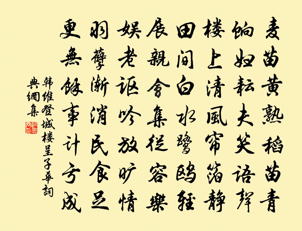 詩詞名句歷史字典書法欣賞書法字典國語詞典說文解字康熙字典古漢語字典標 題 作 者 詩 句 登城樓呈子華作者:韓維 朝代:宋代登城樓呈子華原文麥苗黃熟稻苗青,餉婦耘夫笑語聲。樓上清風簾箔靜,田間白水鷺鷗輕。展親會集從容樂,娛老謳吟放曠情。羽孽漸消民食足,更無餘事計虧成。詩詞問答問:登城樓呈子華的作者是誰?答:韓維問:登城樓呈子華寫於哪個朝代?答:宋代韓維登城樓呈子華書法欣賞登城樓呈子華書法作品詩詞推薦同曹泰宇賦寶化鳳花二首戴表元〔宋代〕花開難得年年看,住近須還日日來。古壁危闌自顏色,不煩高築鳳皇台。賈客愁楊凌〔唐代〕山水路悠悠,逢灘即殢留。西江風未便,何日到荊州。滿路花/促拍滿路花周邦彥〔宋代〕金花落燼燈,銀礫鳴窗雪。夜深微漏斷,行人絕。風扉不定,竹圃琅玕折。玉人新間闊。著甚情悰,更當恁地時節山西莊舍贈信上人和彥時兄四首王之道〔宋代〕四壁蕭然犬自馴,年來食粥甑生塵。相逢未暇寒溫語,請效參寥作故人。海棠高惟幾〔宋代〕故國庸岷外,孤根楚苑中。使梅林忌白,仙杏已饒紅。旋恐陽城破,尋尤下蔡空。幾時夢巫峽,獨立怨春風。挽王學正葉大年〔宋代〕遺文膾炙在吾鄉,賦罷誰能少薦揚。聲跡有妻先蝶夢,行藏無子付洴方。雲蘿煙蔓新泉宅,秋月春花舊野堂。交倡水調歌頭 和張大經賦盆荷張雨〔元代〕江湖渺何許,歸興浩無邊。忽聞數聲水調,令我意悠然。莫笑盆池咫尺,移得風煙萬頃,來傍小窗前。稀疏淡紅翠寄李子粲王冕〔元代〕白頭自笑潛夫拙,卻憶風流李謫仙。對客每言齊物論,移家只有廣文氈。赤雞白狗看兒戲,綠水青山作畫傳。慷慨獨坐看海棠二絕王柏〔宋代〕沈香亭下太真妃,一笑嫣然國已危。當日杜陵深有恨,何心更作海棠詩。夜觀秦蜀地圖陸游〔宋代〕往者行省臨秦中,我亦急服叨從戎。散關摩雲俯賊壘,清渭如帶陳軍容。高旌縹緲嚴玉帳,畫角悲壯傳霜風。鹹陽滿庭芳黃公度〔宋代〕其一曰,清樾才十畝,炎陬別一天。華堂依怪石,老木插飛煙。長夏絕無暑,乘風幾欲仙。心閒境自勝,底處覓林贈談命姚月壺黃庚〔宋代〕胸中訊息千年歷,舌底窮通一世人。試把五行推測看,廣文官冷幾時春。秋日雜興李廌〔宋代〕青青陌上草,秋徂故應省。疾風試飄葉,寒露猶湛潁。冰霜來無時,爾命詎堅永。滋蕃奈爾何,咄咄臨此景。早梅李龍高〔宋代〕賈少難逃賦鵩災,終童不載使纓回。只須浪作爭春態,留取孤芳殿後開。淳化中朝會二十三首佚名〔宋代〕大君隆至化,興運契千齡。觀禮俄班瑞,夷寅盡實庭。成文調露樂,奉聖拱辰星。舞佾方更進,朝陽上楚萍。瞿塘峽張問陶〔清代〕峽雨濛濛竟日閒,扁舟真落畫圖間。便將萬管玲瓏筆,難寫瞿塘兩岸山。覽越僧詩集有寄錢易〔宋代〕莫學江淹擬惠休,碧雲才調已難酬。懷君知有關山夢,開卷如逢水石秋。不得歸來作都講,自慚名宦正悠悠。賀新郎(題蒲澗寺)劉克莊〔宋代〕風露驅炎毒。記仙翁、飄然謫墮,吹笙騎鵠。歷歷漢初秦季事,山下瓜猶未熟。過眼見、群雄分鹿。想得拂衣游汗斷溪釋妙倫〔宋代〕絕訊息時訊息,不流通處流通。未達曹源淵奧,依然兩段不同。蠶室楊修〔宋代〕摘繭抽絲女在機,茅檐葦箔舊堂扉。年年桑柘如雲綠,翻織誰家錦地衣。名句推薦讀書好處心先覺,立雪深時道已傳。袁枚《隨園詩話·卷三》 草草興亡休問,功名淚、欲盈掬。黃機《霜天曉角·儀真江上夜泊》 山迴路轉不見君,雪上空留馬行處。岑參《白雪歌送武判官歸京》 群山萬壑赴荊門,生長明妃尚有村。杜甫《詠懷古蹟五首·其三》 念月榭攜手,露橋聞笛。周邦彥《蘭陵王·柳》 錦瑟無端五十弦,一弦一柱思華年。李商隱《錦瑟》 舊時燕子還飛否?今古不勝情。歸莊《錦堂春·半壁橫江矗起》 酒債尋常行處有,人生七十古來稀。杜甫《曲江二首》 應是夜寒凝。惱得梅花睡不成。黃升《南鄉子·冬夜》 輕陰池館水平橋,一番弄雨花梢。陳子龍《畫堂春·雨中杏花》