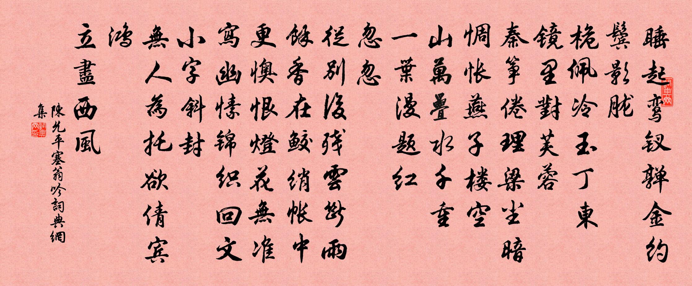 詩詞名句歷史字典書法欣賞書法字典國語詞典說文解字康熙字典古漢語字典標 題 作 者 詩 句 塞翁吟作者:陳允平 朝代:宋代塞翁吟原文睡起鸞釵嚲,金約鬢影朧。桅佩冷,玉丁東。鏡里對芙蓉。秦箏倦理梁塵暗,惆悵燕子樓空。山萬疊,水千重。一葉漫題紅。忽忽。從別後,殘雲斷雨,餘香在、鮫綃帳中。更懊恨、燈花無準,寫幽愫、錦織回文,小字斜封。無人為托,欲倩賓鴻。立盡西風。詩詞問答問:塞翁吟的作者是誰?答:陳允平問:塞翁吟寫於哪個朝代?答:宋代問:塞翁吟是什麼體裁?答:詞陳允平塞翁吟書法欣賞塞翁吟書法作品詩詞推薦梅黃大受〔宋代〕自見梅開後,相看不暫離。只因愁落去,不忍看繁時。佳實羹堪味,遺音角可期。牡丹專富貴,春盡卻空枝。題淵明採菊圖方回〔宋代〕東籬面東籬所至面有,南山南山古至今。東籬之西拄我杖,秋菊千叢開黃金。南山之北送我目,鴻飛山陽我山陰。始晴至城東別墅二首方回〔宋代〕逾月黃梅雨,河流屢溢涯。蟻宮危智伯,螢燭困欒巴。忽喜迎初日,猶嫌見早霞。淡晴城外路,緩馬過荷花。南樓中望所遲客謝靈運〔南北朝〕杳杳日西頹,漫漫長路迫。登樓為誰思?臨江遲來客。與我別所期,期在三五夕。圓景早已滿,佳人猶未適。即事春日田園雜興劉蒙山〔宋代〕桑風吹綠滿原頭,西崦東阜暖氣浮。村婦祈蠶分面絸,老農占歲說泥牛。田鳥飛逐耕煙犢,桑扈鳴隨喚雨鳩。憐叟秋日偶書趙師秀〔宋代〕官事何曾曉,閒名苦要簽。大書公吏恐,直語眾人嫌。俸少貧如故,醫慵病卻添。秋風牆下菊,相對憶陶潛。七夕對雨艾性夫〔宋代〕門無轍跡草偏青,屋帶秋山意轉清。打夢易驚棋雹響,載愁不去酒船輕。幸無簾幕妨雲影,尚欠芭蕉贈雨聲。欲送前漢門平津侯周曇〔唐代〕儒素逢時得自媒,忽從徒步列公台。北辰如不延吾輩,東閣何由逐汝開。夜對梅花示彥恭侄王偘〔宋代〕羈旅不自怡,坐閱芳歲晚。江湖有莫逆,梅花還到眼。平生相慰藉,風期無近遠。今夕共短檠,與子興不淺。題珣師休牧軒宗澤〔宋代〕一乘休去已忘機,恰似當初未牧時。雲起雲消本無跡。有為全體是無為。七十翁吟五言古體十首方回〔宋代〕五男三女兒,僥倖肖吾祖。賢愚掛懷抱,笑陶敢效杜。長男近寄書,長女化為土。嗟予七十翁,哭此四十女。此女絕句敖陶孫〔宋代〕霜風欺斷柳,星月愛平蕪。船暖知村近,鍾寒想寺孤。滴滴金 贈蔡公馬鈺〔元代〕水雲自在逍遙客。木金聚,更無隔。嬰奼從此認知識。看無中顏色。虎龍戰*曹溪側。鼎爐內,煉黃白。大丹成就新隱四首荷池王洋〔宋代〕香分淨社色專城,冠蓋如雲照乘明。曉露一妝秋艷曳,涼風吹月夜經營。戲荷魚小波紋近,戛玉船低笑響輕。聞說頌古十一首釋鹹傑〔宋代〕西江一吸了無餘,突出堂堂大丈夫。盡道世間鬍鬚赤,須知更有赤鬚鬍。點絳唇鄧有功〔宋代〕卷上珠簾,晚來一陣東風惡。客懷蕭索。看盡殘花落。自把銀瓶,買酒成孤酌。傷漂泊。知音難托。悶倚闌乾角。念奴嬌程大昌〔宋代〕海角懷人,長誤喜、籟籟敲簾風竹。命駕翩然,誰信道、不怕溪山回曲。榻拂凝塵,香籠清宴,塵柄從揮玉。好音和陶還舊居蘇軾〔宋代〕痿人常念起,夫我豈忘歸。不敢夢故山,恐興墳墓悲。生世本暫寓,此身念念非。鵝城亦何有,偶拾鶴毳遺。窮魚嵩山汪元量〔宋代〕客行天地中,嵩峰何突兀。鳥道阻且修,馬煩行復歇。一入玉女窗,便覺幽興發。好鳥鳴嚶嚶,細草亂如發。石城紀南陵題五松山李白〔唐代〕聖達有去就,潛光愚其德。魚與龍同池,龍去魚不測。當時版築輩,豈知傅說情。一朝和殷羹,光氣為列星。伊尹名句推薦清明時節雨聲嘩,潮擁渡頭沙張炎《朝中措·清明時節》 夜雪初霽,薺麥彌望。姜夔《揚州慢·淮左名都》 日日望鄉國,空歌白薴詞。張籍《薊北旅思 / 送遠人》 好事不出門,壞事傳千里。佚名《增廣賢文·上集》 操吳戈兮被犀甲,車錯轂兮短兵接。屈原《國殤》 燕草如碧絲,秦桑低綠枝。李白《春思》 山致其高而雲雨起焉,水致其深而蛟龍生焉,君子致其道而德澤流焉。文子《文子·卷六·上德》 床空委清塵,室虛來悲風。潘安《悼亡詩三首》 先拂商弦后角羽,四郊秋葉驚摵摵。李頎《聽董大彈胡笳聲兼寄語弄房給事》 一涓春水點黃昏,便沒頓、相思處。史達祖《留春令·詠梅花》