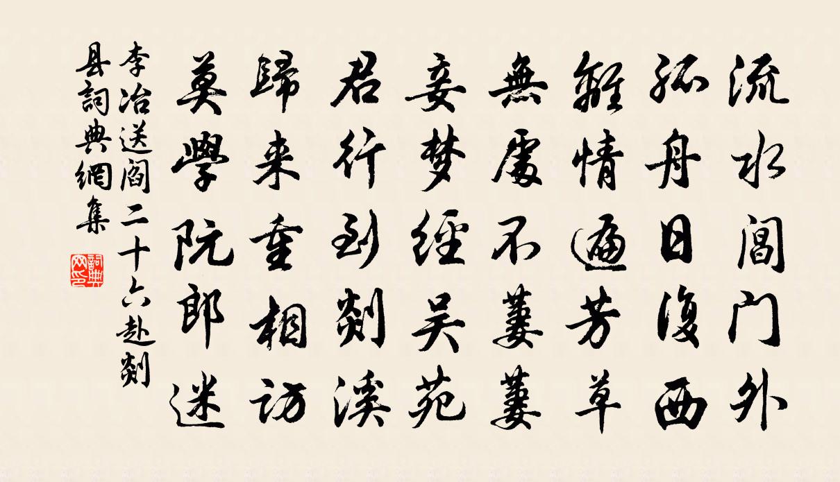 詩詞名句歷史字典書法欣賞書法字典國語詞典說文解字康熙字典古漢語字典標 題 作 者 詩 句 送閻二十六赴剡縣作者:李冶 朝代:唐代送閻二十六赴剡縣原文流水閶門外,孤舟日復西。離情遍芳草,無處不萋萋。妾夢經吳苑,君行到剡溪。歸來重相訪,莫學阮郎迷。詩詞問答問:送閻二十六赴剡縣的作者是誰?答:李冶問:送閻二十六赴剡縣寫於哪個朝代?答:唐代問:送閻二十六赴剡縣是什麼體裁?答:五律李冶送閻二十六赴剡縣書法欣賞送閻二十六赴剡縣書法作品注釋全唐詩:卷805-11詩詞推薦題利州道上江月軒李曾伯〔宋代〕何用朝朝夜夜鍾,一拳打透徹虛空。詩僧不見禪僧老,月自西沉江自東。郊外即事七首袁燮〔宋代〕陰雲解駮晴光好,藜杖逍遙足自怡。月爭漸遲風力細,初春便是浴沂時。思親汝州作黃庭堅〔宋代〕歲晚寒侵遊子衣,拘留幕府報官移。五更歸夢三百里,一日思親十二時。車上吐茵元不逐,市中有虎竟成疑。秋毫菩薩蠻蘇軾〔宋代〕玉鈽墜耳黃金飾。輕衫罩體香羅碧。緩步困春醪。春融臉上桃。花鈿從委地。誰與郎為意。長愛月華清。此時憎月諸公於石氏東齋宴鄭工部分韻得悲秋浮楊億〔宋代〕楚客登臨處,離懷重隱憂。二毛初入髩,一葉早驚秋。旅雁他鄉思,悲笳絕塞愁。憑何遣羈緒,菊蕊滿杯浮。紈扇辭楊維楨〔元代〕團圓合歡扇,比似月嬋娟。嬋娟有時缺,我扇豈衣圓?秋風落梧葉,我扇同棄捐。不得如秋葉,吹墮在君前。題宣州開元寺水閣,閣下宛溪,夾溪居人杜牧〔唐代〕六朝文物草連空,天淡雲閒今古同。鳥去鳥來山色里,人歌人哭水聲中。深秋簾幕千家雨,落日樓台一笛風。惆悵洞仙歌(和虞萬州剛簡所惠叔母生日詞韻)魏了翁〔宋代〕人生一世。如此元如此。造化都從起時起。看庭前桃李,弄蕊開花,還又看,一度成陰結子。母壽親認取,葉葉枝水龍吟 飛卿系出將種,予官燕趙時相識。讀王惲〔元代〕挫,迄於今十年,其窮極矣,既為哀之,且求其所以然,遂有斯作。以越調水龍吟歌之,庶幾伯奇履霜,自傷窮思蝶戀花秦觀〔宋代〕紫燕雙飛深院靜。簟枕紗廚,睡起嬌如病。一線碧煙縈藻井。小鬟茶進龍香餅。拂拭菱花看寶鏡。玉指纖纖,捻唾贈隱者薛能〔唐代〕門前雖有徑,絕向世間行。薙草因逢藥,移花便得鶯。甘貧原是道,苦學不為名。莫怪蒼髭晚,無機任世情。紙鷂宋伯仁〔宋代〕弄假如真舞碧空,吹噓全在一絲風。唯慚尺五天將近,猶在兒童掌握中。舞曲歌辭。冬白紵歌元稹〔唐代〕吳宮夜長宮漏款,簾幕四垂燈焰暖。西施自舞王自管,雪紵翻翻鶴翎散,促節牽繁舞腰懶。舞腰懶,王罷飲,蓋覆和胡公謹游李寺丞北園韓維〔宋代〕春郊不數到,俯爺恨流景。李侯有嘉招,滯念茲一聘。名園帶喬樹,亭榭散清影。解我塵中衣,觴行日舒永。花團次韻杜無逸西園獨坐九絕句傅察〔宋代〕外慕亦無已,反身良有餘。乘流如可游,韞匵豈藏諸。十二月十八日會飲園夫獻桃花二首宋祁〔宋代〕晚秀尚可惜,早開真謂奇。君看早開處,定是向南枝。題武夷呂天澤〔宋代〕乘興來尋杜使君,亂山矗矗白雲深。武夷仙子能知已,謾寫新詩訴此心。和馬大夫闢佛五首胡宏〔宋代〕貪真不去只談空,近代禪林盛此風。憂世最憐秦地老,指迷端有洽中公。好事近(橄欖)黃庭堅〔宋代〕瀟灑薦冰盤,滿坐暗驚香集。久後一般風味,問幾人知得。畫堂飲散已歸來,清潤轉更惜。留取酒醒時候,助茗甌次張丞送菊韻二首陳造〔宋代〕粉身免泛杯中物,並駕容陪隴首花。況耐歲寒雙乾在,周旋三益羨君家。名句推薦所謂伊人,在水一方。佚名《蒹葭》 兵者詭道,善因事變。房玄齡《晉書·帝紀·第一章》 撥雪尋春,燒燈續晝。毛滂《踏莎行·元夕》 知足之心,可用之以處境,不可用之以讀書。王永彬《圍爐夜話·第一五九則》 報導先生歸也,杏花春雨江南。虞集《風入松·寄柯敬仲》 雲白山青萬餘里,愁看直北是長安杜甫《小寒食舟中作》 月下飛天鏡,雲生結海樓。李白《渡荊門送別》 木從繩則正,後從諫則聖。佚名《尚書·商書·說命上》 是故置本不安者,無務豐末。墨子《墨子·02章 修身》 念歸林葉換,愁坐露華生。張九齡《西江夜行》