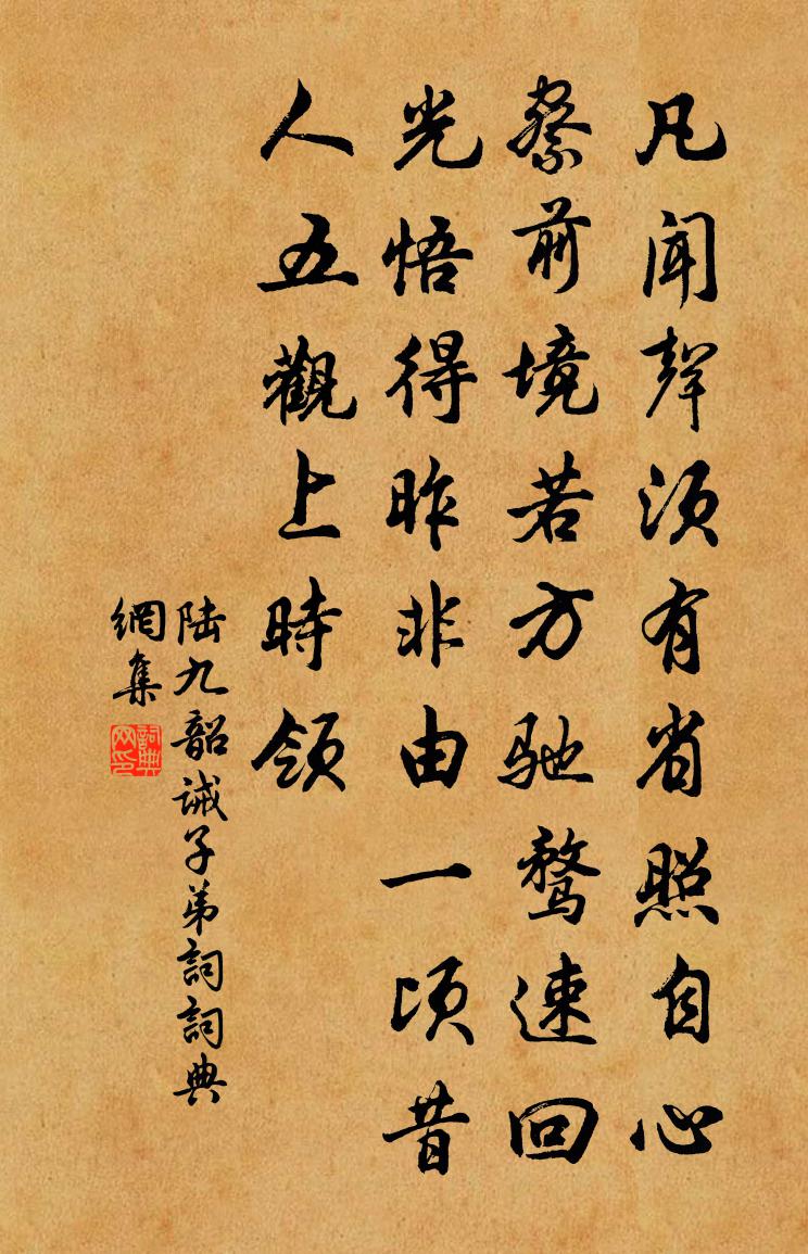 詩詞名句歷史字典書法欣賞書法字典國語詞典說文解字康熙字典古漢語字典標 題 作 者 詩 句 誡子弟詞作者:陸九韶 朝代:宋代誡子弟詞原文凡聞聲,須有省。照自心,察前境。若方馳騖速回光,悟得昨非由一頃。昔人五觀上時領。詩詞問答問:誡子弟詞的作者是誰?答:陸九韶問:誡子弟詞寫於哪個朝代?答:宋代陸九韶誡子弟詞書法欣賞誡子弟詞書法作品詩詞推薦登北榭陸游〔宋代〕遶城山作翠濤傾,底事文書日有程?無溷我為揮吏散,獨登樓去看雲生。香浮鼻觀煎茶熟,喜動眉間鍊句成。莫笑宮詞王珪〔唐代〕花里宮鶯曉未啼,千牛仗下報班齊。銀袍五百趨龍尾,天子臨軒賜御題。山中梅花薛嵎〔宋代〕詩人魂在梅花上,不比垂楊管別離。野鶴聲聲聲漸遠,定應飛報月明知。醒心亭曾協〔宋代〕主人誰與解春酲,百斛香醪一小亭。兀兀泠泠俱可樂,醒來還醉醉還醒。送親戚錢尉入國丁黼〔宋代〕正是朔風吹雪初,行滕結束問征途。不能刺刺對婢子,已是昂昂真丈夫。常惠舊曾隨屬國,烏孫今亦病匈奴。不知代人上謝丞相生朝唐士恥〔宋代〕閱說中元生上相,萊公勳業無以尚。陰為月兮月為臣,清光欲滿銀蕩蕩。銀光蕩蕩翻未奇,未奇新弦初上時。堯蓂淳熙元年端午帖子詞皇帝合六首崔敦詩〔宋代〕千的桃印明金殿,百子榴房照綺疏。清曉宮門放魚鑰,內家催進恤刑書。和令狐補闕春日獨游西街趙嘏〔唐代〕左掖初辭近侍班,馬嘶尋得過街閒。映鞭柳色微遮水,迎步花枝欲礙山。暖泛鳥聲來席上,醉從詩句落人間。此時訪醫陸游〔宋代〕衰與病相乘,況復積憂慮,眩昏坐輒瞑,疲弱行欲仆。今晨訪之醫,見語疾當去,脈來如泉源,未易測君數。盛衰春日六言十二首劉克莊〔宋代〕褵褷病鶴翅短,虺隤老馬力疲。不知大翰會事,且吟小家數詩。句李簡〔宋代〕向來紅與紫,隨流去如雲。雖有故枝在,花落何紛紛。和孔教授武仲濟南四詠其三鵲山亭蘇轍〔宋代〕築台臨水巧安排,萬象軒昂發瘞埋。南嶺崩騰來不盡,北山斷續意尤佳。平時戰伐皆荒草,永日登臨慰病懷。更欲師玿長老求贊釋宗杲〔宋代〕畫得百千本,都記祗這是。師玿好陰當,楊岐第七世。情詩曹植〔魏晉〕微陰翳陽景,清風飄我衣。游魚潛淥水,翔鳥薄天飛。眇眇客行士,徭役不得歸。始出嚴霜結,今來白露晞。游者送從弟郎中赴浙西劉禹錫〔唐代〕銜命出尚書,新恩換使車。漢庭無右者,梁苑重歸歟。又食建業水,曾依京口居。共經何限事,賓主兩如初。鶯雛鮑溶〔唐代〕雙鶯銜野蝶,枝上教雛飛。避日花陰語,愁風竹里啼。須防美人賞,為爾好毛衣。毛老鬥牛文同〔宋代〕牛牛爾何爭,於此輒斗怒。長鞭鬧兒童,大炬走翁嫗。蒼{狄火換婁} * 子,駭立各四顧。何時解角歸,茅舍江過鄰家陸游〔宋代〕今日病良已,筇枝發興新。高居遺世事,一笑過吾鄰。夕照明丹葉,秋風老白苹。素衣雖化盡,不為犯京塵。次韻公辟即席呈太虛秦觀〔宋代〕與君鄰並共煙霞,乘興時時過我家。更漏一新聞曉角,門闌數級看秋花。湖山對值全如買,風月相期不用賒。賴有折桂新亭錢聞詩〔宋代〕面對三江背五峰,一亭屹屹睨其中。蓬萊弱水眼前是,不必思航大海東。名句推薦鷹擊長空,魚翔淺底,萬類霜天競自由。 * 《沁園春·長沙》 本來無一物,何處惹塵埃!惠能《菩提偈》 更無柳絮因風起,惟有葵花向日傾。司馬光《客中初夏》 向來吟秀句,不覺已鳴鴉。韓翃《酬程延秋夜即事見贈》 智足以拒諫,言足以飾非司馬遷《史記·汲鄭列傳》 禍福將至,善必先知之;不善,必先知之。故至誠如神。子思《中庸·第二十四章》 離堂思琴瑟,別路繞山川。陳子昂《春夜別友人二首·其一》 平明尋白羽,沒在石棱中。盧綸《和張僕射塞下曲六首》 村北村南布穀忙,村前村後稻花香。方向《詠儋耳二首》 天與三台座,人當萬里城。張九齡《奉和聖制送尚書燕國公赴朔方》