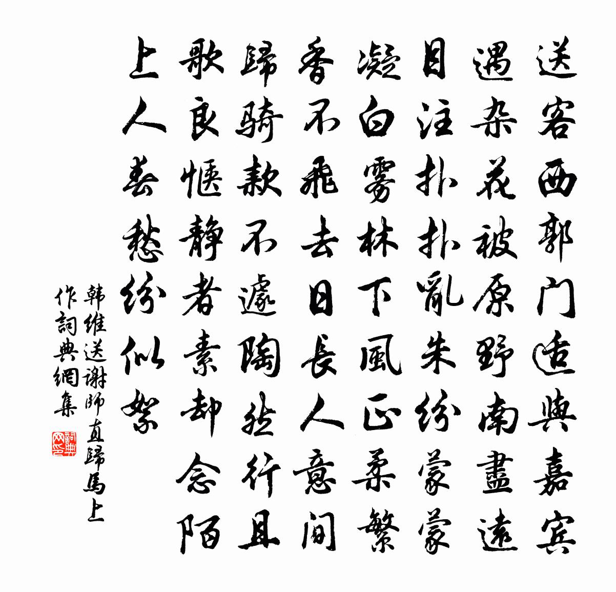 詩詞名句歷史字典書法欣賞書法字典國語詞典說文解字康熙字典古漢語字典標 題 作 者 詩 句 送謝師直歸馬上作作者:韓維 朝代:宋代送謝師直歸馬上作原文送客西郭門,適與嘉賓遇。雜花被原野,南盡遠目注。撲撲亂朱紛,蒙蒙凝白霧。林下風正柔,繁香不飛去。日長人意間,歸騎款不遽。陶然行且歌,良愜靜者素。卻念陌上人,春愁紛似絮。詩詞問答問:送謝師直歸馬上作的作者是誰?答:韓維問:送謝師直歸馬上作寫於哪個朝代?答:宋代韓維送謝師直歸馬上作書法欣賞送謝師直歸馬上作書法作品詩詞推薦頌古四首釋亮〔宋代〕一色通身白,天然絕點塵。吒少當古路,不吼也驚人。和張秀才落花有感李商隱〔唐代〕晴暖感余芳,紅苞雜絳房。落時猶自舞,掃後更聞香。夢罷收羅薦,仙歸敕玉箱。迴腸九回後,猶有剩迴腸。頌古一○一首釋子淳〔宋代〕日午煙凝山突兀,夜央天淡月嬋娟。混然寂照寒宵永,明暗圓融未兆前。晚出陳師道〔宋代〕應俗敢辭疾,衝風寧小驅。聊為一日役,不憚百金軀。雪路無行跡,冰枝有落烏。寒門閉蕭瑟,窮里聽唏吁。答廬陵彭士先劉克莊〔宋代〕昔牧昌黎州,嘗負君詩債。今使番君國,又辱君訪逮。稍訝顏發非,因感歲月邁。君氣不惰歸,君詩有光怪。乍觀山寺引泉曹松〔唐代〕劈碎琅玕意有餘,細泉高引入香廚。山僧未肯言根本,莫是銀河漏泄無。偈頌十九首釋紹曇〔宋代〕不業農商不業儒,菑田弗下寸根株。驢年斫倒菩提樹,羞見新州個老盧。筠溪八景詩筆架文峰陳著〔宋代〕巧奪西湖五姥峰,架中時見掛長虹。近聯霞彩箋呈錦,遙對岩牙筆露蹤。翰墨雲煙來璧水,丹青桃李出花叢。恩承送強甫赴惠安六言十首劉克莊〔宋代〕得百里地雖小,作三年計勿忙。但願彼禾稼熟,莫愁汝松菊荒。懶瓚和尚贊釋智遇〔宋代〕枕石苔生,岩藤影綠。天書促行。芋子未熟。天香 壽桂金堂竹泉總管朱唏顏〔元代〕碧玉橫陳,黃金細屑,天然畫堂風景。古月浮香,冷風度曲,不許一塵侵近。沉沉永夜,漾水色、窗軒秋淨。如識寒食清明十首劉克莊〔宋代〕楊柳堤邊立,荼醾架下行。不知一遺老,更看幾清明。題趙少隱青白堂三首陳與義〔宋代〕雪裡芭蕉摩詰畫,炎天梅蕊簡齋詩。它時相見非生客,看倚瑯玕一段奇。郊廟歌辭。後唐宗廟樂舞辭。永平舞佚名〔唐代〕慶傳瓚祚,位正瑤圖。功宣四海,化被八區。靜彰帝道,動合乾符。千秋萬祀,永荷昭蘇。頌古一百首釋智愚〔宋代〕事到無心不苟欺,鳥玄鵠白尚懷疑。自非親見黃頭老,爭敢逢人匯漏伊。題郭季寬曉耕宿釣二圖楊冠卿〔宋代〕牛角橫素書,春犁破朝雨。鴻鵠志安知,功名心自許。答朱元晦石鬥文〔宋代〕病枕經年臥沃洲,滿庭楓葉又吟秋。書來如見舊人面,讀了還添塵世愁。憂國至今遺白髮,窮經空自愧前修。武夷書林十景詩謝枋得〔宋代〕路盤屈曲蛇行驚,嶺危崒嵂龜紋真。俯窺毛悚超宇宙,仰捫手得探星辰。斜陽墮塊硃砂魄,暮霞幾縷胭脂色。來朝長安二月二十二日雪十韻強至〔宋代〕曉白乾坤靜,寒消氣候侵。麥滋堆壠疾,花沒聚枝深。浩蕩中春尾,昭蘇庶彙清。函關雙粉蝶,繡嶺一瑤林。鶴冷送道士郄彝素歸內道場盧綸〔唐代〕病老正相仍,忽逢張道陵。羽衣風淅淅,仙貌玉稜稜。叱我問中壽,教人祈上升。樓居五雲里,幾與武皇登。名句推薦口之宣言也,善敗於是乎興左丘明《國語·周語·邵公諫厲王弭謗》 知己知彼,將心比心。佚名《增廣賢文·上集》 相馬失之瘦,相士失之貧。司馬遷《史記·滑稽列傳》 風雨如晦,雞鳴不已。佚名《風雨》 君王選玉色,侍寢金屏中。李白《怨歌行》 人之聰明,多失於浮炫脫脫《金史·列傳·卷三十三》 強自取柱,柔自取束。荀子《荀子·勸學》 淥水淨素月,月明白鷺飛。李白《秋浦歌十七首》 聚如丘山,散如風雨,迅如雷電,捷如鷹鶻宋濂、王褘《元史·列傳·卷四十四》 杖劍對尊酒,恥為遊子顏。陸龜蒙《別離》