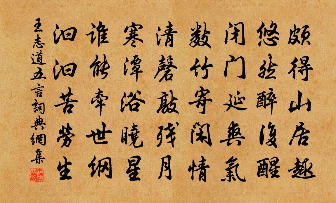 詩詞名句歷史字典書法欣賞書法字典國語詞典說文解字康熙字典古漢語字典標 題 作 者 詩 句 五言作者:王志道 朝代:宋代五言原文頗得山居趣,悠然醉復醒。閉門延爽氣,數竹寄閒情。清磬敲殘月,寒潭浴曉星。誰能牽世綱,汩汩苦勞生。詩詞問答問:五言的作者是誰?答:王志道問:五言寫於哪個朝代?答:宋代王志道五言書法欣賞五言書法作品詩詞推薦久寓泉南待一故人訊息桂隱諸葛如晦謂客舍不戴復古〔宋代〕寄跡小園中,忽有烏衣至。手中執圓封,州府特遣饋。羅列滿吾前,禮數頗周致。四隣來聚觀,若有流涎意。呼童次耿令君藥名韻曹彥約〔宋代〕賦分微官即忍冬,衣單無計可防風。四方遠志從頭去,一水空青到底窮。地骨自寒誰與祛,天門欲到愧無功。是誰賣鏡趙孟堅〔宋代〕賣明鏡,怕明鏡,從來面瘦兩高顴,況復星星添鬢影。世間萬事只宜晦,明鏡何須炯相對。鏡明賣卻昏不磨,從教滿江紅呂渭老〔宋代〕晚浴新涼,風蒲亂、松梢見月。庭陰盡、暮蟬啼歇。螢繞井闌簾入燕,荷香蘭氣供搖箑。賴晚來、一雨洗游塵,無偈三首釋卿〔宋代〕蓬萊突兀無遮護,鐵壁銀山無入處。有時關棙一時開,放出毒蛇當大路。參禪人,早回顧,莫待臨時生怕怖。荊棘送休師歸長沙寧覲齊己〔唐代〕吾子此歸寧,風煙是舊經。無窮芳草色,何處故山青。偶泊鳴蟬島,難眠好月汀。殷勤問安外,湘岸采詩靈。秋分後十日得暴雨曹彥約〔宋代〕負固驕陽不忍回,執迷涼意誤驚猜。傾盆雨勢疑飛瀑,揭地風聲幫迅雷。階下決明添意氣,庭前甘菊勝胚胎。可憐秋晚張耒〔宋代〕鳥栖林已靜,門掩吏家歸。黃葉雨中盡,鳴蟲霜後微。塵凝經暑扇,貂敝早寒衣。賴有清尊酒,山爐徹夜圍。長安縣廳李洞〔唐代〕主人寂寞客屯邅,愁絕終南滿案前。乞取中庭藤五尺,為君高劚扣青天。旅中別侄暐許渾〔唐代〕相見又南北,中宵淚滿襟。旅遊知世薄,貧別覺情深。歌管一尊酒,山川萬里心。此身多在路,休誦異鄉吟。水調歌頭 時楊溪避兵舒頔〔元代〕飽來石上臥,醉向水邊吟。山靈不管閒事,容我盡登臨。山外猿啼鶴唳,世上虎爭狼斗,此地白雲深。今古一杯土寒夜杜耒〔宋代〕寒夜客來茶當酒,竹爐湯沸火初紅。尋常一樣窗前月,才有梅花便不同。和盧疎齋多景樓韻王奕〔宋代〕一合乾坤氣脈連,蜜甜本不揀中邊。幾千萬劫本同此,百八十年何間然。北固英雄前去古,中原文獻後來賢。老懷詰旦思之世豈有不押之韻輒和北山十首劉克莊〔宋代〕忽忽聚還散,熒熒暗復明。去嫌滅燭穢,來照讀書清。不必煩羅扇,何妨屏鐵檠。蚌珠大如月,不及爾身輕。竹色沈說〔宋代〕竹色留清睡,薰風晝一簾。懶因人事少,病覺老顏添。開檻臨昏鏡,齊書補墜簽。晚蟬聲欲斷,新月到溪鄰。自桃川至辰州絕句四十有二趙蕃〔宋代〕坐對蒼然暮色侵,忽驚螢燭度枝深。少年嗜學猶余志,安得茅檐把卷臨。求黃家紫竹杖蘇轍〔宋代〕曾家紫竹君家種,曾園竹與荒藤共。藤驕竹瘁如畏人,不似君家竹森聳。我來買宅非為宅,愛此風梢時一弄。磨刀題重居寺張祜〔唐代〕浮圖經近郭,長日羨僧閒。竹徑深開院,松門遠對山。重廊標板榜,高殿鎖金環。更問尋雷室,西行咫尺間。送胡季昭謫象州劉夢才〔宋代〕紹興寶慶百年余,古往今來說二胡。論事直須彈懇切,立朝端不忍阿諛。兩賢幸屬吾州有,萬事何曾公議無。象郡快活三過朝天子四換頭佚名〔元代〕良辰媚景換今古,賞心樂事暗乘除,人生四事豈能無?不可教輕辜負。喚取,伴侶,正好向西湖路,花前沉醉倒玉名句推薦千點寒梅曉角中,一番春信畫樓東。楊慎《鷓鴣天·元宵後獨酌》 暖雨晴風初破凍,柳眼梅腮,已覺春心動。李清照《蝶戀花·暖雨晴風初破凍》 山河破碎風飄絮,身世浮沉雨打萍。文天祥《過零丁洋》 夜闌風靜欲歸時,惟有一江明月碧琉璃。蘇軾《虞美人·有美堂贈述古》 聚散匆匆,此恨年年有。魏夫人《點絳唇·波上清風》 山城過雨百花盡,榕葉滿庭鶯亂啼。柳宗元《柳州二月榕葉落盡偶題》 竹樹帶飛嵐,荇藻俱明麗。劉道著《湘江秋曉》 雲開遠見漢陽城,猶是孤帆一日程。盧綸《晚次鄂州》 我歌月徘徊,我舞影零亂。李白《月下獨酌四首·其一》 未知鹿死誰手房玄齡《晉書·載記·第五章》