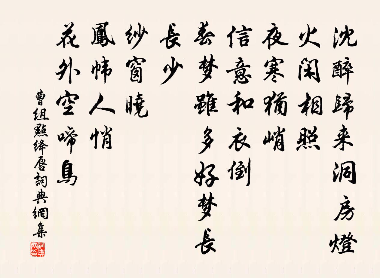 詩詞名句歷史字典書法欣賞書法字典國語詞典說文解字康熙字典古漢語字典標 題 作 者 詩 句 點絳唇作者:曹組 朝代:宋代點絳唇原文沈醉歸來,洞房燈火閒相照。夜寒猶峭。信意和衣倒。春夢雖多,好夢長長少。紗窗曉。鳳幃人悄。花外空啼鳥。詩詞問答問:點絳唇的作者是誰?答:曹組問:點絳唇寫於哪個朝代?答:宋代問:點絳唇是什麼體裁?答:詞問:曹組的名句有哪些?答:曹組名句大全曹組點絳唇書法欣賞點絳唇書法作品詩詞推薦讀書皮日休〔唐代〕家資是何物,積帙列梁梠。高齋曉開卷,獨共聖人語。英賢雖異世,自古心相許。案頭見蠹魚,猶勝凡儔侶。句鄭爚〔宋代〕月似故人能赴約,鷺如小友可忘年。憲宗皇帝輓歌詞張祜〔唐代〕嗚咽上攀龍,昇平不易逢。武皇虛好道,文帝未登封。壽域無千載,泉門是九重。橋山非遠地,雲去莫疑峰。室中三關釋原妙〔宋代〕杲日當空,無所不照,因甚被片雲遮卻。漁家傲(金陵賞心亭送王勝之龍圖。王守金陵,視事一日移南郡)蘇軾〔宋代〕千古龍蟠並虎踞。從公一吊興亡處。渺渺斜風吹細雨。芳草渡。江南父老留公住。公駕飛車凌彩霧。紅鸞驂乘青鸞記仙女三絕董嗣杲〔宋代〕屈曲闌乾月半規,藕花香淡水漪漪。分明一夜文姬夢,只有青團扇子知。鄂渚除夜書懷來鵠〔唐代〕鸚鵡洲頭夜泊船,此時形影共悽然。難歸故國干戈後,欲告何人雨雪天。箸撥冷灰書悶字,枕陪寒席帶愁眠。自嗟漫成宋庠〔宋代〕二典勛華冠號榮,燦然三代繼英聲。如何孟子尊儒術,不肯臨篇信武成。送人歸山釋文珦〔宋代〕君歸西山去,為愛山中雲。雲亦喜君歸,日夕常氤氳。雲蹤渺難期,別恨徒殷勤。他時望山色,眼中如見君。儀坤廟樂章員半千〔唐代〕孝享雲畢,維徹有章。雲感玄羽,風淒素商。瞻望神座,祗戀匪遑。禮終樂闋,肅雍鏘鏘。挽太平趙倅三首劉宰〔宋代〕薄俗紛紛不再淳,吁嗟公子獨振振。從知為善身心樂,不憚分財手足親。韋布幾人勤禮遇,杯盤一笑見天真。蒼蒼古木陽枋〔宋代〕古木撐空萬丈青,鋪排峽險與江深。濃嵐欲滴春煙暝,畫出騷人一片心。送人往嶺表寇準〔宋代〕炎光君此去,旅恨杳何窮。海樹瘴煙黑, * 山路中。和王適新葺小室蘇轍〔宋代〕向日堂東一室存,竹為窗壁席為門。心如白月光長照,氣結丹砂體自溫。飯軟莫嫌紅米賤,酒香故取潑醅渾。他年奉酬度支陳員外徐鉉〔唐代〕古來賢達士,馳鶩唯群書。非禮誓弗習,違道無與居。儒家苦迂闊,遂將世情疏。吾支嗣世德,古風藹有餘。幸遇調笑令曾慥〔宋代〕佳友。金英輳。陶令籬邊常宿留。秋風一夜摧枯朽。獨艷重陽時候。剩收芳蕊浮卮酒。薦酒先生眉壽。廖成伯奉議生辰仲並〔宋代〕曾聽尊前世采歌,喜聞煙袖舞婆娑。名駒汗血得夷路,老柏凌霜只舊柯。桃李盛時隨地有,芝蘭生處近人多。春風三君詠魏鄭公(徵)高適〔唐代〕鄭公經綸日,隋氏風塵昏。濟代取高位,逢時敢直言。道光先帝業,義激舊君恩。寂寞臥龍處,英靈千載魂。朝中措(生日生雙竹)沈瀛〔宋代〕論兵齒頰帶霜寒。清似碧琅玕。好是天然風韻,琳宮瑤館清閒。華筵初啟,小蠻二八,對影朱顏。便好添籌索笑,題諶氏奉先亭曾豐〔宋代〕大協龜{左冉右龜}兆,新成馬鬣封。雨餘生亂草,霜後拱孤松。泣酹春秋酒,顰撞日暮鍾。若無翁仲在,誰鑒答名句推薦芳樹籠秦棧,春流繞蜀城。李白《送友人入蜀》 媼引濃妝女,兒扶爛醉翁。范成大《寒食郊行書事》 碧雲無渡碧天沉,是湖心,是儂心。張惠言《江城子·填張春溪西湖竹枝詞》 年年端午風兼雨,似為屈原陳昔冤。趙蕃《端午三首》 回頭流水小橋東,煙掃畫樓出。雷應春《好事近·梅片作團飛》 攀出牆朵朵花,折臨路枝枝柳。關漢卿《一枝花·不伏老》 醉舞梁園夜,行歌泗水春杜甫《寄李十二白二十韻》 日日深杯酒滿,朝朝小圃花開。朱敦儒《西江月·日日深杯酒滿》 春風試手先梅蕊,頩姿冷艷明沙水。趙令畤《菩薩蠻·春風試手先梅蕊》 谷不熟為飢,蔬不熟為饉,果不熟為荒,仍飢為薦。佚名《爾雅·釋天》