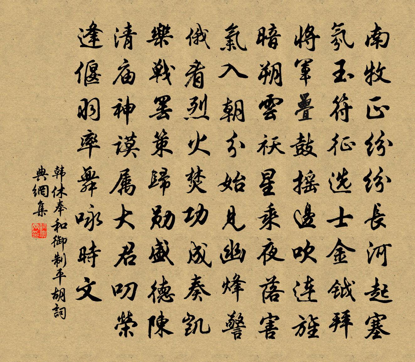 詩詞名句歷史字典書法欣賞書法字典國語詞典說文解字康熙字典古漢語字典標 題 作 者 詩 句 奉和御製平胡作者:韓休 朝代:唐代奉和御製平胡原文南牧正紛紛,長河起塞氛。玉符徵選士,金鉞拜將軍。疊鼓搖邊吹,連旌暗朔雲。祅星乘夜落,害氣入朝分。始見幽烽警,俄看烈火焚。功成奏凱樂,戰罷策歸勛。盛德陳清廟,神謨屬大君。叨榮逢偃羽,率舞詠時文。詩詞問答問:奉和御製平胡的作者是誰?答:韓休問:奉和御製平胡寫於哪個朝代?答:唐代問:奉和御製平胡是什麼體裁?答:五排韓休奉和御製平胡書法欣賞奉和御製平胡書法作品注釋全唐詩:卷111_1詩詞推薦春日雜興方岳〔宋代〕天與之愚竟不移,經年兀兀槿花籬。拙於生事可無粥,工乃窮人賴有詩。只恁麽休身是客,知何以故鬢成絲。寒欺跋至能所書西湖洞天事方岳〔宋代〕圮上老人親墮屨,衡山道士共聯詩。向來此事亦多矣,我故於君了不疑。醉落魄(題藕花洲尼扇)吳文英〔宋代〕春溫紅玉。纖衣學翦嬌鴉綠。夜香燒短銀屏燭。偷擲金錢,重把寸心卜。翠深不礙鴛鴦宿。采菱誰記當時曲。青山朝中措趙長卿〔宋代〕先生德行冠南豐。錦繡作心胸。暫屈徒勞州縣,文章後進宗工。督郵綱紀,才高幕府,雅望尤崇。此去定膺光寵,春江極目楊冠卿〔宋代〕荊揚春冬異風土,江北江南春冬花。跨馬出郊時極目,應須美酒送生涯。留別薛僕射(薛平僕射出鎮浙西主禮稍薄曾留詩諷之)平曾〔唐代〕梯山航海幾崎嶇,來謁金陵薛大夫。毛髮豎時趨劍戟,衣冠儼處拜冰壺。誠知兩軸非珠玉,深愧三縑恤旅途。明日題甘露寺淨名齋兼寄米元章賀鑄〔宋代〕日出天垠露,江橫地軸分。馳年悲落木,羈思託孤雲。重掃淨名室,長招漫仕君。悠悠德璋輩,未辦勒移文。更漏子溫庭筠〔唐代〕背江樓,臨海月,城上角聲嗚咽。堤柳動,島煙昏,兩行征雁分。京口路,歸帆渡,正是芳菲欲度。銀燭盡,玉繩汾上宴別(一作許渾詩)趙嘏〔唐代〕雲物如故鄉,山川知異路。年來未歸客,馬上春欲暮。一尊花下酒,殘日水西樹。不待管弦終,搖鞭背花去。滿江紅(別滄洲趙茂仲)柴望〔宋代〕載酒何人,登臨處、滄洲空闊。憑闌外、晴楊兩岸,晚煙潑□。水鳥不知梁燕去,溪山半屬冬青閣。有小舟、隱約夏日題瀛台乾隆〔清代〕文軒梧竹倍淒清,座擁琳瑯爽自生。高處近天無暑氣,人間此地是蓬瀛。水涵銀海月為鏡,苔點瑤階石作枰。草木山胡蘇轍〔宋代〕山胡擁蒼毳,兩耳白茸茸。野樹啼終日,黔山深幾重。啄溪探細石,噪虎上孤峰。被執應多恨,筠籠僅不容。熙寧祀皇地祗十二首佚名〔宋代〕有來穆穆,臨此方丘。其行風動,春止霆收。躬事匪懈,豐盛潔羞。百昌鹹殖,允矣神林。內道場僧弘紹賈島〔唐代〕麟德燃香請,長安春幾回。夜閒同像寂,晝定為吾開。講罷松根老,經浮海水來。六年雙足履,只步院中苔。天章橋葛紹體〔宋代〕畫橋人靜度楊花,山果溪魚賣酒家。淡淡輕煙綠陰淺,一年春色到桑麻。偈頌七十二首釋祖欽〔宋代〕電光莫追,石火猶遲。構弗及處,心不可識,智不可知。題忠愍公送婿邢得照歸婺女詩後曹穭孫〔宋代〕路八千來媚亦艱,相看冰玉問平安。剪燈夜話思全蜀,五十四州天上寬。撥棹子尹鶚〔唐代〕風切切,深秋月,十朵芙蓉繁艷歇。小檻細腰無力,空贏得,目斷魂飛何處說。寸心恰似丁香結,看看瘦盡胸前雪力漕篇呈發運王司封寶臣梅堯臣〔宋代〕兵外肢強,兵內體壯。斂之盡歸,歲以多餉。東南舳艫,銜尾而上。浮江浮淮,泝汴之湍。汴湍不常,水衡不官。南鄉子 登京口北固亭有懷辛棄疾〔宋代〕何處望神州,滿眼風光北固樓。千古興亡多少事,悠悠,不盡長江滾滾流。年少萬兜鍪,坐斷東南戰未休。天下英名句推薦江帆幾片疾如箭,山泉千尺飛如電周德清《塞鴻秋·潯陽即景》 蓬鬢哀吟長城下,不堪秋氣入金瘡。盧綸《逢病軍人》 無為在歧路,兒女共沾巾。王勃《送杜少府之任蜀州 / 送杜少府之任蜀川》 智用於眾人之所不能知,而能用於眾人之所不能見。王詡《鬼谷子·謀篇》 孰知不向邊庭苦,縱死猶聞俠骨香。王維《少年行四首》 江亭暇日堪高會,醉諷離騷不解愁邊貢《午日觀競渡》 湖水無端浸白雲,故人書斷孤鴻沒。黃庭堅《秋懷二首》 昨夜吳中雪,子猷佳興發。李白《答王十二寒夜獨酌有懷》 南湖秋水夜無煙,耐可乘流直上天。李白《游洞庭湖五首·其二》 鏡湖三百里,菡萏發荷花。李白《子夜吳歌·夏歌》