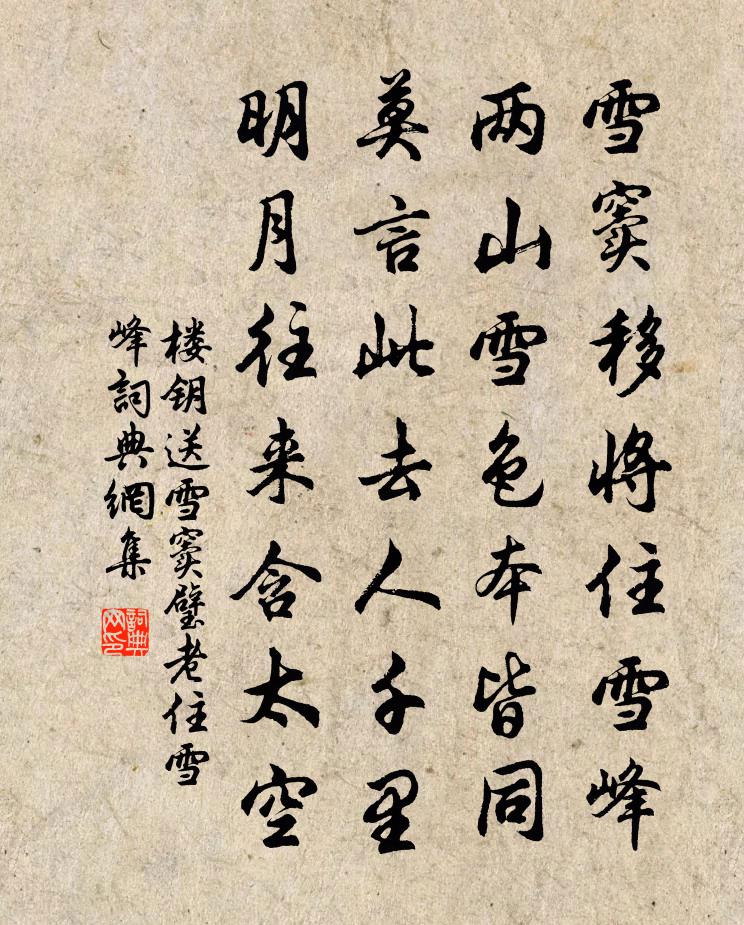 詩詞名句歷史字典書法欣賞書法字典國語詞典說文解字康熙字典古漢語字典標 題 作 者 詩 句 送雪竇璧老住雪峰作者:樓鑰 朝代:宋代送雪竇璧老住雪峰原文雪竇移將住雪峰,兩山雪色本皆同。莫言此去人千里,明月往來含太空。詩詞問答問:送雪竇璧老住雪峰的作者是誰?答:樓鑰問:送雪竇璧老住雪峰寫於哪個朝代?答:宋代樓鑰送雪竇璧老住雪峰書法欣賞送雪竇璧老住雪峰書法作品詩詞推薦懷廬岳舊隱杜荀鶴〔唐代〕一別三年長在夢,夢中時躡石稜層。泉聲入夜方堪聽,山色逢秋始好登。岩鹿慣隨鋤藥叟,溪鷗不怕洗苔僧。人間送靈州李判官杜甫〔唐代〕犬戎腥四海,回首一茫茫。血戰乾坤赤,氛迷日月黃。將軍專策略,幕府盛材良。近賀中興主,神兵動朔方。酬王侍御西陵渡見寄嚴維〔唐代〕前年萬里別,昨日一封書。郢曲西陵渡,秦官使者車。柳塘薰晝日,花水溢春渠。若不嫌雞黍,先令掃弊廬。和韓丞相玉汝登見山閣李復〔宋代〕丹青岌業冠鰲丘,地辟天開洗百憂。萬竅倚空號一噫,八川盤野會千流。浮雲晚日悲余翠,廢苑荒陵怨暮秋。自昔宮詞楊皇后〔宋代〕瑣窗宮漏滴銅壺,午夢驚回落井梧。風遞樂聲來玉宇,日移花影上金鋪。寒園即目詩庾信〔南北朝〕寒園星散居。搖落小村墟。遊仙半壁畫。隱士一床書。子月泉心動。陽爻地氣舒。雪花深數尺。冰床厚尺余。蒼鷹仁義驛中毛滂〔宋代〕騎驢何似賈司倉,行李唯余古錦囊。秋後恰容鷹脫架,春來會有燕投梁。清時無用材雖拙,白日能閒策亦長。慚愧賦太湖石朱復之〔宋代〕寂寂雲根鎖晝扉,綠痕春暖上苔衣。飛來黃鳥忽相問,看了幾年花片飛。九日獨游懷故人張耒〔宋代〕故人分散在天涯,九日登臨獨嘆嗟。人世光陰催日日,鄉閭時節自家家。風煙滿眼臨秋盡,鼓角荒城送日斜。取醉寄上吳王其一李白〔唐代〕淮王愛八公,攜手綠雲中。小子忝枝葉,亦攀丹桂叢。謬以詞賦重,而將枚馬同。何日背淮水,東之觀土風。偈頌二十五釋智遇〔宋代〕天晴蓋卻屋,乘時刈卻禾。輸納皇租了,鼓腹唱謳歌。過秦嶺孟貫〔唐代〕古今傳此嶺,高下勢崢嶸。安得青山路,化為平地行。蒼苔留虎跡,碧樹障溪聲。欲過一回首,踟躕無限情。梅葉茵〔宋代〕疏影幾黃錯,明明野水濱。未風先信息,無雪更精神。一白見真色,萬紅隨後塵。自來共下飲,肺腑盡生春。吳宜之生日以一詩勉之陳著〔宋代〕伍山鍾秀出人龍,頭角崢嶸意氣雄。須著父兄深責望,好從師友細磨礱。始勤卻是終身福,下學方收上達功。它日郡中上元燈減舊例三之二而又迎送使客七首楊萬里〔宋代〕村里風回市里聲,月中人看雪中燈。滿城只道歡猶少,不道譙門冷似冰。下雞鳴山諸灘,望柯山不見三首楊萬里〔宋代〕卻憶歸舟是去年,上灘渾似上青天。諸灘知我懷余怨,急送秋風下水船。州名詩寄道士權德輿〔唐代〕金蘭同道義,瓊簡復芝田。平楚白雲合,幽崖丹桂連。松峰明愛景,石竇納新泉。冀永南山壽,歡隨萬福延。梁民曹以二首為小園木香光寵次韻抒謝林表民〔宋代〕春風珠幰走青虬,清夜西園誰共游。十里水邊渾似雪,喚船應是誤王猷。晚歲白居易〔唐代〕壯歲忽已去,浮榮何足論。身為百口長,官是一州尊。不覺白雙鬢,徒言朱兩轓。病難施郡政,老未答君恩。歲暮至後入城道中雜興十首楊萬里〔宋代〕畦蔬甘似臥沙羊,正為新經幾夜霜。蘆菔過拳菘過膝,北風一路菜羹香。名句推薦夜來南風起,小麥覆隴黃。白居易《觀刈麥》 軍井成而後飲,軍食熟而後飯,軍壘成而後舍,勞佚必以身同之。尉繚《尉繚子·戰威》 行路難!行路難!多歧路,今安在?李白《行路難三首》 何日歸家洗客袍?銀字笙調,心字香燒。蔣捷《一剪梅·舟過吳江》 晨昏滾滾水東流,今古悠悠日西墜。錢福《明日歌》 青青一樹傷心色,曾入幾人離恨中。白居易《青門柳》 西風潑眼山如畫,有黃花休恨無錢。張可久《風入松·九日》 繡帳已闌離別夢,玉爐空裊寂寥香。馮延巳《浣溪沙·春到青門柳色黃》 心病終須心藥治,解鈴還是系鈴人。曹雪芹《紅樓夢·第九十回》 君子慮勝氣,思而後動,論而後行,行必思言之,言之必思復之,思復之必思無悔言,亦可謂慎矣。戴聖《大戴禮記·曾子立事第四十九》