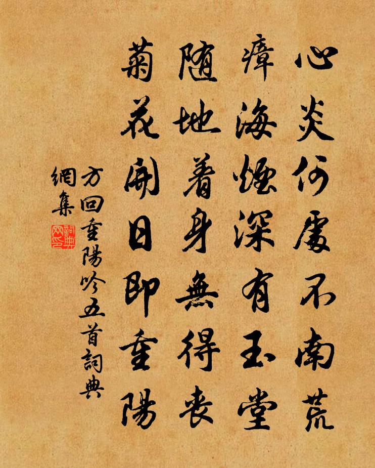 詩詞名句歷史字典書法欣賞書法字典國語詞典說文解字康熙字典古漢語字典標 題 作 者 詩 句 重陽吟五首作者:方回 朝代:宋代重陽吟五首原文心炎何處不南荒,瘴海煙深有玉堂。隨地著身無得喪,菊花開日即重陽。詩詞問答問:重陽吟五首的作者是誰?答:方回問:重陽吟五首寫於哪個朝代?答:宋代方回重陽吟五首書法欣賞重陽吟五首書法作品詩詞推薦以廬山三疊泉寧張宗瑞湯巾〔宋代〕九疊峰頭一道泉,分明來處與雲連。幾人競賞飛流勝,今日方知至味全。鴻漸但嘗唐代水,涪翁不到紹熙年。從茲端午內中帖子詞皇帝閣王珪〔唐代〕采絲纏粽動嘉辰,浴殿風生畫扇輪。拂曉千門放金鑰,玉階還有謝衣人。狀元去春用楊吉州子直韻賦玉蕊詩老誖狼稽奉錢文子〔宋代〕晝攬群芳博物華,夕披眾說聚螢車。花來北固無新唱,詩到西崑有故家。鄉里孝廉流澤遠,弟兄科甲縉紳夸。盍歸塔銘釋如珙〔宋代〕病叟今年六十六,死日將至,火化好,土化好。西堂唯庵貫和尚云:古鄮山中有片荒地,因疊石為塔,為銘曰:天寄舍弟韋莊〔唐代〕每吟富貴他人合,不覺汍瀾又濕衣。萬里日邊鄉樹遠,何年何路得同歸?玉樓春石孝友〔宋代〕春生澤國芳菲早。樓外牆陰聞語笑。東君著意到西園,點破施朱渾未了。楚雲暮合吳天杳。天色沈沈雲擾擾。洞門簾歐陽修〔宋代〕銀蒜鈎簾宛地垂,桂叢烏起上朝暉。枉將玳瑁雕為押,遮掩春堂礙燕歸。再用韻劉宰〔宋代〕綠陽陶令宅,芳草謝家池。開徑應須我,酬君未有詩。既蒙宥罪旋復拜官伏感聖恩竊書鄙意兼奉簡新…等諸公王維〔唐代〕忽蒙漢詔還冠冕,始覺殷王解網羅。日比皇明猶自暗,天齊聖壽未雲多。花迎喜氣皆知笑,鳥識歡心亦解歌。聞道傷故人歌妓長孫佐輔〔唐代〕愁臉無紅衣滿塵,萬家門戶不容身。曾將一笑君前去,誤殺幾多回顧人。三代門夏禹周曇〔唐代〕堯違天孽賴詢謨,頓免洪波浸碧虛。海內生靈微伯禹,盡應隨浪化為魚。四言贈兄秀才入軍詩 其二嵇康〔兩漢〕鴛鴦于飛。嘯侶命儔。朝游高原。夕宿中洲。交頸振翼。容與清流。咀嚼蘭蕙。俛仰優遊。初寒陸游〔宋代〕重簾御晚吹,密瓦護晨霜。焰焰磚爐火,霏霏石鼎香。行遲依木杖,坐久穴藜床。晝亦無聊甚,胡為厭夜長?次韻郭刪定觀潮四絕喻良能〔宋代〕憶昔初為總角兒,年年秋後厭旌旗。只今廓廓渾無事,樽酒何妨樂聖詩。偈頌二十九首釋雲〔宋代〕今朝五月五,擊動禾山鼓。鬱壘與神荼,歡呼齊起舞。題清鏡寺留別陳羽〔唐代〕路入千山愁自知,雪花撩亂壓松枝。世人並道離別苦,誰信山僧輕別離。衡門感舊陸游〔宋代〕蒼煙屯不散,疋素橫郊原。雨細不濕衣,著水始見痕,躊躇意自佳,未遽掩衡門。一一送歸鴉,楓林猶未昏。念昔雨不已方回〔宋代〕空階日夜梅霖滴,滴碎人心未肯休。山郡城沉遙可駭,水鄉田沒更勝憂。民飢盜起關時事,米盡薪殫滯客樓。燕玉見李蘇州示男阿武詩自感成詠白居易〔唐代〕遙羨青雲里,祥鸞正引雛。自憐蒼海畔,老蚌不生珠。次韻仇仁近有懷見寄十首方回〔宋代〕少年忽作白頭人,慷慨悲歌豈為身。屈子獨醒天可問,重華久去士常貧。瓶無儲粟陶元亮,馬似乘船賀季真。此味名句推薦總是向人深處,當時枉道無情陸游《朝中措·代譚德稱作》 此情無計可消除,才下眉頭,卻上心頭。李清照《一剪梅·紅藕香殘玉簟秋》 故園腸斷處,日夜柳條新。宋之問《途中寒食題黃梅臨江驛寄崔融》 半夜倚喬松,不覺滿衣雪。孟郊《苦寒吟》 日星隱曜,山嶽潛形;范仲淹《岳陽樓記》 土膏欲動雨頻催,萬草千花一餉開;范成大《春日田園雜興》 邊雪藏行徑,林風透臥衣。賈島《送鄒明府游靈武》 今日漢宮人,明朝胡地妾。李白《王昭君二首》 撩亂邊愁聽不盡,高高秋月照長城。王昌齡《從軍行七首》 便覺眼前生意滿,東風吹水綠參差。張栻《立春偶成》