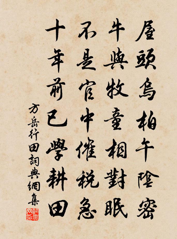 詩詞名句歷史字典書法欣賞書法字典國語詞典說文解字康熙字典古漢語字典標 題 作 者 詩 句 行田作者:方岳 朝代:宋代行田原文屋頭烏柏午陰密,牛與牧童相對眠。不是官中催稅急,十年前已學耕田。詩詞問答問:行田的作者是誰?答:方岳問:行田寫於哪個朝代?答:宋代方岳行田書法欣賞行田書法作品詩詞推薦讀《陰符經》寄鹿門子陸龜蒙〔唐代〕清晨整冠坐,朗詠三百言。備識天地意,獻詞犯乾坤。何事不隱德,降靈生軒轅。口銜造化斧,鑿破機關門。五賊秋夜獨醉戲歸陸游〔宋代〕弊袍羸馬遍天涯,恰似伶優著處家。社瓮嫩醅初泛蟻,寒缸殘燼自成花。幽窗照影烏巾折,醉手題詩淡墨斜。莫恨題三高祠楊友夔〔宋代〕長橋度已盡,有亭枕江湄。常時閉共門,為問居者誰。范蠡其明哲,功成學鴟珍。煙波五湖上,風月一西施。張翰有感姜特立〔宋代〕巍峨廈屋起千間,便作朝廷第一官。幾個得歸仍得老,可憐一世不曾閒。即事劉應時〔宋代〕暖雲芳草媚晴川,花正嬌春柳欲眠。老景侵尋生事拙,舊巢歸燕自相憐。任復齋池中有瑞蓮命予賦之黃庚〔宋代〕芙蕖開處傍池亭,花結雙頭媚晚晴。兩隗駢肩如欲語,二喬並首似含情。同心淨植真奇種,聯蒂騰芳以瑞名。若使送孔周之南海謁王尚書楊衡〔唐代〕泛棹若流萍,桂寒山更青。望雲生碧落,看日下滄溟。潮盡收珠母,沙閒拾翠翎。自趨龍戟下,再為誦芳馨。應劉豫章別詩江淹〔南北朝〕清塵播嶠岫。遠□被修□。□□□□代。高行乃厲天。俗態擥明懋。散□□才賢。裂□□□□。分□□堯甸。於時昌原懷古林景熙〔宋代〕牛頭一星化為石,千仞稜層垂鐵脊。隆隆隱隱佳氣藏,列峰環拱效圭璧。玉棺何代埋雲根,三朝萬乘子復孫。典冊端午帖子皇帝合六首歐陽修〔宋代〕彩索盤中結,楊梅棕里紅。宮闈九重樂,風俗萬方同。邵湘母輓詩朱長文〔唐代〕華屋辭榮養,佳城合舊封,浮生無定相,眾善有遺蹤。家盛金籯在,山長玉案重。浮圖傳勝事,寶殿壯天峰。采菱曲曹勛〔宋代〕修渚通阿閣,蘭舟飾翠旗。吳姬年十五,乘舟 * 池。菱花羞寶靨,皓腕發斜暉。行歌櫂船去,不覺白鷗飛。寄呂英父劉過〔宋代〕清時蕭散坐才疏,收拾窮愁卻著事。詩笑有神通夢寐,丰標不俗更清癯。黃花細雨圖江路,落日西風處士廬。抖擻雜曲歌辭。千秋樂張祜〔唐代〕八月平時花萼樓,萬方同樂奏千秋。傾城人看長竿出,一伎初成妙解愁。萬空歌悟空〔明代〕天也空,地也空,人生渺渺在其中。日也空,月也空,東升西落為誰功?金也空,銀也空,死後何曾在手中!妻也南鄉子(寧都登樓)楊 * 〔宋代〕乘月上高樓。一片清光浩莫收。簾卷好風知客意,颼颼。山自縱橫水自流。卻繞古城頭。塵事匆匆得少休。遙送征送周伯壽赴省二首項安世〔宋代〕陳薛非卿監,趙羅真吏兵。殿中尤給事,館下范先生。六士書難作,千懷子代傾。蒼生底時卿,切莫話歸耕。清明北園泛池舟中作韓維〔宋代〕路繞高林盡,舟篷出近灣。鳥啼青竹影,人對綠波間。野色平當坐,春愁巧作顏。已知湖榭近,飛絮落班班。宮詞宋白〔宋代〕宮棋初罷請銀笙,合曲偏宜鈿面箏。未伏延年花下唱,金錢百萬賞新聲。秋霽白居易〔唐代〕金火不相待,炎涼雨中變。林晴有殘蟬,巢冷無留燕。沉吟卷長簟,惻愴收團扇。向夕稍無泥,閒步青苔院。月出名句推薦政之於民,過急則 刻薄,傷緩則弛慢。令狐德棻《周書·列傳·卷四十五》 黃河曲里沙為岸,白馬津邊柳向城。高適《夜別韋司士》 不用思量今古,俯仰昔人非。蘇軾《八聲甘州·寄參寥子》 酒闌更喜團茶苦,夢斷偏宜瑞腦香。李清照《鷓鴣天·寒日蕭蕭上瑣窗》 酌酒與君君自寬,人情翻覆似波瀾。王維《酌酒與裴迪》 玉人初上木蘭時。懶妝斜立澹春姿。吳文英《浣溪沙·題李中齋舟中梅屏》 寒英坐銷落,何用慰遠客。柳宗元《早梅》 獨在異鄉為異客,每逢佳節倍思親。王維《九月九日憶山東兄弟 / 九月九憶山東兄弟》 一生傲岸苦不諧,恩疏媒勞志多乖。李白《答王十二寒夜獨酌有懷》 數叢沙草群鷗散,萬頃江田一鷺飛。溫庭筠《利州南渡》