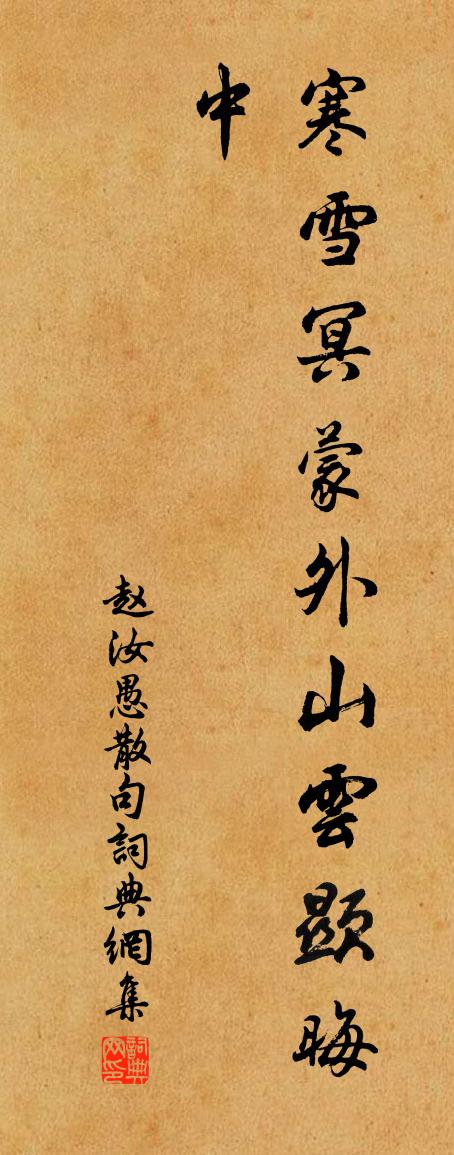 詩詞名句歷史字典書法欣賞書法字典國語詞典說文解字康熙字典古漢語字典標 題 作 者 詩 句 句作者:趙汝愚 朝代:宋代句原文寒雪冥濛外,山雲顯晦中。詩詞問答問:句的作者是誰?答:趙汝愚問:句寫於哪個朝代?答:宋代趙汝愚句書法欣賞句書法作品詩詞推薦戲題羅浮梁彌仙寫真李昴英〔宋代〕八十童顏雙眼明,浪遊湖海一身輕。莫將啖肉先生比,個是羅浮老樹精。柳梢青朱敦儒〔宋代〕水雲照。浮生了了,霜風衰草。日月金梭,江山春夢,天多人少。赤松認得虛空,便一向、飛騰縹緲。直上蓬瀛,七月二十三日南極老人星歌上叔父十三,致政楊萬里〔宋代〕淡溪居士登九齡,朱顏青鬢如後生。橫拖仙人綠玉杖,倒誦上帝黃庭經。璇霄仙籍書姓名,丹霞染誥金花綾。近來送曹機宜度正〔宋代〕溫公早歲侍天章,萬里西來漕益昌。講學於時資友鎮,留題到處著男光。春秋比較年相似,詩禮漸摩日正長。發策和潞公行及白馬寺得留守相公書雲名園例惜好司馬光〔宋代〕雲漢成章湛露晞,都門宴餞羽觴飛。謝安不復東山去,爭似阿衡得謝歸。定風波晁端禮〔宋代〕花倚東風柳弄春。分明淺笑與輕嚬。更憶當時聲細細,偎人。秦箏輕襯砑羅裙。別後此歡誰更共。春夢。只憑胡蝶頌古二十四首釋勝〔宋代〕剜心剖腹繼傳燈,鬼面神頭打葛藤。傑出諸方無等匹,也知只是赴齋僧。月珠寺明月樓程少逸〔宋代〕秀壑陰崖列翠微,光風瑤草日暉暉。林深不放棋聲出,怕觸歸雲作雨飛。太湖盛師仲〔宋代〕霸越功成識慮深,扁舟因起五湖心。若貪富貴如文種,句踐那能肯鑄金。柳條邊納蘭性德〔清代〕是處垣籬防絕塞,角端西來畫疆界。漢使今行虎落中,秦城合築龍荒外。龍荒虎落兩依然,護得當時飲馬泉。若使贈獵騎杜牧〔唐代〕已落雙鵰血尚新,鳴鞭走馬又翻身。憑君莫射南來雁,恐有家書寄遠人。走筆次韻察推見別二篇蘇頌〔宋代〕老愛詩書志益堅,不成魚網謾臨淵。幽居喜見新松菊,病目愁看舊簡編。事任間忙常自適,心忘毀譽敢求全。知君南柯子 再用前韻袁易〔元代〕綠酒忘年友,黃花入幕賓。狂歌鼓腹混堯民。冷笑世間,名利細如塵。二妙真無敵,千篇轉逼人。蛟龍驚避噤無神罷藥白居易〔唐代〕自學坐禪休服藥,從他時復病沉沉。此身不要全強健,強健多生人我心。次韻章禹直魏道輔贈答之詩黃庭堅〔宋代〕我老面倦多故,面心期馬少游。願為春眠面,吐絲自綢繆。翩翩魏公子,閱世無全牛。吹噓鼓萬物,領袖傾九流。夜索熟水甘甚錢時〔宋代〕呼童夜半一杯湯,盎盎天和入肺腸。咽正滑時即揮去,人間此意細思量。和李端叔大夫從參寥子游許昌西湖十絕李廌〔宋代〕股大如腰立已憂,不須登閣始三休。道人尊足元無病,莫取形骸向里求。訴衷情(淵明詩)米友仁〔宋代〕結廬人境羨陶潛。車馬不來喧。勝處自多真趣,飛鳥日相還。心既遠,地仍偏。見南山。手持菊穎,山氣常佳,欲句石延年〔宋代〕幾為物象添詩僻。故僕射司馬文正公輓詞四首張耒〔宋代〕辭爵浮雲外,安民反手中。山林獨往意,袞繡太平功。布被終身儉,貂冠一命崇。他年兩行淚,碑下泣羊公。名句推薦東籬把酒黃昏後,有暗香盈袖。李清照《醉花陰·薄霧濃雲愁永晝》 鳥啼官路靜,花發毀垣空。張繼《清明日自西午橋至瓜岩村有懷》 可憐今夜月,不肯下西廂。王庭筠《絕句·竹影和詩瘦》 綠葉素榮,紛其可喜兮。屈原《九章》 擾擾馬足車塵,被歲月無情,暗消年少。元好問《玉漏遲·詠杯》 人不可以無恥。無恥之恥,無恥矣。孟子《孟子·盡心章句上·第六節》 佳人彩雲里,欲贈隔遠天。李白《折荷有贈》 碧湖湖上柳陰陰,人影澄波浸,常記年時歡花飲。楊果《小桃紅·碧湖湖上柳陰陰》 臨砌影,寒香亂、凍梅藏韻。吳文英《花犯·郭希道送水仙索賦》 有力者疾以助人,有財者勉以分人,有道者勸以教人。墨子《墨子·10章 尚賢(下)》