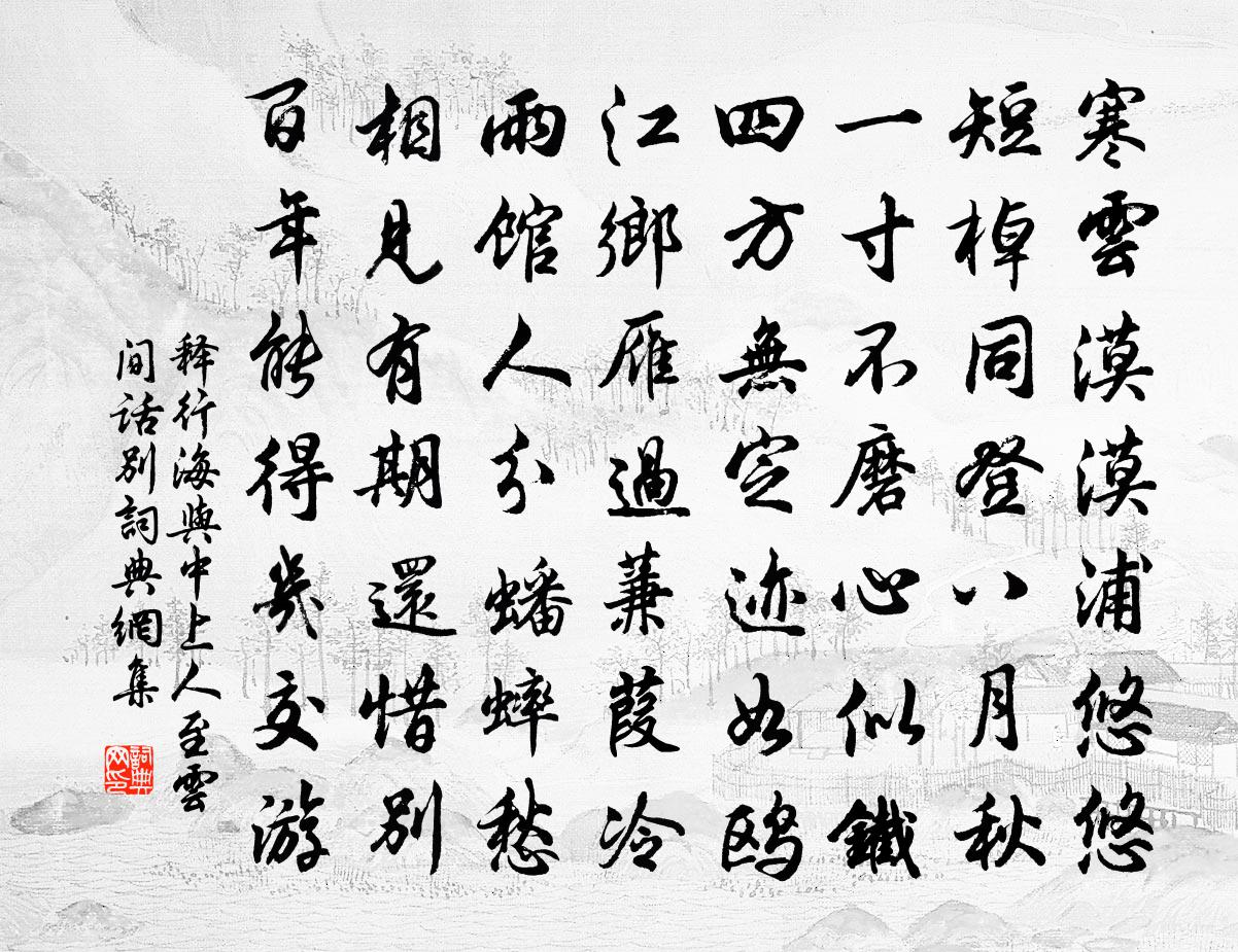 詩詞名句歷史字典書法欣賞書法字典國語詞典說文解字康熙字典古漢語字典標 題 作 者 詩 句 與中上人至雲間話別作者:釋行海 朝代:宋代與中上人至雲間話別原文寒雲漠漠浦悠悠,短棹同登八月秋。一寸不磨心似鐵,四方無定跡如鷗。江鄉雁過蒹葭冷,雨館人分蟠蟀愁。相見有期還惜別,百年能得幾交遊。詩詞問答問:與中上人至雲間話別的作者是誰?答:釋行海問:與中上人至雲間話別寫於哪個朝代?答:宋代釋行海與中上人至雲間話別書法欣賞與中上人至雲間話別書法作品詩詞推薦和韓無咎使君吊李謫仙章甫〔宋代〕力士能令妃子嗔,長安無復謫仙人。宮袍卻換江東酒,野乳終為帝外臣。孤冢道旁空怨結,兩峰煙際自愁顰。騎鯨次韻楊廷秀周必大〔宋代〕傅粉施朱淡復濃,不辭沐雨更梳風。豈知命似佳人薄,不在吾公樂事中。至夜獨酌二絕鄭剛中〔宋代〕一冊韓文酒一杯,居然獨酌興悠哉。夜寒徑醉即就枕,臥待新楊明日來。寄處州季侍御二首趙蕃〔宋代〕已上湘祠請,猶須漢臘期。側聽惟此雁,發興在南枝。貧已長年事,官寧向老為。舊聞煙雨觀,猶擬和公詩。沿江買魚不得詢之則前比我為官船所強取故有姚勉〔宋代〕人間到處有魚羹,我亦扁舟柳下橫。一任官船渠不賣,歸歟膾玉煮深鐺。己未歲暮陸游〔宋代〕七十六年將到時,龍鍾猶復強支持。寒燈照影始知瘦,薄酒作酲方覺衰。春日尚能持冷餅,花時未礙插繁枝。痴頑宣和殿畫水仙鴝鵒圖王冕〔元代〕玉宇瓊樓天窅窅,春融紫禁菸花繞。龍光搖動五色雲,忽覺青蒲生野草。河圖埋沒龍馬藏,上林桑谷一夜長。丹穴詠史上漢高帝八首陳普〔宋代〕一帶陰山浪引弓,運移婚媾一朝通。英雄白首消磨盡,甘與梟雛作婦翁。言法華贊釋師範〔宋代〕褰裳而趨,或然而住。咄咄書空,喃喃獨語。盡語渠儂轉法華,知得身心在何處。向隅韓偓〔唐代〕守道得途遲,中兼遇亂離。剛腸成繞指,玄發轉垂絲。客路少安處,病床無穩時。弟兄訊息絕,獨斂問隅眉。題陳秀才溪山佳趣戴表元〔宋代〕城郭尋尋盡,溪山宛宛來。同誰遷蠟屐,為子破蒼苔。書欲斕斑設,花須爛熳開。趙郎題墨妙,煙霧眼中開。喜晴赴田中曾鞏〔宋代〕自愁雨破西嶺出,只看水緣南澗生。青天忽從樹杪見,白日漸向谷中明。豳公滌場不可失,陶令負禾須自行。歸時郭宣教輓詩魏了翁〔宋代〕趨義古君子,辭榮真丈夫。里門車下澤,子舍騎傳呼。霜柏寒逾勁,庭荊老不枯,典刑今已矣,宰木嘆群烏。三游錢園並題四時畫圖陳起〔宋代〕只因閒未得,又慕得閒名。一幅無盡態,四時有餘情。吟清招鶴伴,機熟付鷗盟。坐久不知晚,前汀煙水橫。題韋隱居西齋(一作題韋處士山居)許渾〔唐代〕劚藥去還歸,家人半掩扉。山風藤子落,溪雨豆花肥。寺遠僧來少,橋危客到稀。不聞砧杵動,應解制荷衣。種蔬二首黎廷瑞〔宋代〕可憐黃觳{觳殳換束},役役秋畦耕。既以謀我飯,又復謀我羹。早暮一束芻,所報良亦輕。飽食輒自媿,悠悠念鳴弦泉釋音可〔清代〕石上懸琴琴醉寒,五更三點是誰彈? 清音流出相思淚,月照風吹竟不乾。山中三首劉應時〔宋代〕始看紅紫上花稍,倏忽春光半已消。最是幽窗斷魂處,杜鵑啼月過山腰。念奴嬌(楊子安侍郎壽)朱敦儒〔宋代〕臘回春近,正日添宮線,香傳梅驛。玉律冰壺此際顯,天與奇才英識。貫日孤忠,凌雲獨志,曾展回天力。功名由占貯橘子葉簡〔宋代〕圓如珠,赤如丹,倘能擘破分喫了,爭不慚愧洞庭山。名句推薦聞說東風亦多情,被竹外、香留住。史達祖《留春令·詠梅花》 月落沙平江似練。望盡蘆花無雁。張炎《清平樂·候蛩淒斷》 昔人已乘黃鶴去,此地空餘黃鶴樓。崔顥《黃鶴樓 / 登黃鶴樓》 古岩泉滴滴,幽谷鳥關關。令狐楚《賦山 / 一七令·山》 雨前初見花間蕊,雨後兼無葉里花。王駕《雨晴》 明日客程還幾許,沾衣況是新寒雨。納蘭性德《蝶戀花·又到綠楊曾折處》 青綾被,莫憶金閨故步晁補之《摸魚兒·東皋寓居》 相思謾然自苦,算雲煙、過眼總成空。戴復古《木蘭花慢·鶯啼啼不盡》 怒不過奪,喜不過予。荀子《荀子·修身》 採桑秦氏女,織錦竇家妻。薛道衡《昔昔鹽》