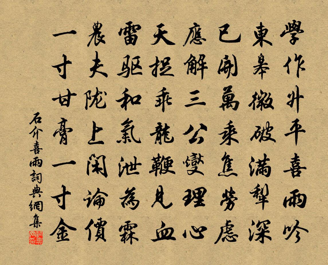 詩詞名句歷史字典書法欣賞書法字典國語詞典說文解字康熙字典古漢語字典標 題 作 者 詩 句 喜雨作者:石介 朝代:宋代喜雨原文學作昇平喜雨吟,東皋微破滿犁深。已開萬乘焦勞慮,應解三公燮理心。天捉乖龍鞭見血,雷驅和氣泄為霖。農夫隴上閒論價,一寸甘膏一寸金。詩詞問答問:喜雨的作者是誰?答:石介問:喜雨寫於哪個朝代?答:宋代石介喜雨書法欣賞喜雨書法作品詩詞推薦贈呂肖卿三首方回〔宋代〕千萬人叢裹,應難一一尋。政須真具眼,始可與關心。匠手斤忘堊,禪機芥遇針。絕弦吾欲理,忽復有知音。婺州屏居蒙右省王拾遺車枉降訪病中延候不得因成寄謝韋莊〔唐代〕三年流落臥漳濱,王粲思家拭淚頻。畫角莫吹殘月夜,病心方憶故園春。自為江上樵蘇客,不識天邊侍從臣。怪得梅花喜神譜大開一十四枝宋伯仁〔宋代〕西施無限愁,後人何必佼。只好笑呵呵,不損紅妝貌。贈別芝麓先生,即用其題《烏絲詞》韻陳維崧〔清代〕四十諸生,落拓長安,公乎念之。正戟門開日,呼余驚座;燭花滅處,目我于思。古說感恩,不如知己,卮酒為公建除體二首答黃魯直教授晁補之〔宋代〕建策移漢都,奉春緣衣布。除地願見公,乃以舍人故。滿船載明月,且復酌清酤。平旦襏襫出,牛羊下來暮。定境木蘭花慢(壽周耐軒府尹)鄧剡〔宋代〕步涼颸綠野,□鐘鼓、□園林。有騎竹更生,扶藜未老,歌舞棠陰。金鞭半橫玉帶,爆神人、風度五雲深。大耐自食薺陸游〔宋代〕日日思歸飽蕨薇,春來薺美忽忘歸。傳夸真欲嫌茶苦,自笑何時得瓠肥?桑圖唐寅〔明代〕桑出羅兮柘出綾,綾羅妝束出娉婷。娉婷紅粉歌金縷,歌與桃花柳絮聽。月下笛(寄仇山村溧陽)張炎〔宋代〕千里行秋,支筇背錦,頓懷清友。殊鄉聚首。愛吟猶自詩瘦。山人不解思猿鶴,笑問我、韋娘在否。記長堤畫舫,木蘭花/玉樓春黃仁榮〔宋代〕監郡風流歡洽。春日雜賦陸游〔宋代〕鬢毛 * 已成霜,此際逢春只自傷。苦雨不容花抵敵,余寒猶賴酒禁當。退紅衣焙薰香冷,古錦詩囊覓句忙。堪笑出郊楊慎〔明代〕高田如樓梯,平田如棋局。白鷺忽飛來,點破秧針綠。再用前韻二首吳潛〔宋代〕不假焦仙把酒噴,須臾澍雨若翻盆。官應可了劭農事,天豈終慳及物恩。無復絕糧憂魯叟,何須進食念王孫。只愁同劉二十八院長述舊言懷感時書事奉寄澧州…贈二君子柳宗元〔唐代〕弱歲游玄圃,先容幸棄瑕。名勞長者記,文許後生夸。鷃翼嘗披隼,蓬心類倚麻。繼酬天祿署,俱尉甸侯家。憲府竹枝歌孫嵩〔宋代〕漢世明妃猶有付,荒祠歌舞與招魂。胡琴好入巴渝曲,萬里還鄉釃酒樽。偈頌七十六首釋子益〔宋代〕覺性中,圓無不融。聞時富貴,見後貧窮。窮則變,變則通,草鞋獰似虎,拄杖活如龍。示報寧長老王安石〔宋代〕白下亭東鳴一牛,山林陂巷淨高秋。新營棗棫我檀越,曾悟布毛誰比丘。用山谷上東坡韻與馮黎州李流謙〔宋代〕賜履聖賢地,專征翰墨場。藜然本非照,昏幽自蒙光。醍醐有真液,檐蔔無別香。座當百尺樓,餘子但廡廊。譽毀變竹枝詞九首之一賀鑄〔宋代〕莫把雕檀楫,江清如可涉。但聞歌竹枝,不見迎桃葉。蓬萊行錢公輔〔宋代〕蓬萊謫居香案吏,此語昔自微之始。後人慷慨慕前芬,高閣雄名由此起。一從圮廢知幾年,棟摧礎斷埋空山。遺蹤名句推薦群芳過後西湖好,狼籍殘紅。歐陽修《採桑子·群芳過後西湖好》 柳色參差掩畫樓,曉鶯啼送滿宮愁。司馬扎《宮怨 / 閨怨》 隋堤上、曾見幾番,拂水飄綿送行色。周邦彥《蘭陵王·柳》 男兒何不帶吳鉤,收取關山五十州。李賀《南園十三首·其五》 知過必改,得能莫忘。周興嗣《千字文·全文》 抽刀斷水水更流,舉杯銷愁愁更愁。李白《宣州謝朓樓餞別校書叔雲 / 陪侍御叔華登樓歌》 背法而治,此任重道遠而無馬、牛,濟大川而無舡、楫也。商鞅《商君書·弱民》 親朋無一字,老病有孤舟。杜甫《登岳陽樓》 群雞正亂叫,客至雞鬥爭。杜甫《羌村三首·其三》 從臣皆半醉,天子正無愁。李商隱《陳後宮》