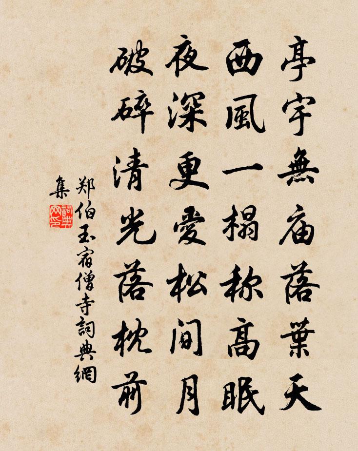 詩詞名句歷史字典書法欣賞書法字典國語詞典說文解字康熙字典古漢語字典標 題 作 者 詩 句 宿僧寺作者:鄭伯玉 朝代:宋代宿僧寺原文亭宇無廟落葉天,西風一榻稱高眠。夜深更愛松間月,破碎清光落枕前。詩詞問答問:宿僧寺的作者是誰?答:鄭伯玉問:宿僧寺寫於哪個朝代?答:宋代鄭伯玉宿僧寺書法欣賞宿僧寺書法作品詩詞推薦謝答吳侍郎惠茶二絕句宋庠〔宋代〕貢焙僧岩各有名,手封奇品更丁寧。衰瓮劇飲雖無分,且喜雲腴伴獨醒。雙槐張耒〔宋代〕老去相看終慘澹,秋來無賴對婆娑。任從葉逐西風去,要聽庭寬夜雨多。簡劉吉父王諶〔宋代〕長安為客者,皆是利名人。只有君同我,惟添病與貧。秋風籬下菊,夜雨水邊蓴。擬共租船去,歸家趁小春。里人俞退翁自號南山南菊逸賞賦詩以道其志繼汪炎昶〔宋代〕山人舊隱南山南,家具惟存賦詩筆。翁浮清醖夜□雲,菊泛寒香秋滿堂。模放已逼東籬真,經營況似南村宅。懶從龍圖閣學士贈銀青光祿大夫滕元發輓辭二首蘇頌〔宋代〕逸氣雄詞昔自將,文場獨立見軒昂。飛騰正近煙霄路,獻納嘗依日月光。去國丹心那易折,臨州惠愛想難忘。蓋棺暑不雜興方岳〔宋代〕白鷗吾有一日雅,疇昔見之相與親。滄浪忽欲從此逝,嗔我手揖無詩人。溫泉朱熹〔宋代〕連山西南來,中斷還崛起。乾霄幾千仞,據地三百里。飛峰上靈秀,眾壑下清美。逮茲勢力窮,猶能出奇偉。誰燃題洪使君詩卷劉克莊〔宋代〕刻於芹泮士爭披,傳到茅廬我竊窺。突過韋郎森戟句,高如柳惲采苹詩。日惟坐嘯熏沉水,間亦搖毫品荔支。況有春詞二首張耒〔宋代〕靄靄芳園誰氏家,朱門橫鎖夕陽斜。鳩鳴鵲噪閒庭館,盡日春風吹百花。送僧妙通游平江萬壽周弼〔宋代〕故鄉離幾日,何處躡秋陵。梵葉床頭樹,唐衣壁面僧。雨花粘舊錫,風籜掃寒簦。新偈期相寄,呵彈破小乘。自春來數夢至閬中蒼溪驛五月十四日又夢作兩陸游〔宋代〕亭皋敗葉先秋霣,城上驚鳥半夜啼。自笑遠遊心未已,年來頻夢到蒼溪。秋日即事三首王之道〔宋代〕挽仰黃花集,澄清九月秋。預愁新任迫,難為故人留。嵐去山光合,江回水氣浮。何當脫羈絆,同辦五湖舟。訴衷情王益〔宋代〕燒殘絳蠟淚成痕。街鼓報黃昏。碧雲又阻來信,廊上月侵門。愁永夜,拂香裀。待誰溫。夢蘭憔悴,擲果淒涼,兩寶禪師見訪貫休〔唐代〕山兄心似我,岸谷亦難交。不見還相憶,來唯添寂寥。茶煙粘衲葉,雲水透蘅茆。因話流年事,斯須不可拋。與客登山徐覲〔宋代〕與客登山去,山陰路未乾。就暄分石坐,隨處帶書看。宿雨添溪闊,春風入袖寒。卻因樵客引,尋得一叢蘭。玉樓春晏幾道〔宋代〕離鸞照罷塵生鏡,幾點吳霜侵綠鬢。琵琶弦上語無憑。芳蔻梢頭春有信。相思拚損朱顏盡,天若多情終欲問。雪窗雍熙享先農六首佚名〔宋代〕新耕展祀,明靈來格。九有駿奔,百司庇職。獻奠肅肅,登降翼翼。祈彼豈穰,福流萬國。廿五兄宣義見招偕諸弟赴新亭宴集即席有作喻良能〔宋代〕瀟灑新亭好,松長桂亦稠。清秋集鴻雁,暇日勸觥籌。既遠含香直,何辭秉燭游。主人情義重,終宴不知休。種麥蒲壽宬〔宋代〕荒林僻左地,時已及來牟。頗學鴉種麥,可憐人代牛。莫言耒耜苦,且願甲兵休。來歲如旋磨,機輪向瀑流。和李校書新題樂府十二首上陽白髮人元稹〔唐代〕天寶年中花鳥使,撩花狎鳥含春思。滿懷墨詔求嬪御,走上高樓半酣醉。醉酣直入卿士家,閨闈不得偷迴避,良人名句推薦燕子斜陽來又去,如此江山。朱彝尊《賣花聲·雨花台》 河水傾潑丈余,雞鳴犬吠滿城中。蒲松齡《地震》 何嘗見明鏡疲於屢照,清流憚於惠風。劉義慶《世說新語·言語》 獨抱影兒眠,背看燈花落。汪懋麟《誤佳期·閨怨》 走馬西來欲到天,辭家見月兩回圓。岑參《磧中作》 喜看稻菽千重浪,遍地英雄下夕煙。 * 《七律·到韶山》 天下傷心處,勞勞送客亭。李白《勞勞亭》 無執滯心,才是通方士;有做作氣,便非本色人。王永彬《圍爐夜話·第八六則》 送數聲驚雁,下離煙水,嘹唳度寒雲。孔夷《南浦·旅懷》 誰道人生無再少?門前流水尚能西!休將白髮唱黃雞。蘇軾《浣溪沙·游蘄水清泉寺》